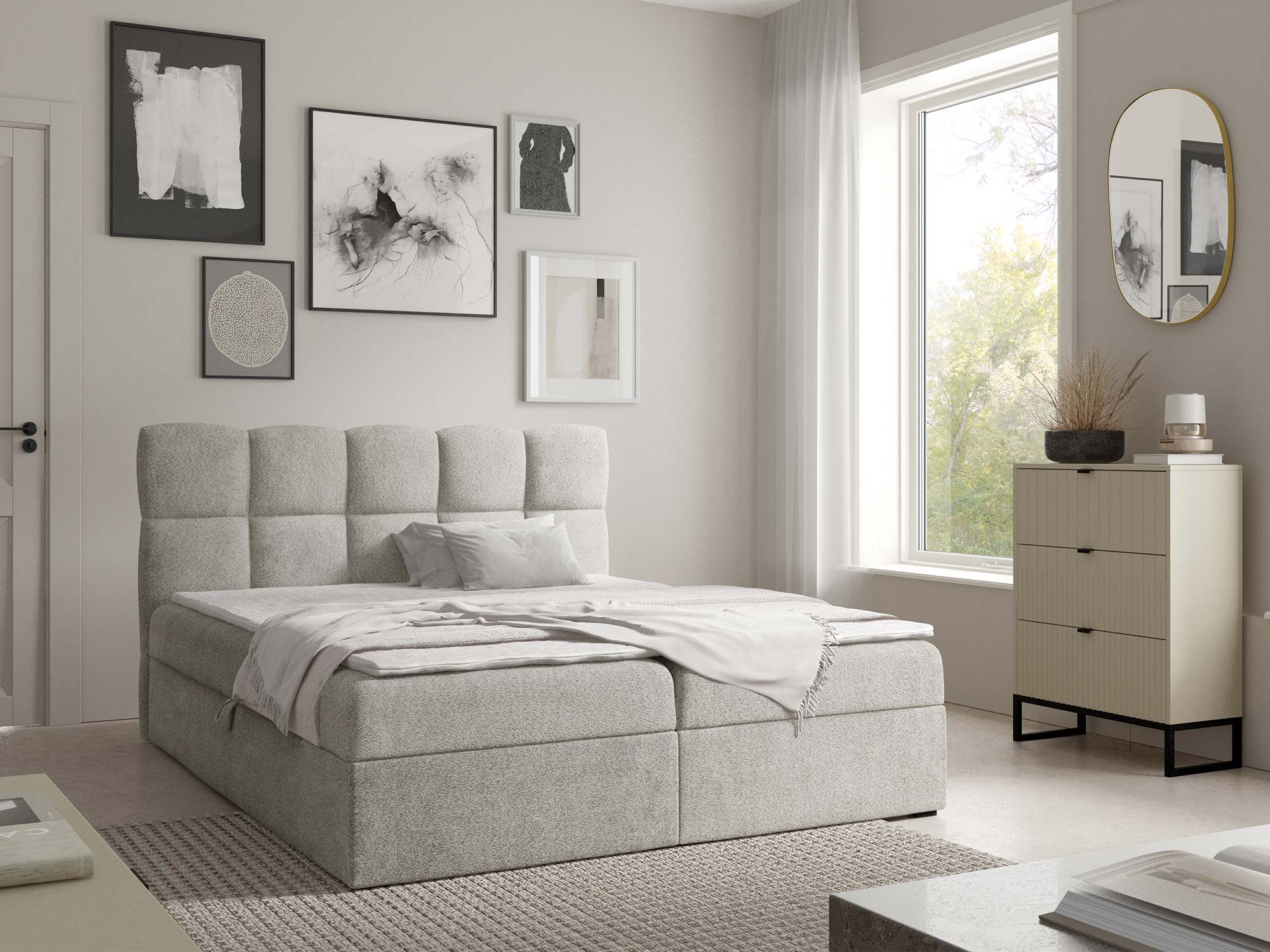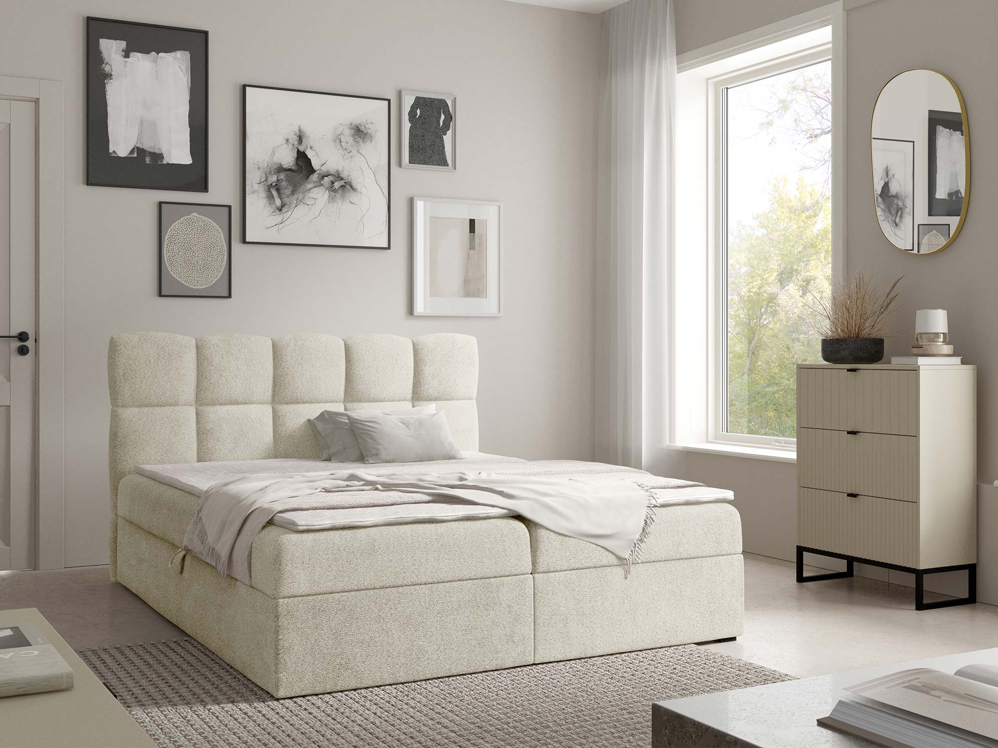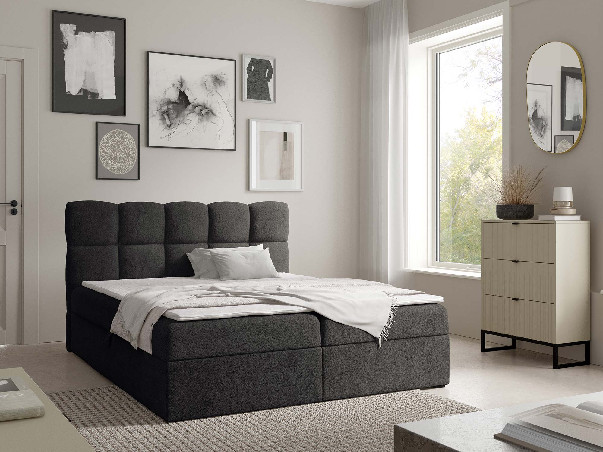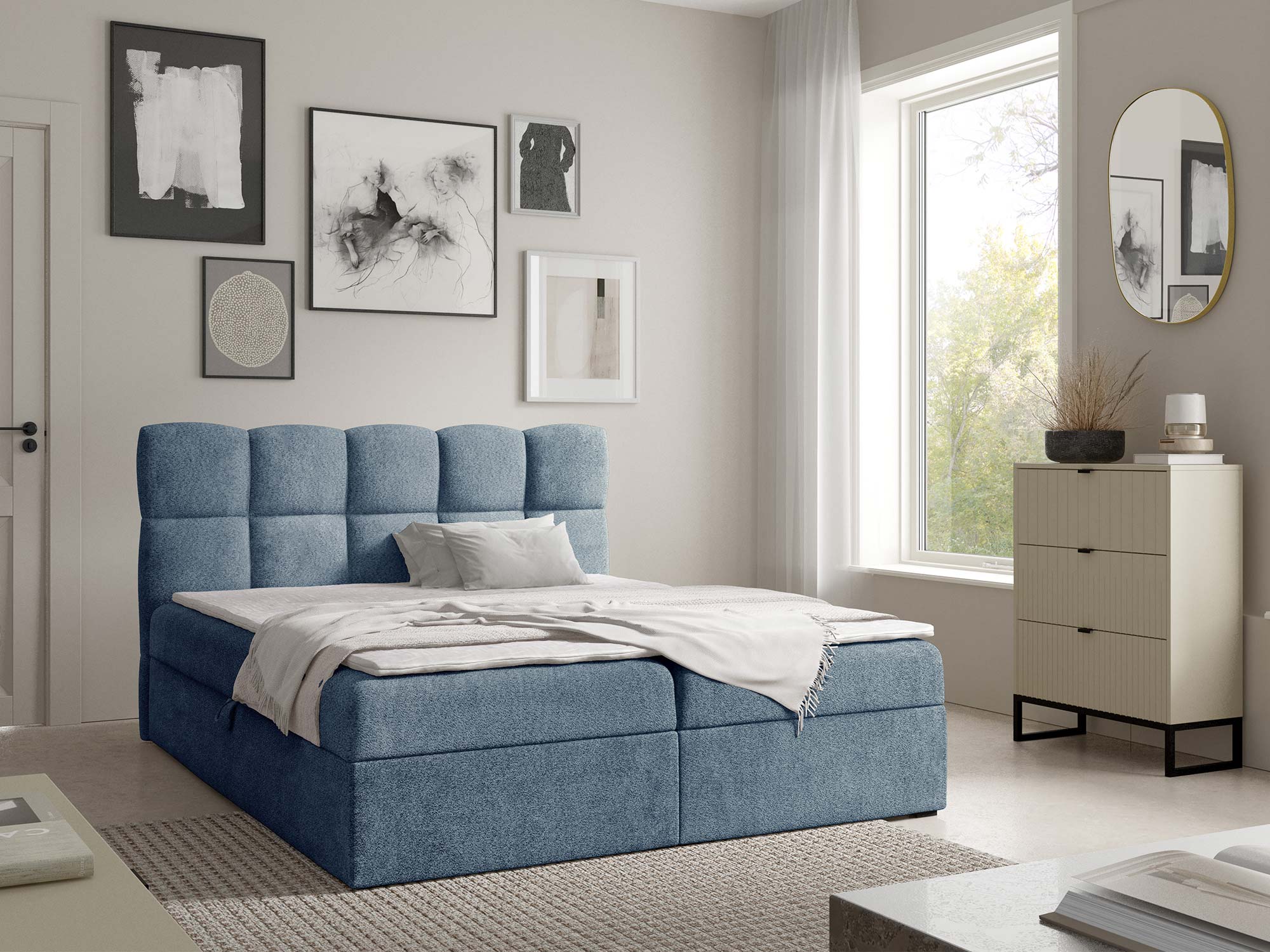 Ogromną zaletą łóżka są dwa pojemniki na pościel. Umieszczone pod powierzchnią spania, stanowią doskonałe miejsce do przechowywania kołder, poduszek, narzut czy sezonowych tekstyliów. Dzięki systemowi sprężynowemu otwieranie pojemników jest niezwykle łatwe – wystarczy lekki ruch, aby zyskać dostęp do praktycznej przestrzeni.