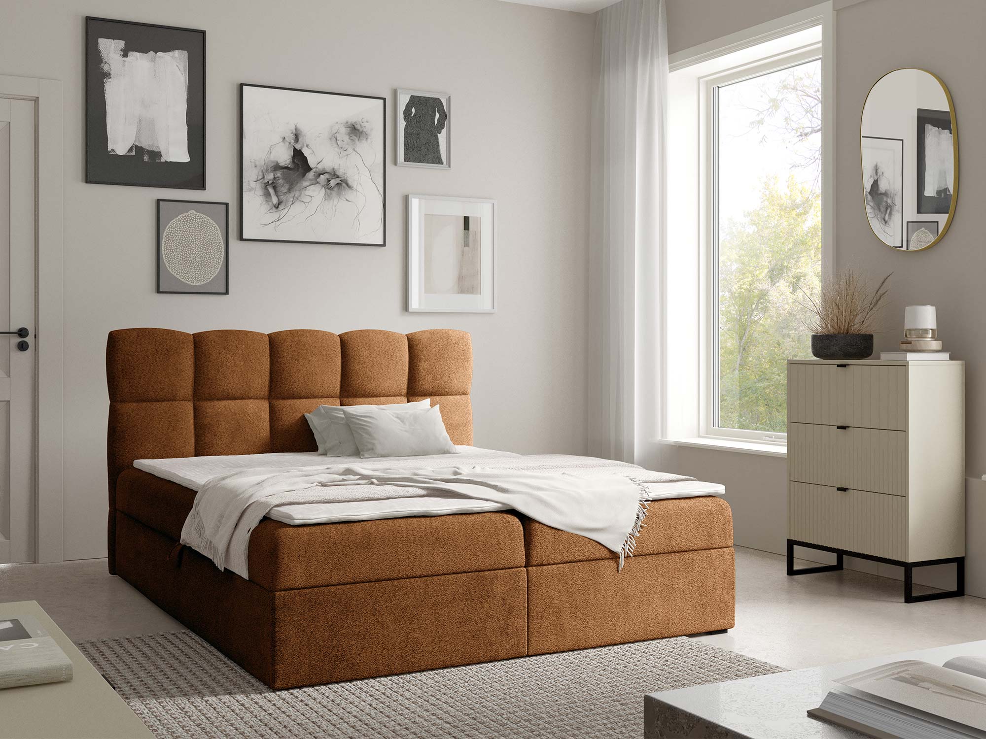 Model wyposażony został w materac sprężynowy typu bonell, który gwarantuje stabilne podparcie i komfort podczas snu. Aby jeszcze bardziej zwiększyć wygodę, do zestawu dołączony jest materac nawierzchniowy (topper) wykonany z pianki T-25 o wysokości 4 cm. To rozwiązanie, które doceni każda kobieta – miękkie, przyjemne w dotyku, a zarazem wspierające zdrowy wypoczynek.
