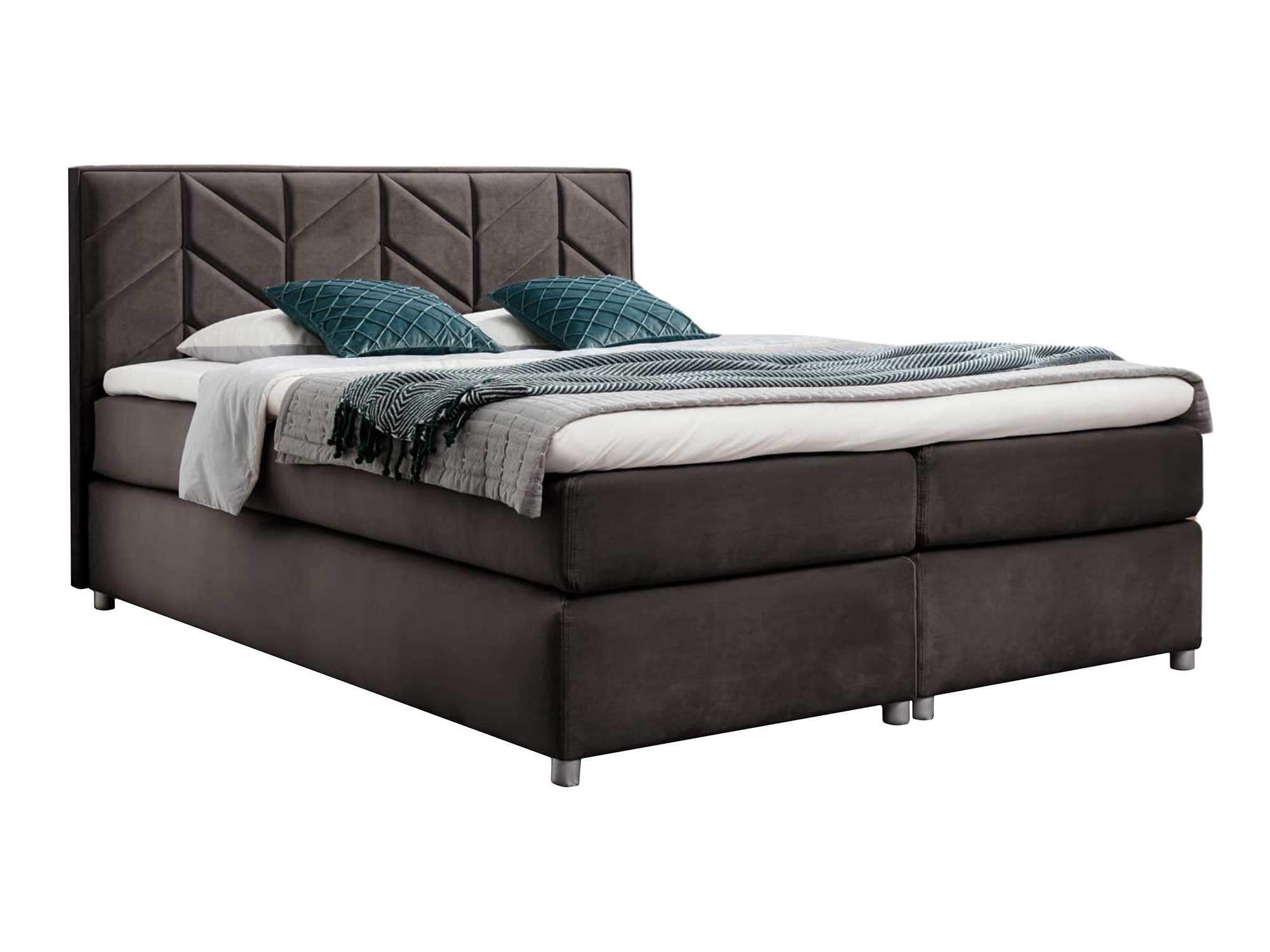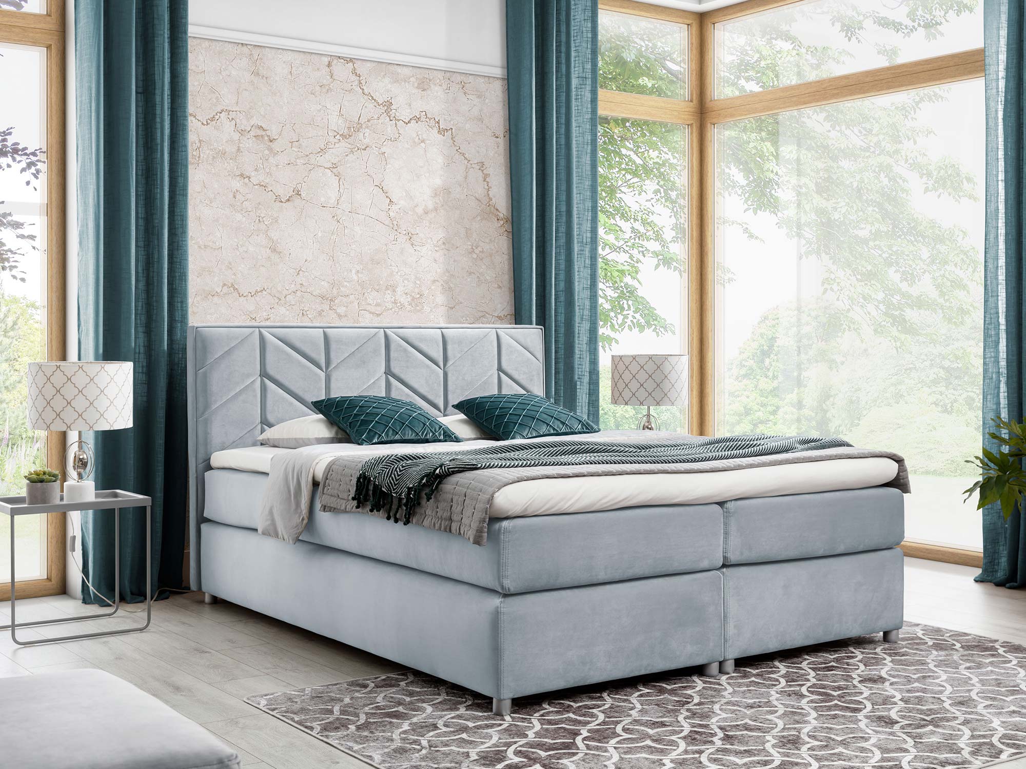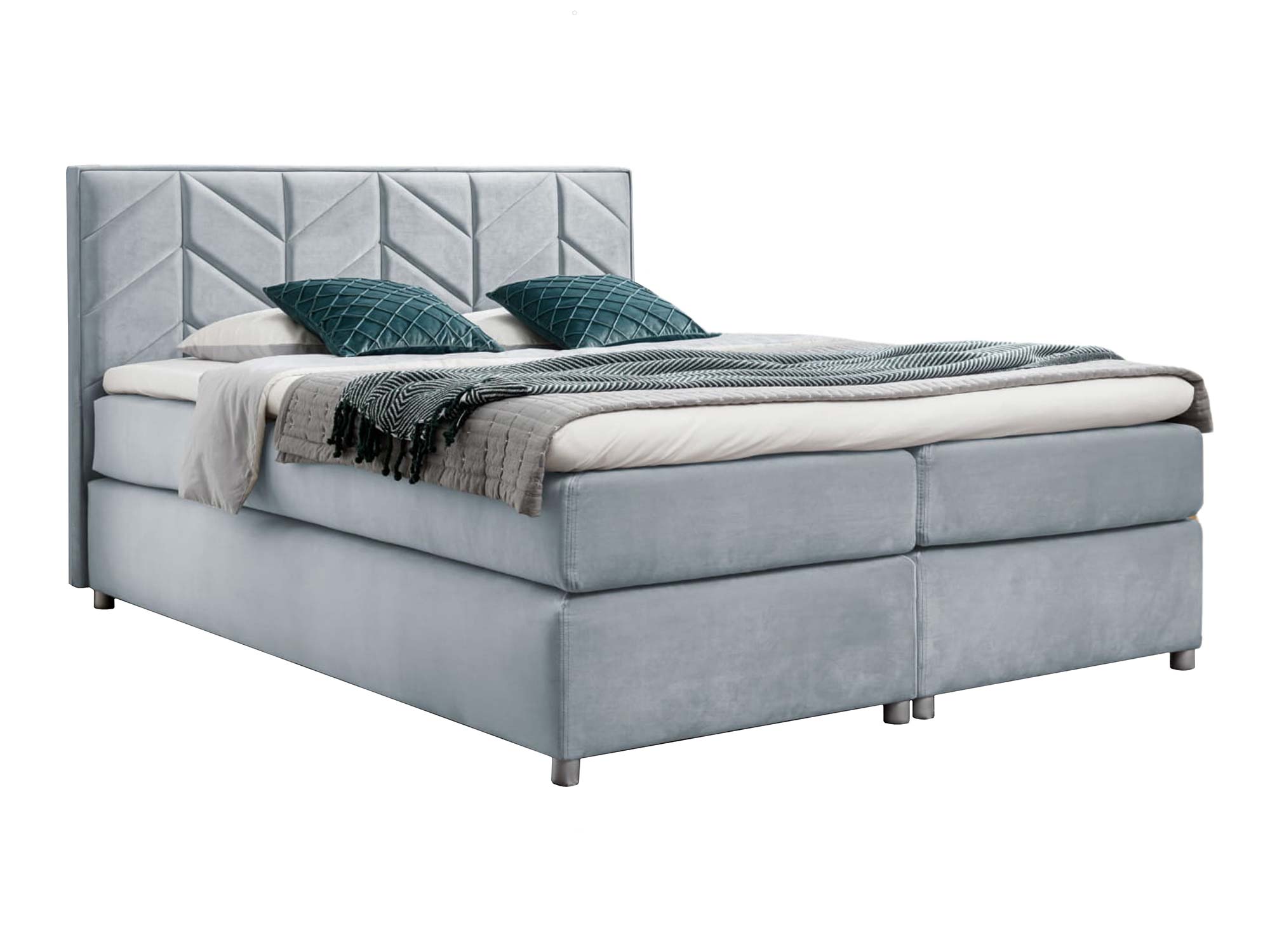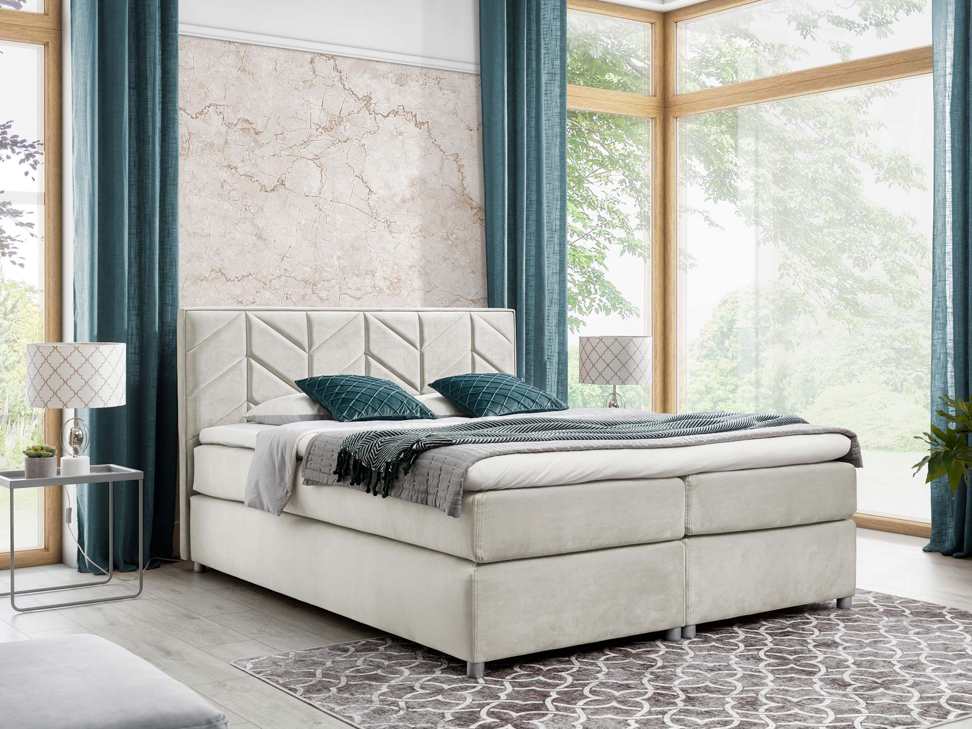 Zagłowie z ozdobnymi przeszyciami pełni nie tylko funkcję dekoracyjną – pozwala także wygodnie oprzeć się podczas wieczornej lektury czy porannej kawy w łóżku. Drewniane nóżki w srebrnym kolorze podkreślają lekkość bryły, a przy tym dodają jej subtelnego blasku. Całość utrzymana jest w eleganckiej, nowoczesnej stylistyce, która sprawi, że Twoja sypialnia będzie wyglądała jak z katalogu wnętrzarskiego.
