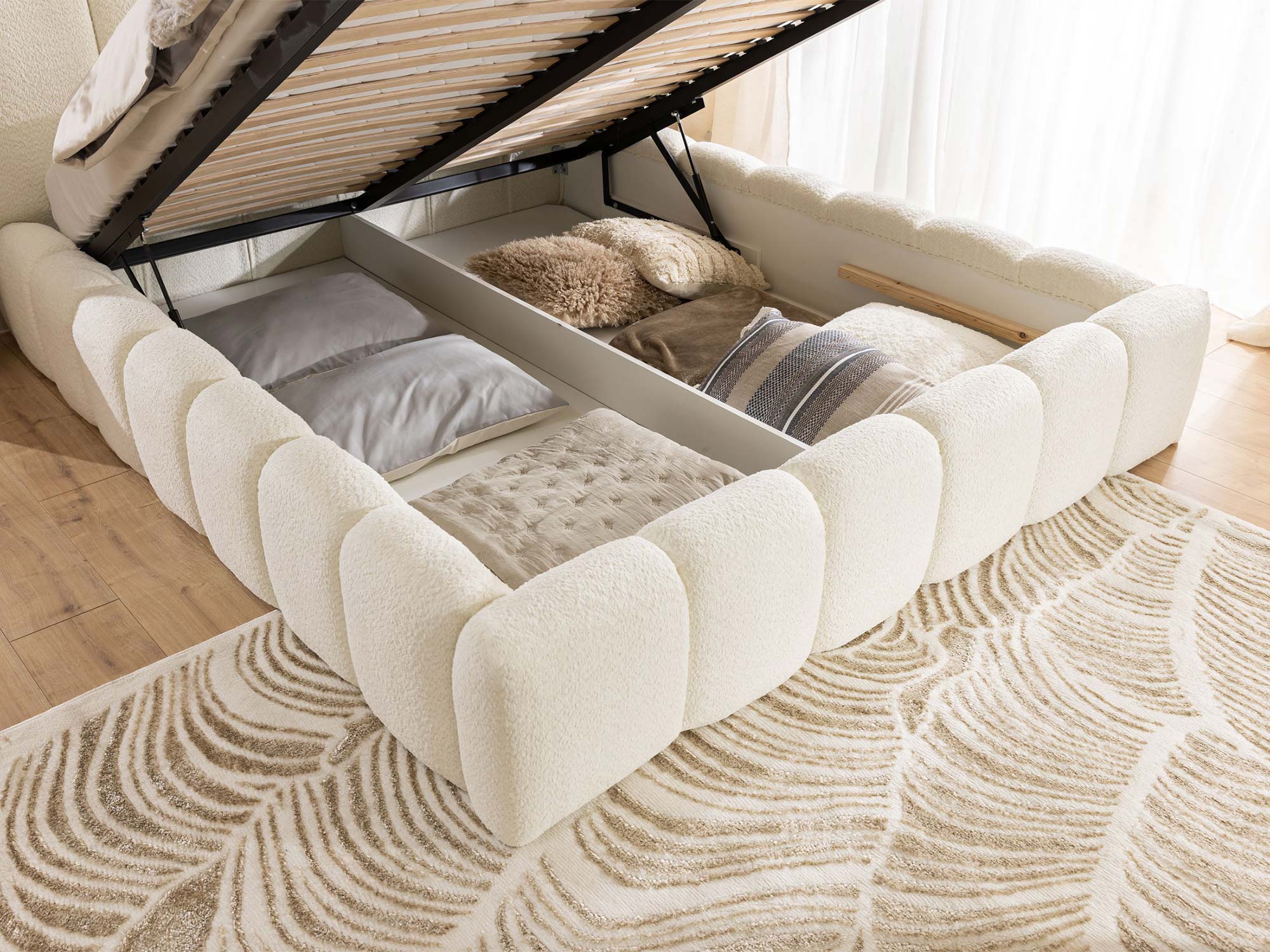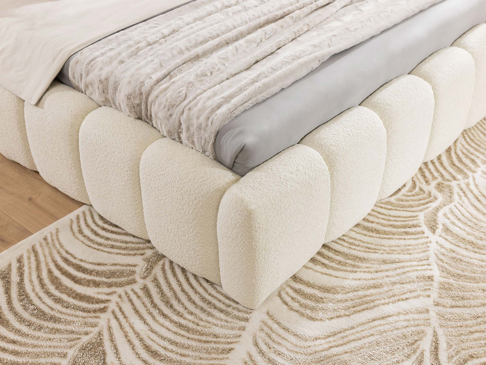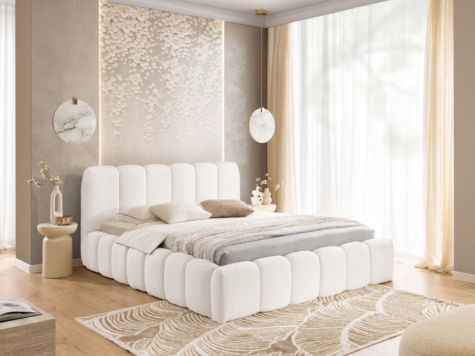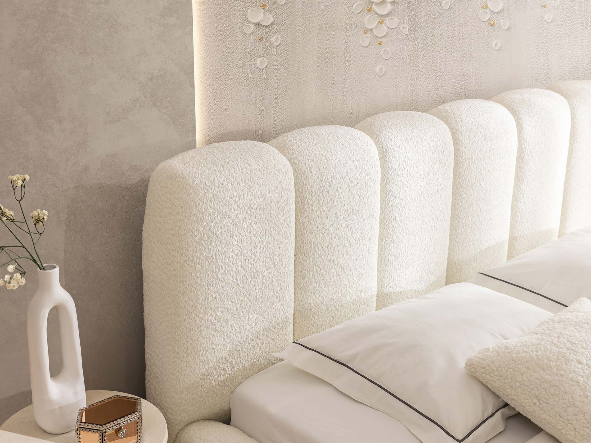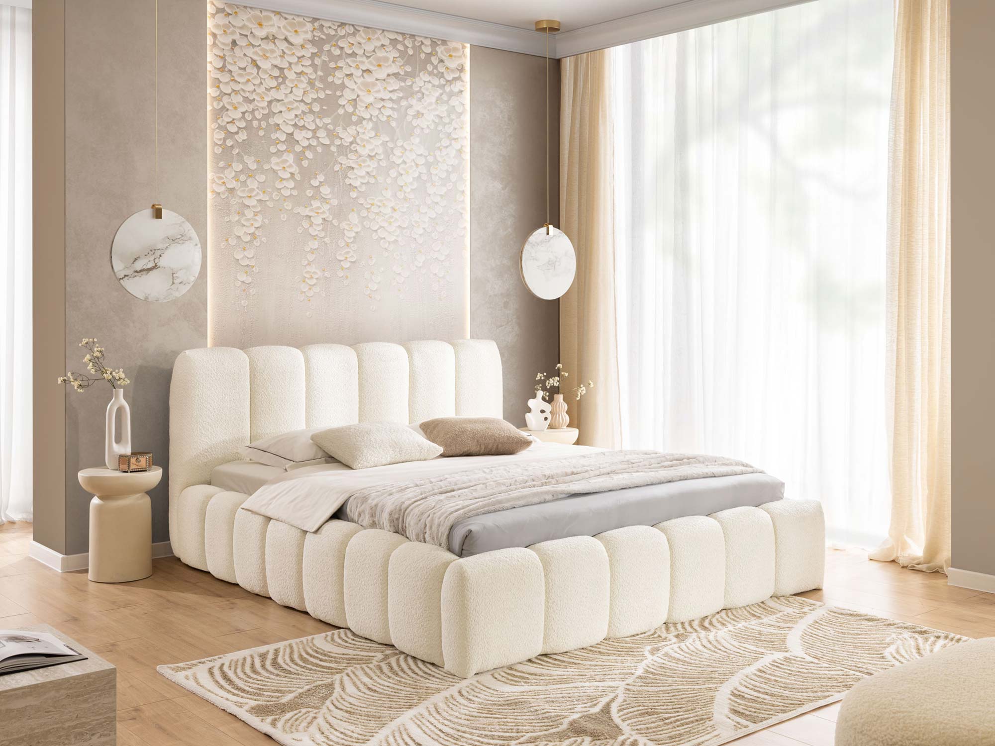 Boucle – tkanina, w której wykonane jest łóżko – to obecnie jeden z najmodniejszych trendów wnętrzarskich. Jej charakterystyczna, miękka struktura sprawia, że wnętrze nabiera przytulności, a całość staje się nie tylko meblem, ale też dekoracją wnętrza. To wybór dla osób, które cenią piękno detali i chcą, aby ich sypialnia była miejscem wyjątkowym.