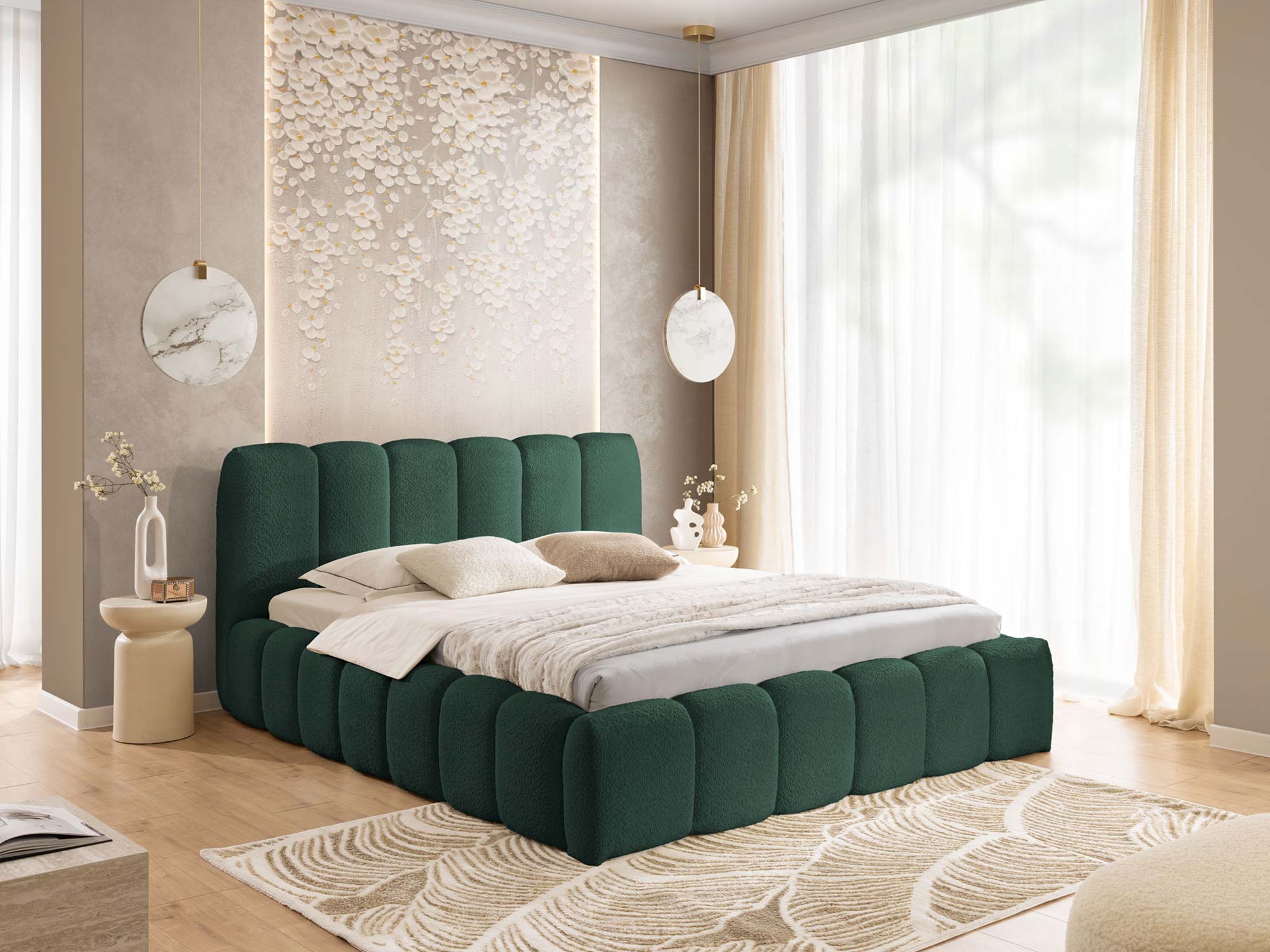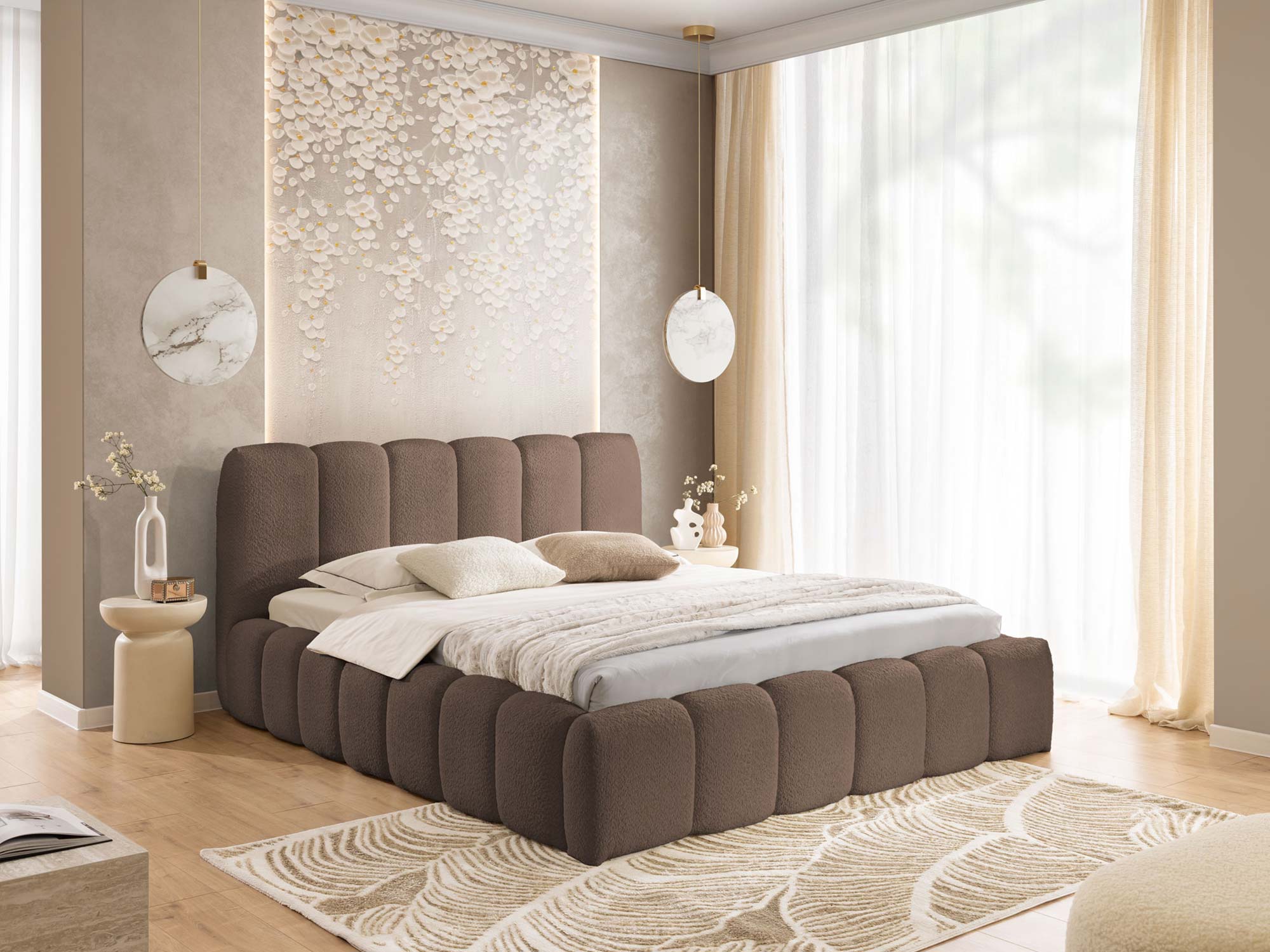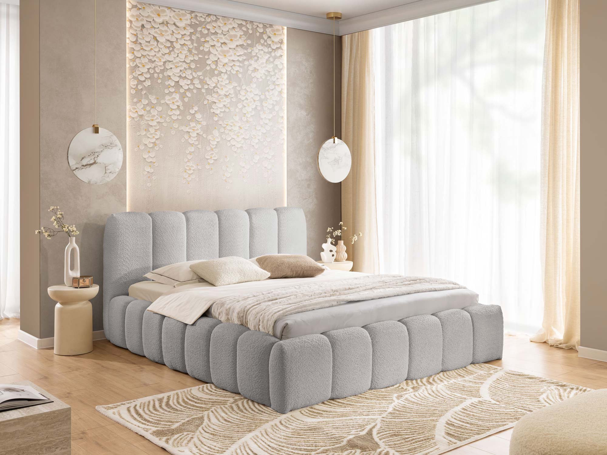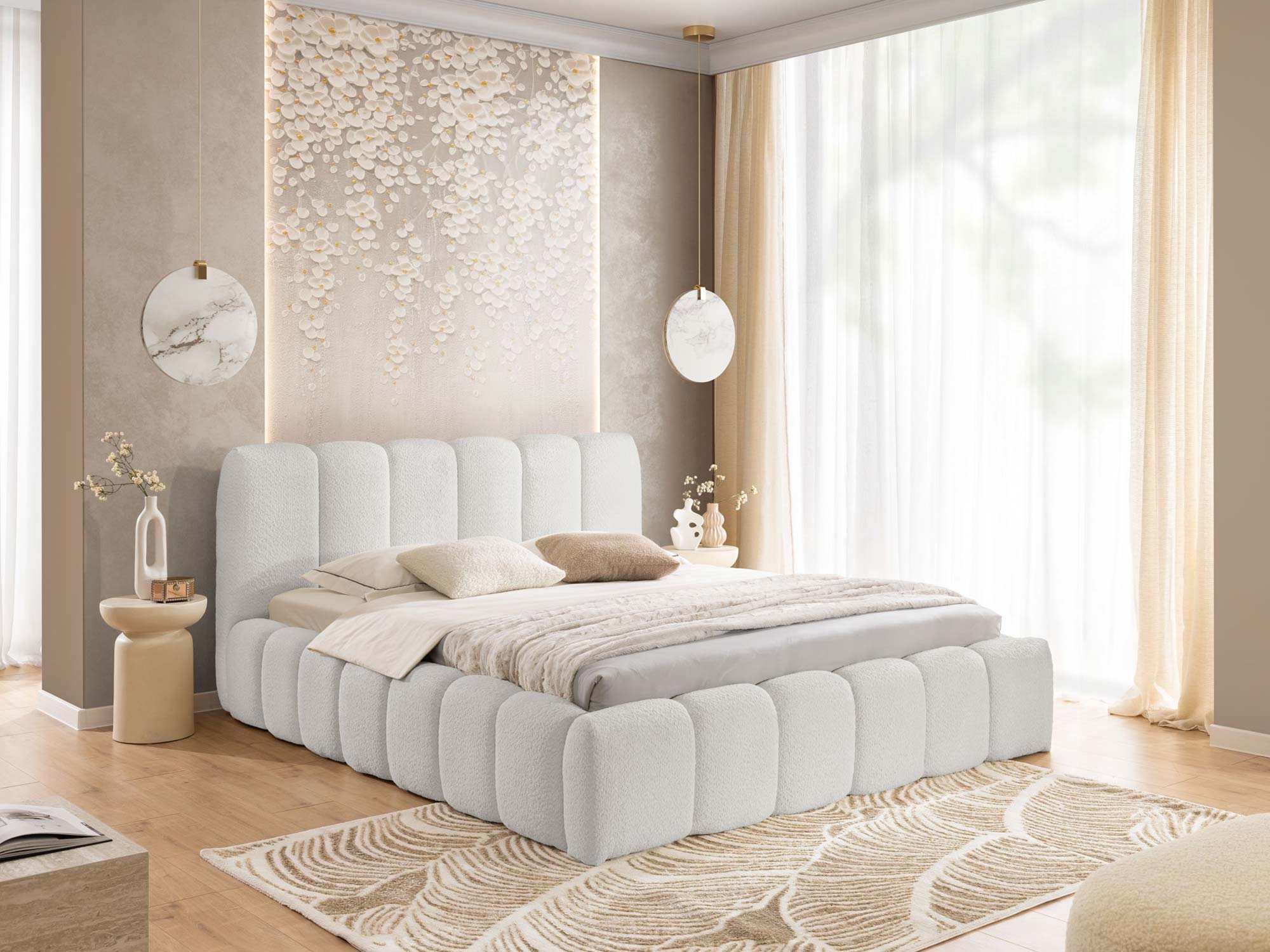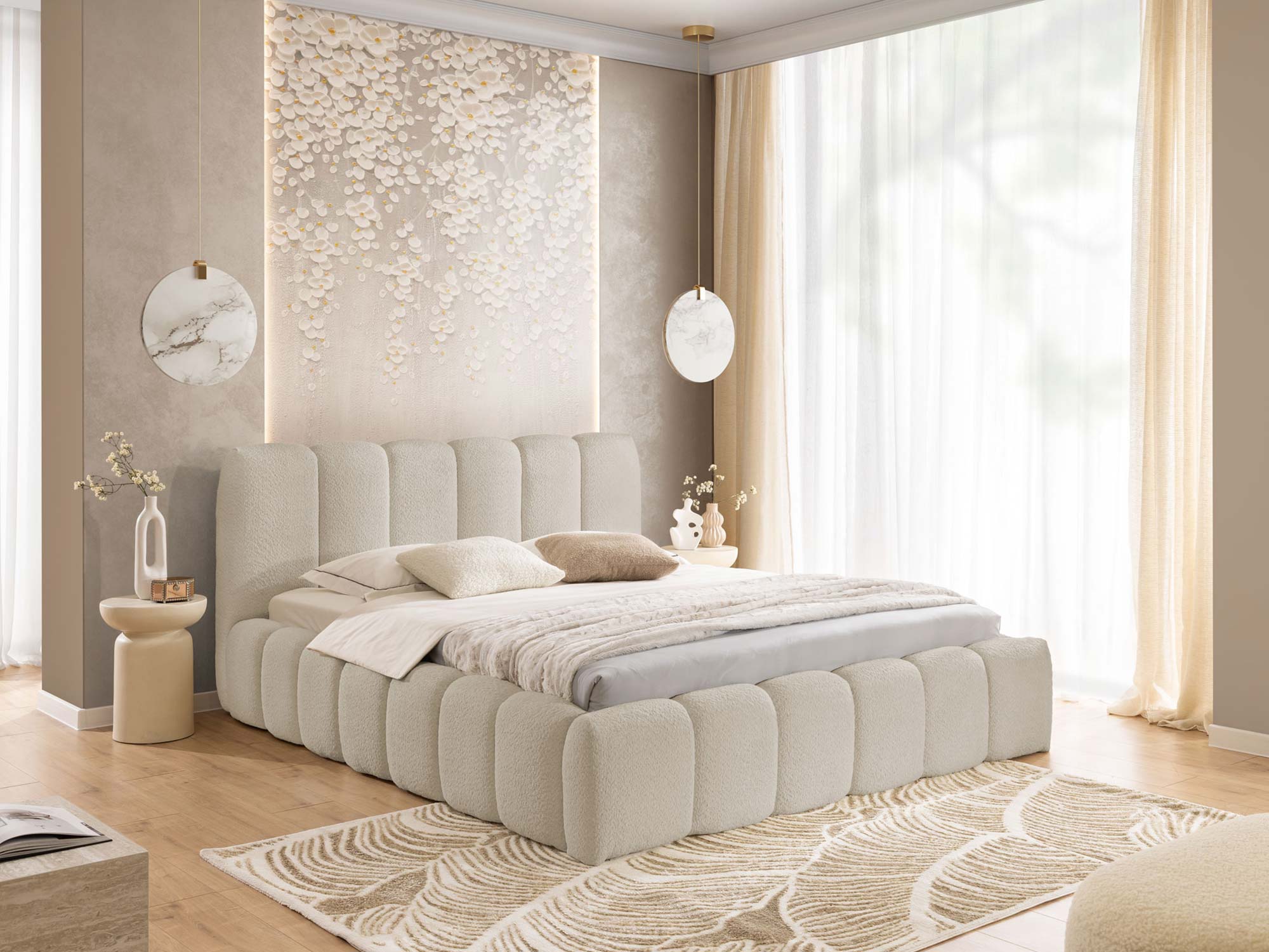 Boucle – tkanina, w której wykonane jest łóżko – to obecnie jeden z najmodniejszych trendów wnętrzarskich. Jej charakterystyczna, miękka struktura sprawia, że wnętrze nabiera przytulności, a całość staje się nie tylko meblem, ale też dekoracją wnętrza. To wybór dla osób, które cenią piękno detali i chcą, aby ich sypialnia była miejscem wyjątkowym.