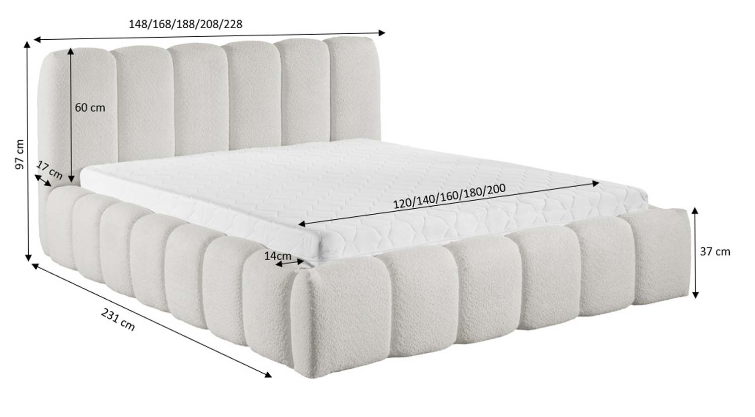- Łóżko 140×200: wys. zagłowia 97 cm, szer. 168 cm, dł. 231 cm, wys. spania 37 cm, waga 121 kg