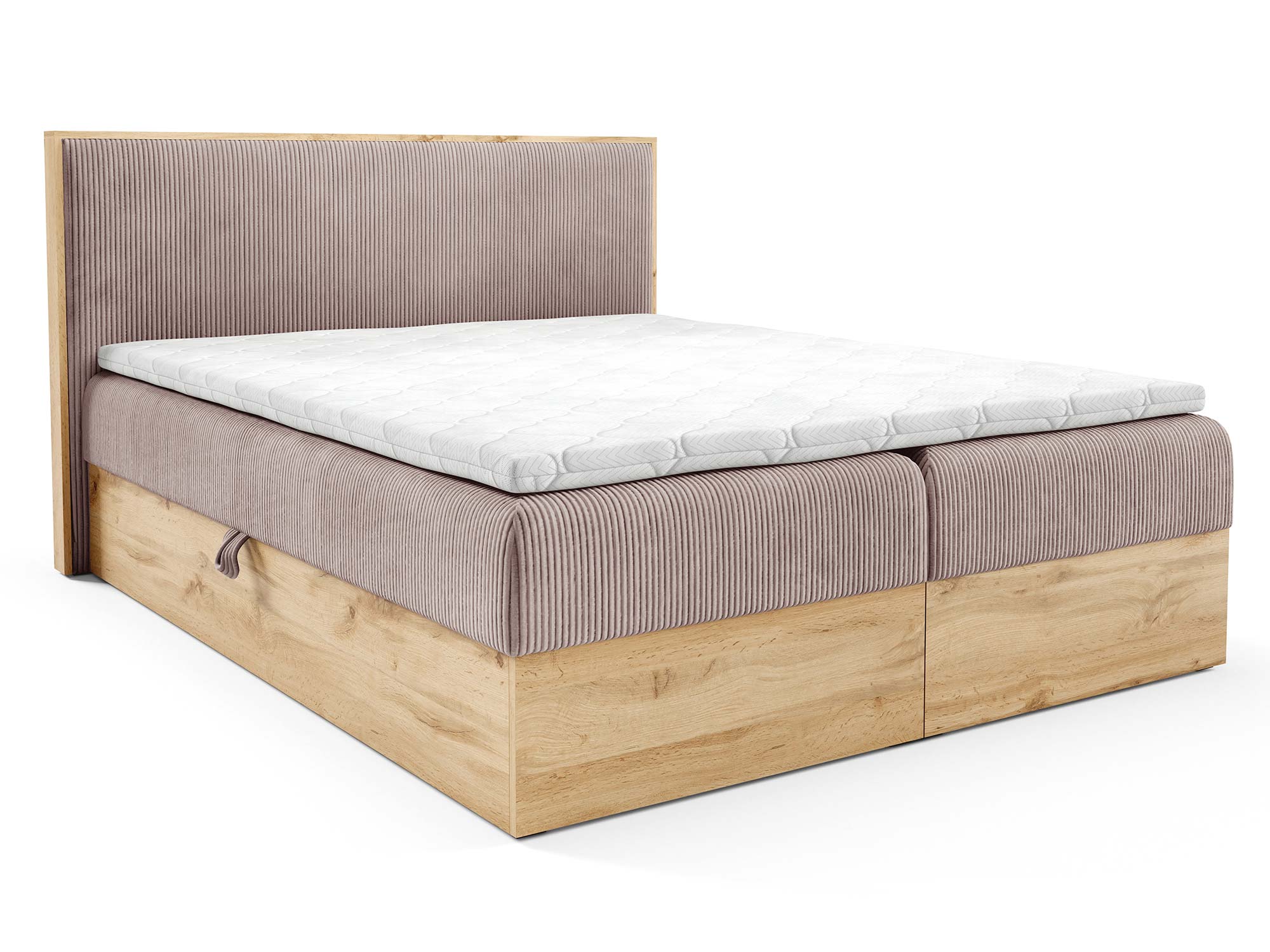Łóżko Mizon 11 zostało stworzone z myślą o kobietach, które cenią piękno, komfort i funkcjonalność w jednym. Jego konstrukcja opiera się na solidnej ramie ze skrzyniami wykonanymi z płyty laminowanej w kolorze dąb sonoma, co nadaje całości elegancji i trwałości. Brak klasycznych nóżek zastąpiono subtelnymi ślizgami plastikowymi, które sprawiają, że mebel prezentuje się lekko i nowocześnie.