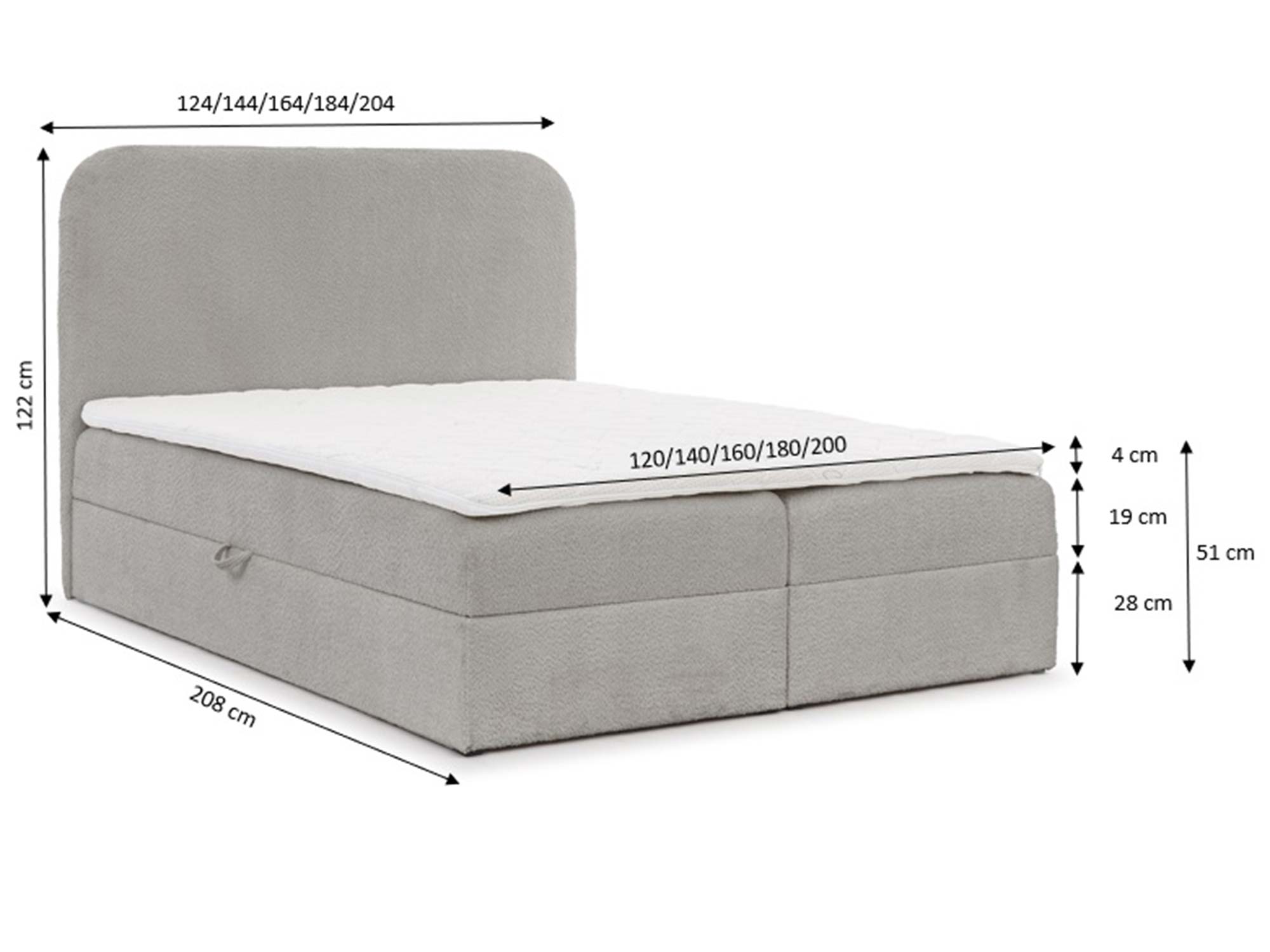 - Łóżko 180×200: wys. zagłowia 122 cm, szer. 184 cm, dł. 208 cm, wys. spania 51 cm, waga 125 kg