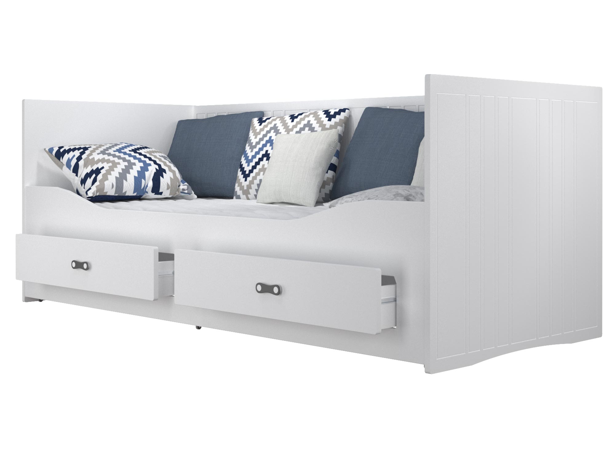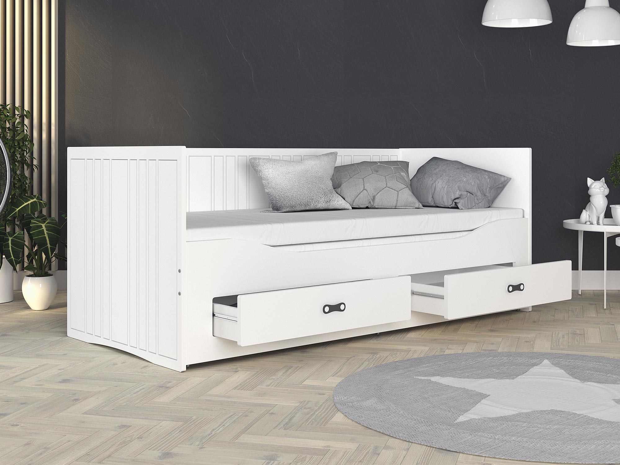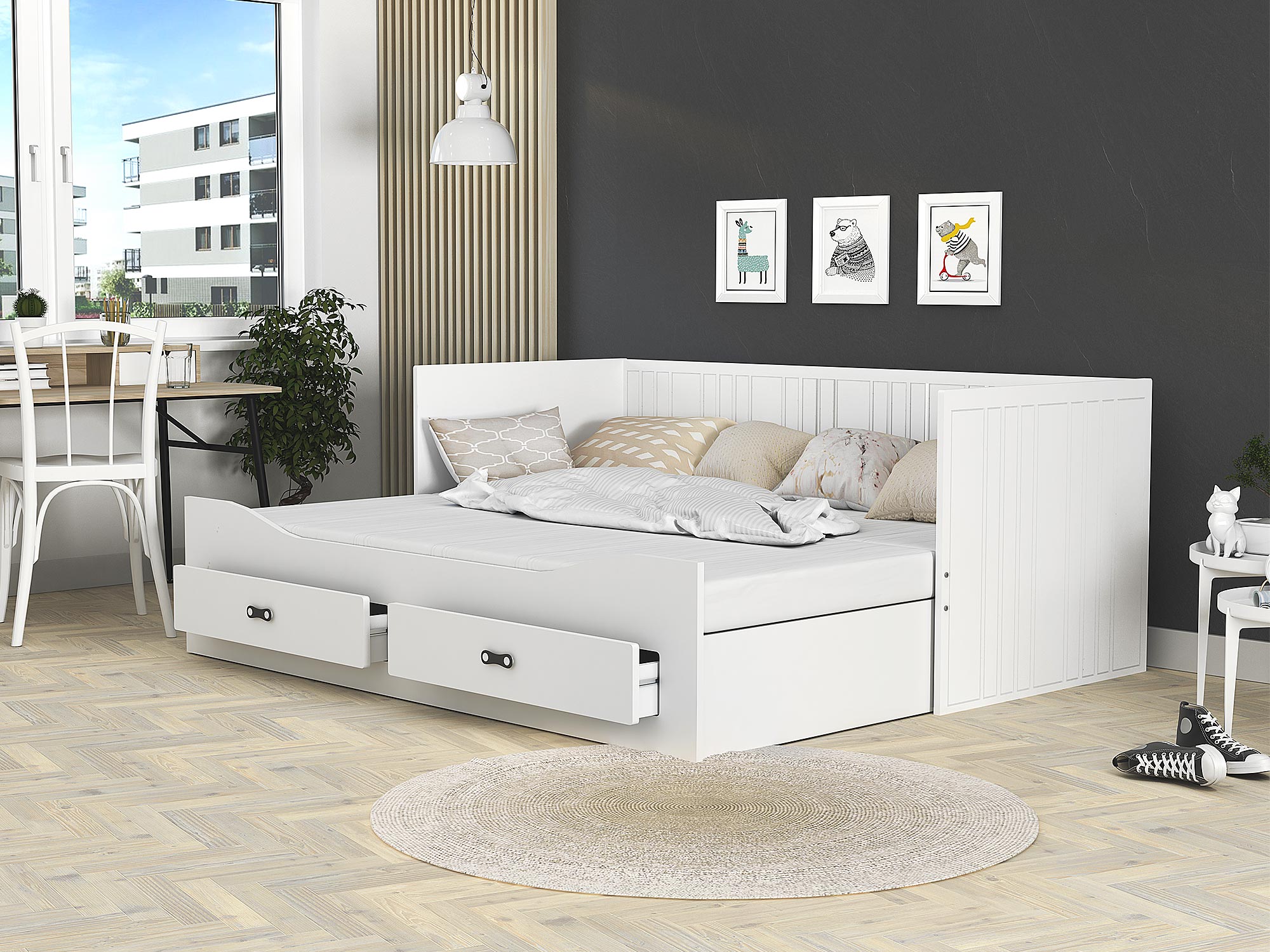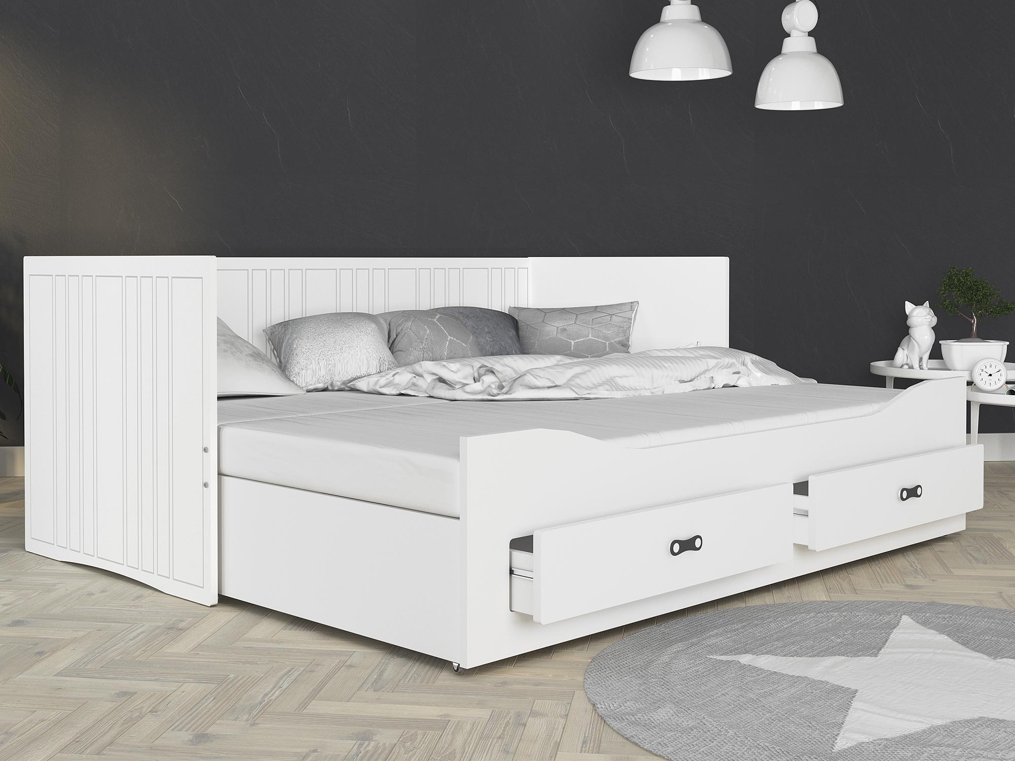 Białe łóżko z wysokim oparciem, szufladami i dekoracyjnymi ramkami