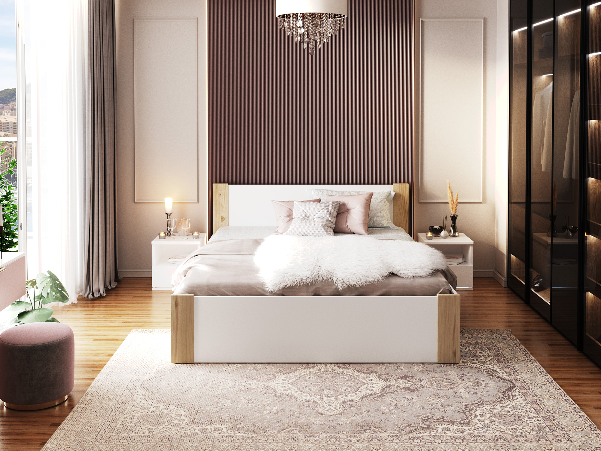 Łóżko małżeńskie Corner to synonim elegancji i funkcjonalności. Wykonane z wysokiej jakości płyty meblowej oraz wykończone naturalnym drewnem sosnowym, łączy w sobie klasykę z nowoczesnym podejściem do designu. Całość pokryto nietoksycznym, wodnym lakierem, który nie tylko podkreśla piękno drewna, ale również zapewnia bezpieczeństwo i trwałość koloru na lata.
