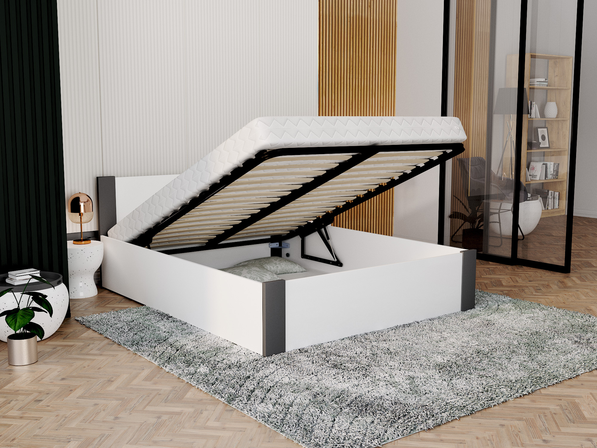 - Stelaż metalowy podnoszony z pojemnikiem – doskonałe rozwiązanie do mniejszych mieszkań i sypialni, w których liczy się każdy centymetr. Dzięki pojemnikowi zyskujesz dodatkowe miejsce na przechowywanie pościeli, koców czy sezonowych ubrań.