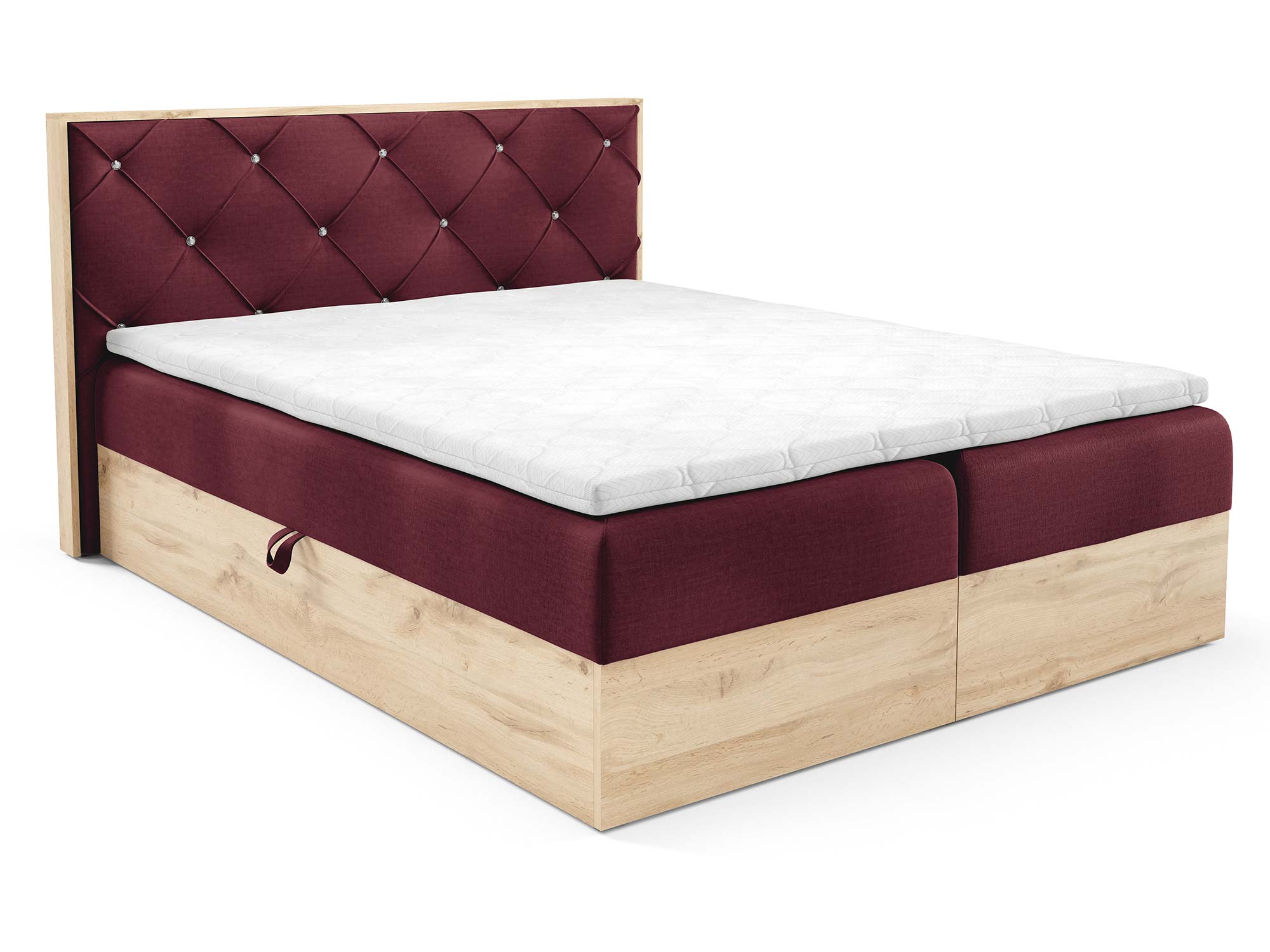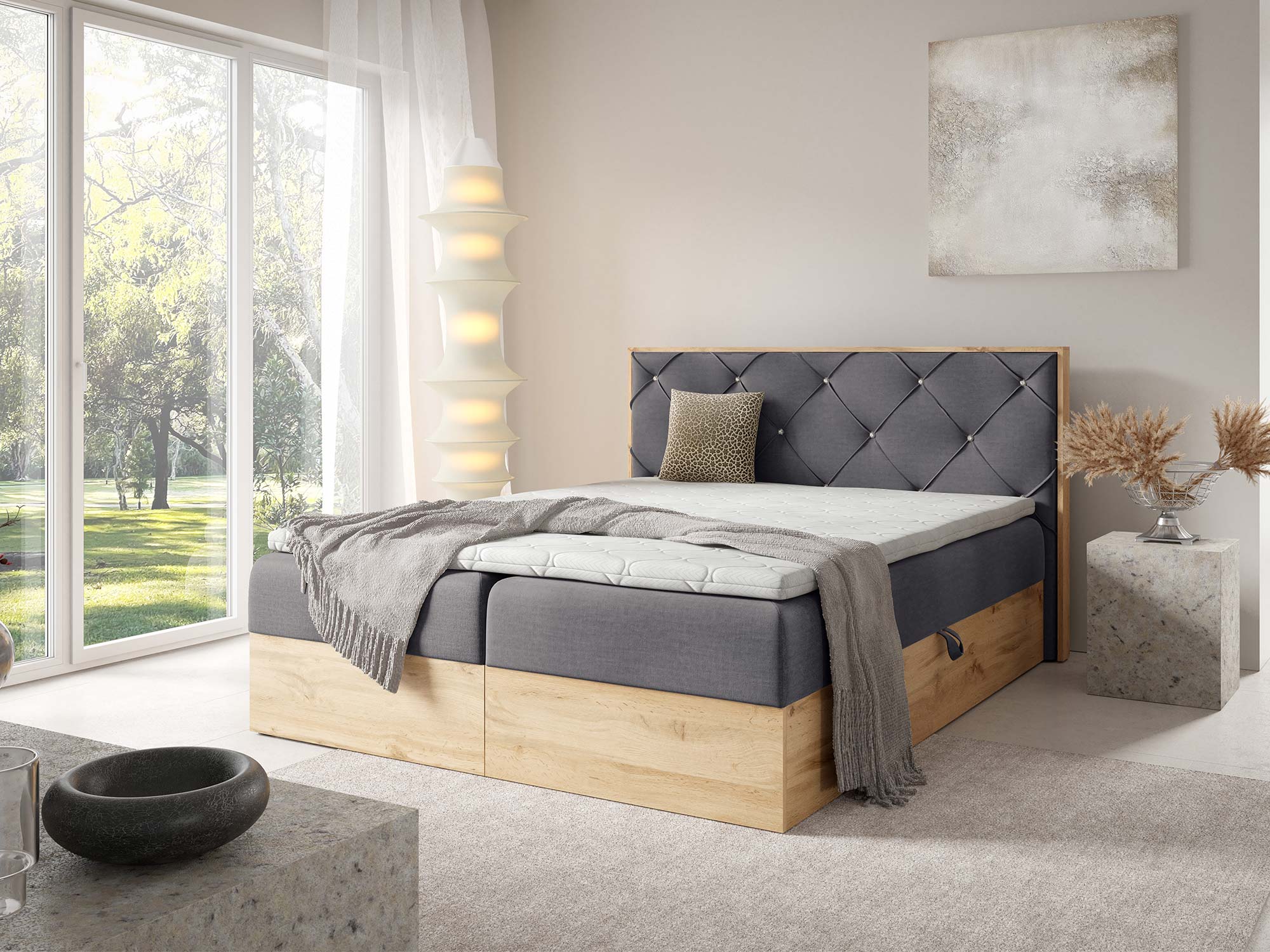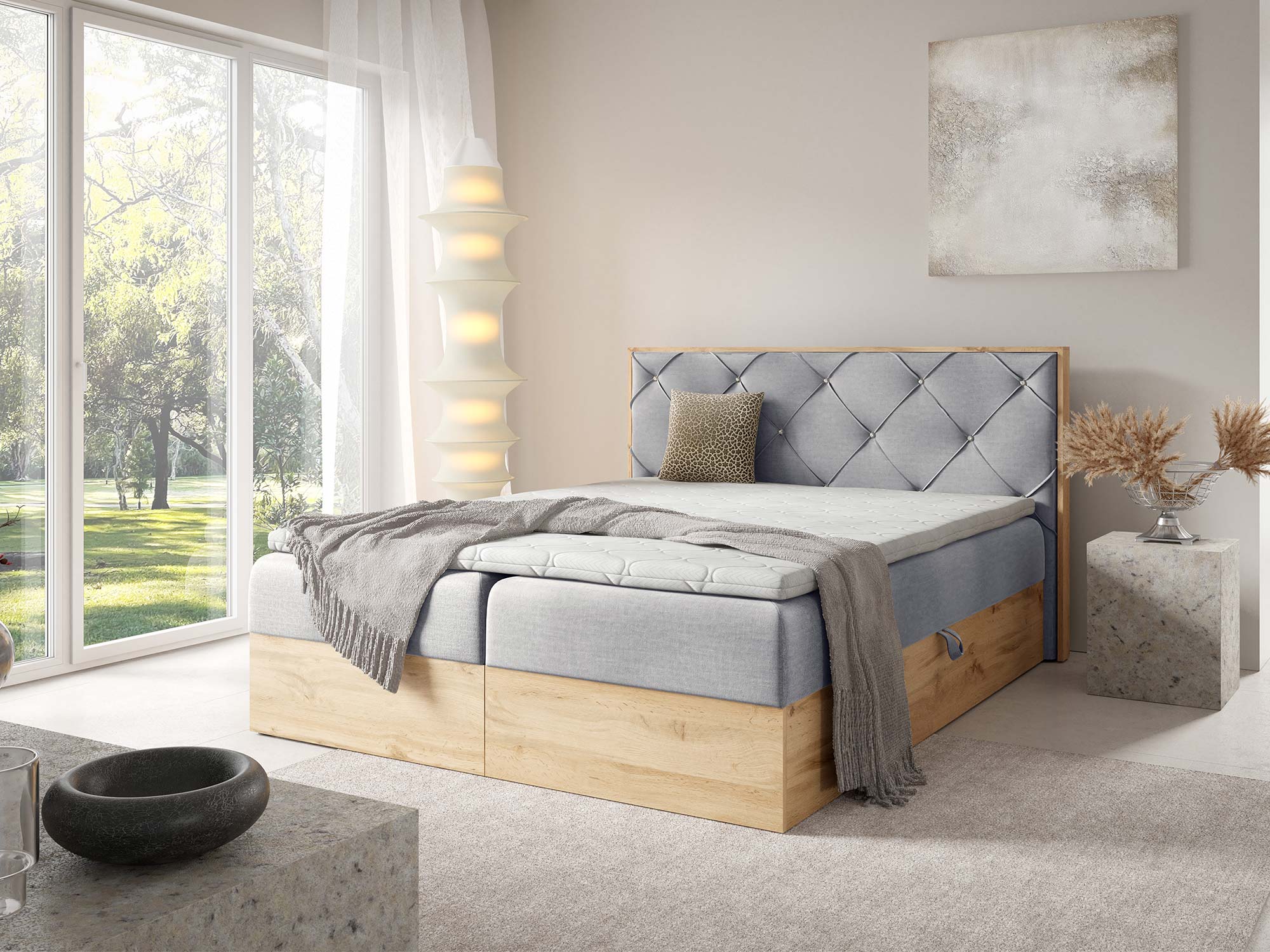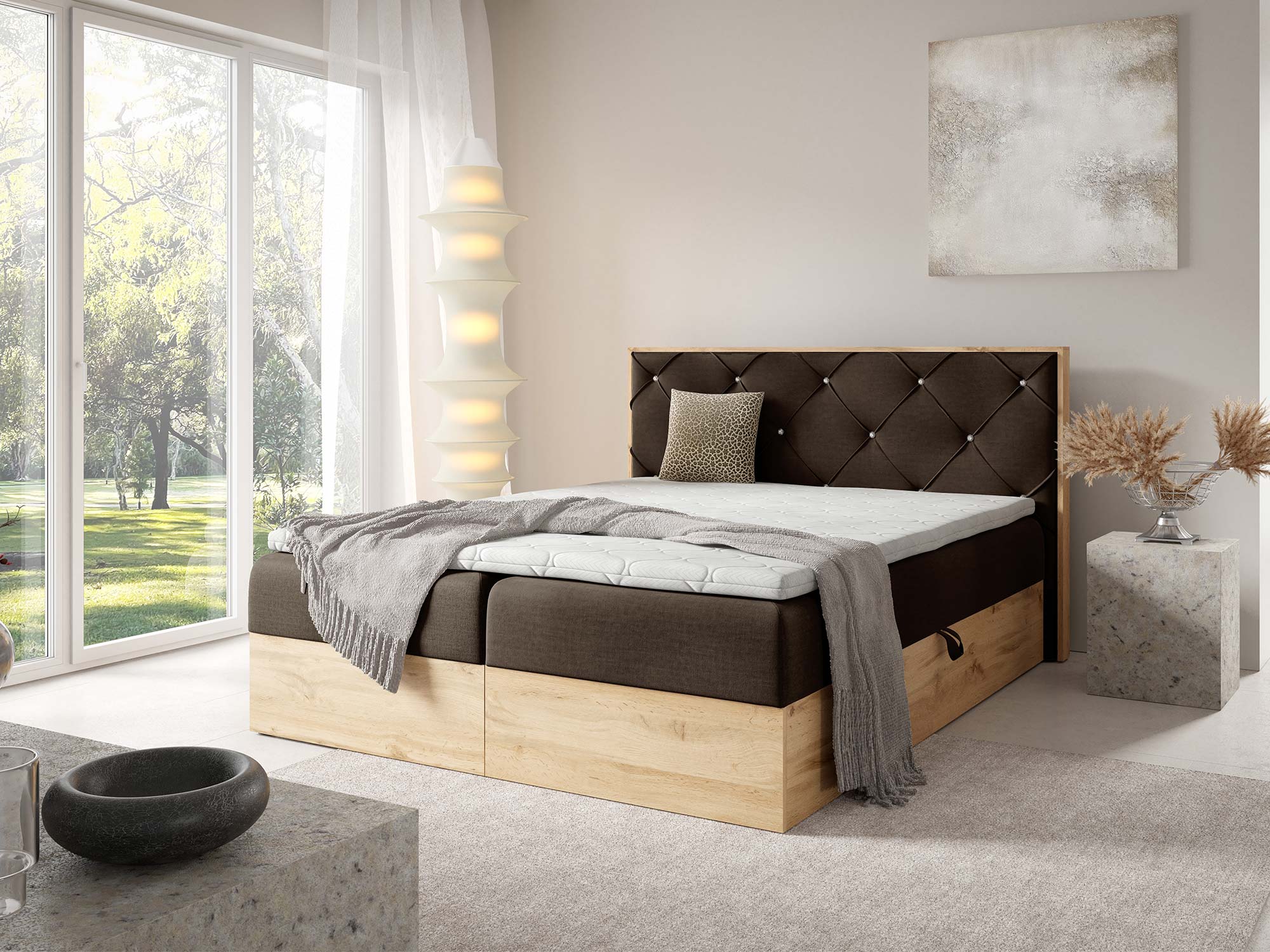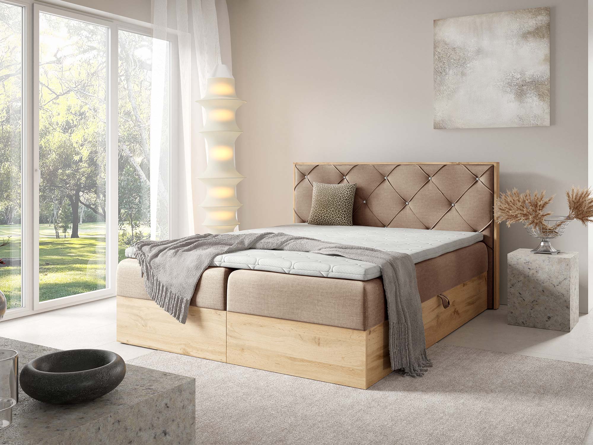 Zagłowie to prawdziwa wisienka na torcie – ozdobne pikowania z imitacją kryształków Svarowskiego sprawiają, że łóżko nabiera luksusowego charakteru. To detal, który z pewnością przyciągnie uwagę i nada Twojej sypialni wyjątkowej elegancji. Całość dopełnia ciepły kolor dąb sonoma, który pięknie komponuje się zarówno z jasnymi, jak i ciemniejszymi aranżacjami.