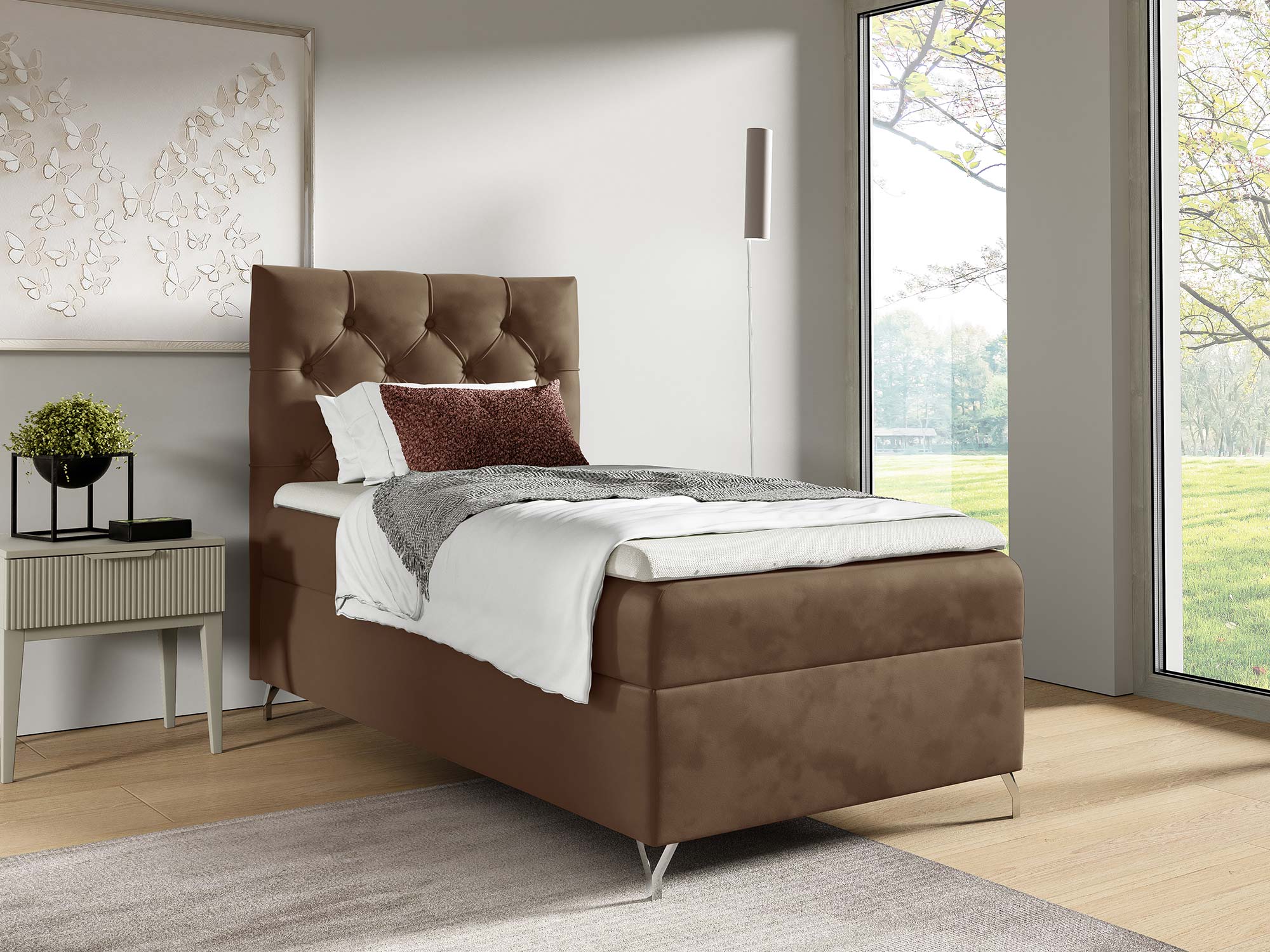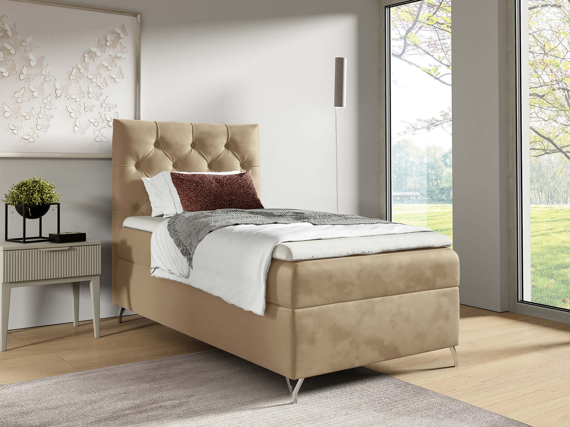 Metalowe, srebrne nóżki nie tylko pięknie kontrastują z miękką tapicerką, ale także nadają całej konstrukcji lekkości i elegancji. Dodatkowo ich wysokość pozwala na łatwe utrzymanie czystości wokół łóżka.
