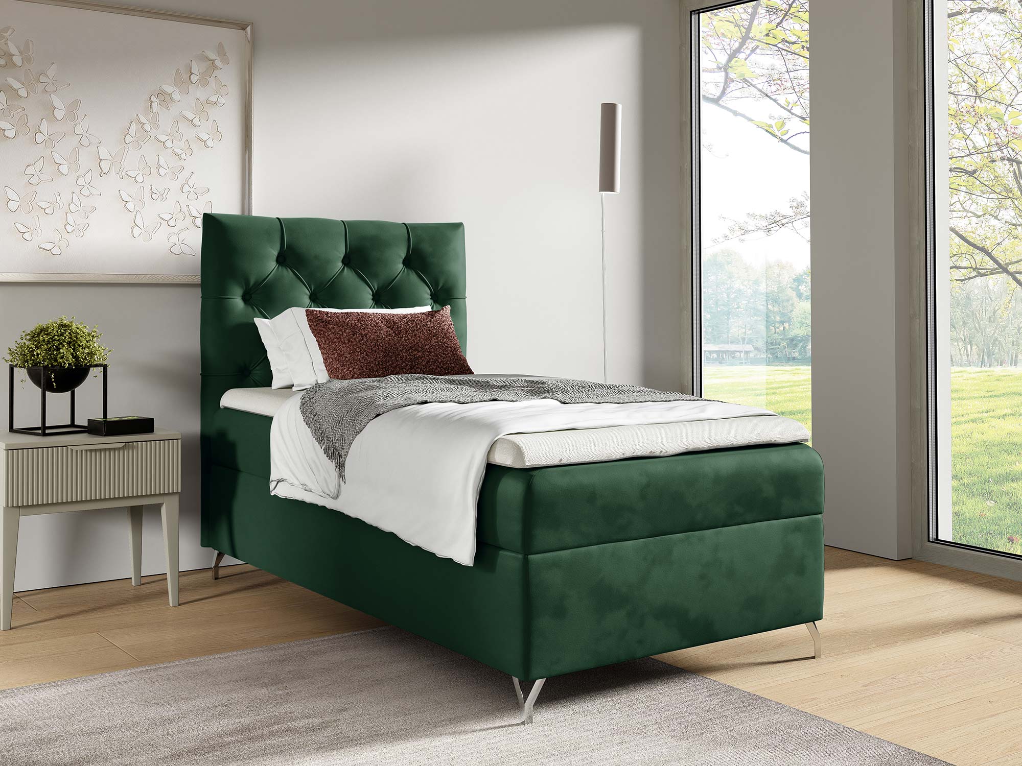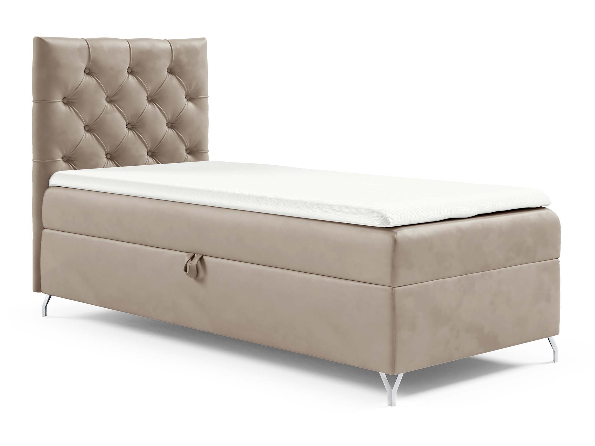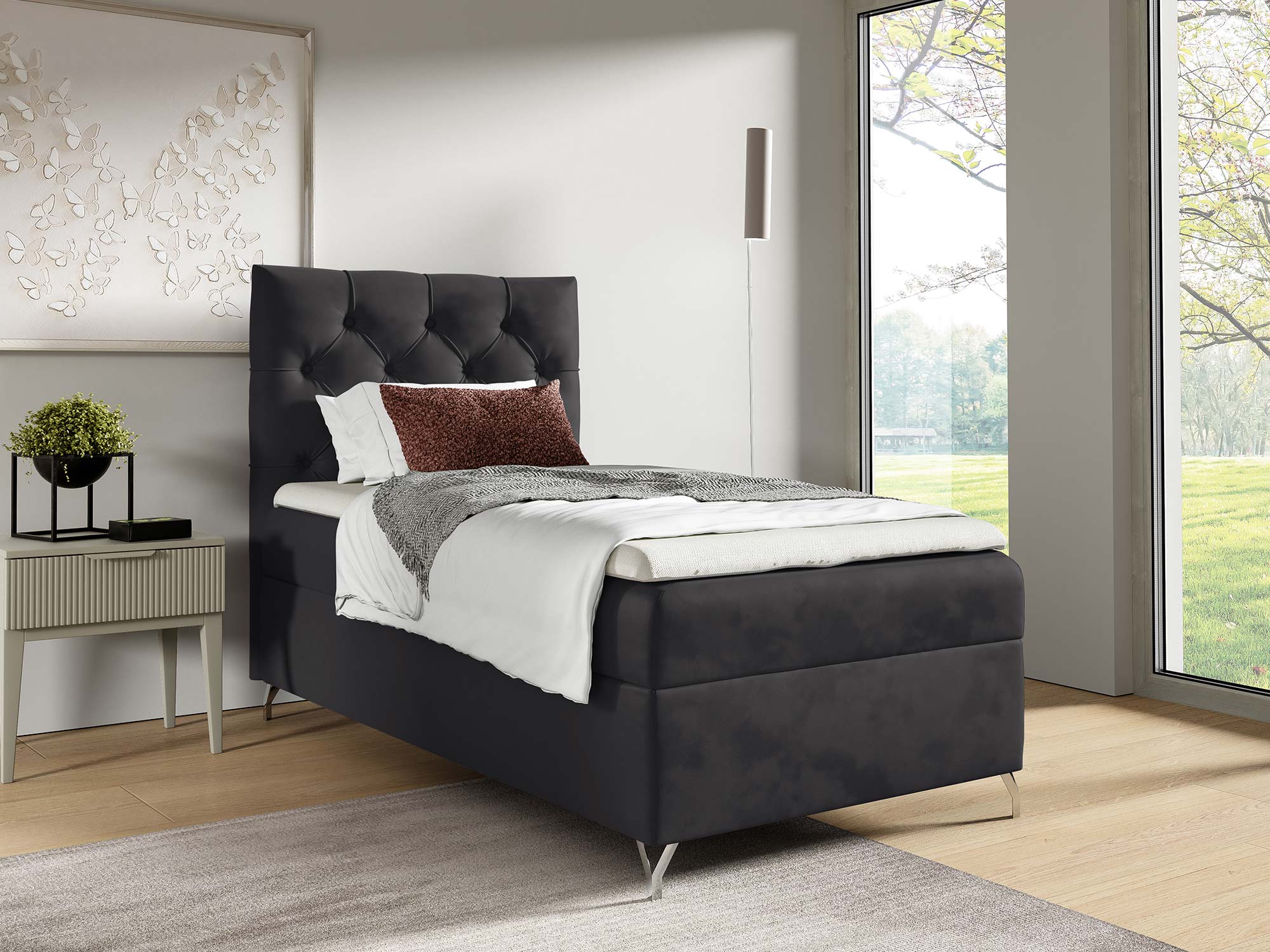 Metalowe, srebrne nóżki nie tylko pięknie kontrastują z miękką tapicerką, ale także nadają całej konstrukcji lekkości i elegancji. Dodatkowo ich wysokość pozwala na łatwe utrzymanie czystości wokół łóżka.
