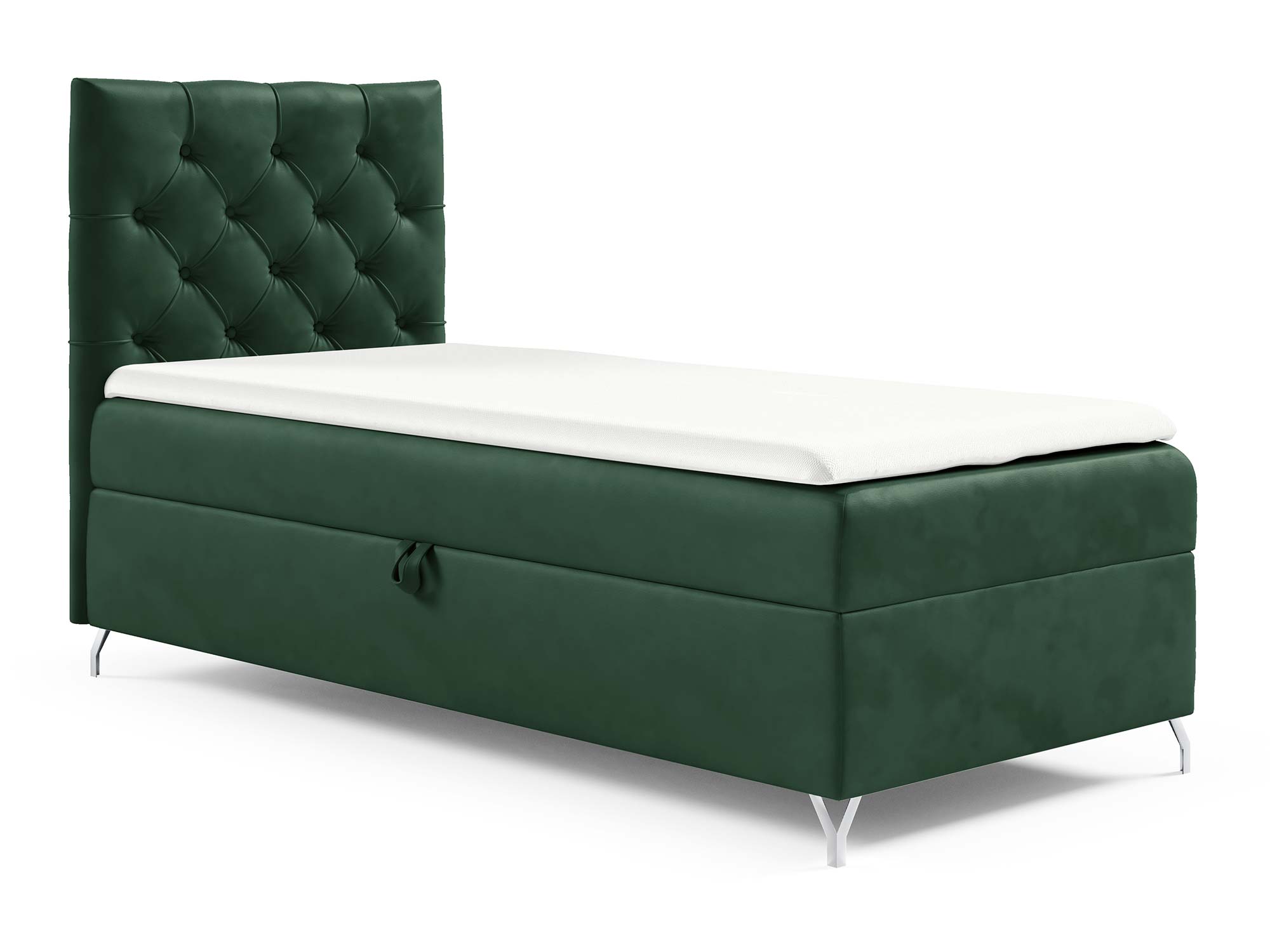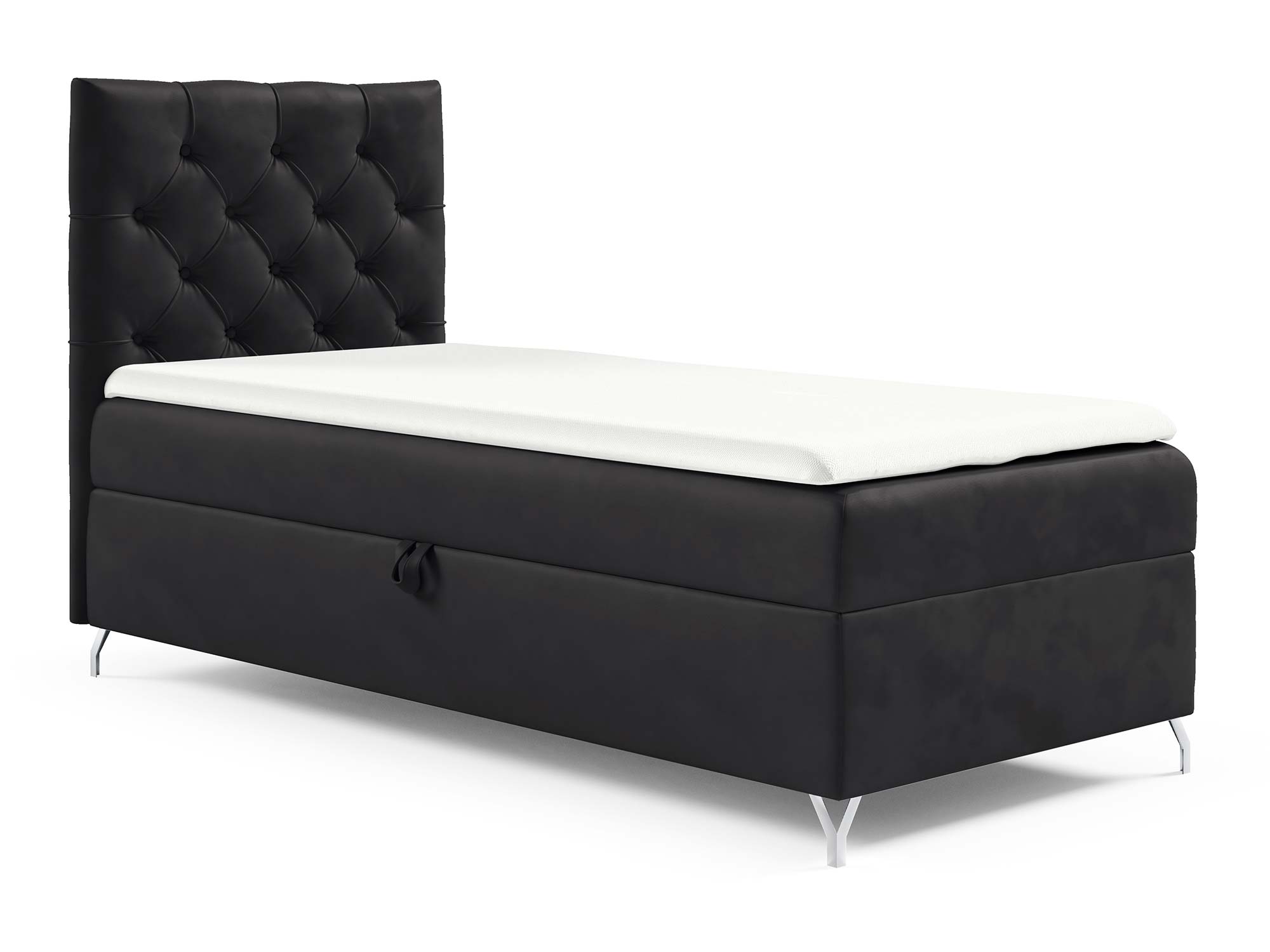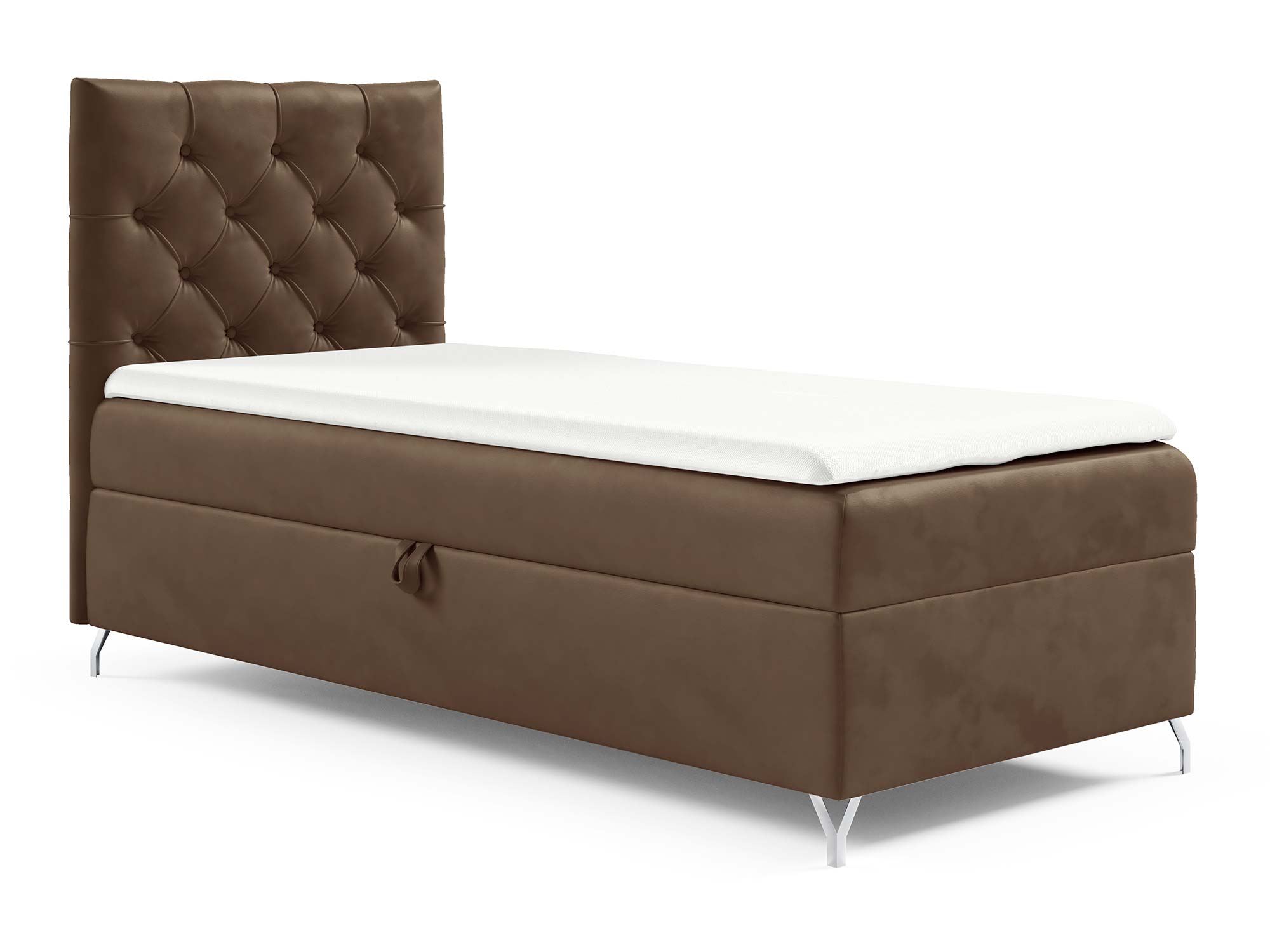 Metalowe, srebrne nóżki nie tylko pięknie kontrastują z miękką tapicerką, ale także nadają całej konstrukcji lekkości i elegancji. Dodatkowo ich wysokość pozwala na łatwe utrzymanie czystości wokół łóżka.