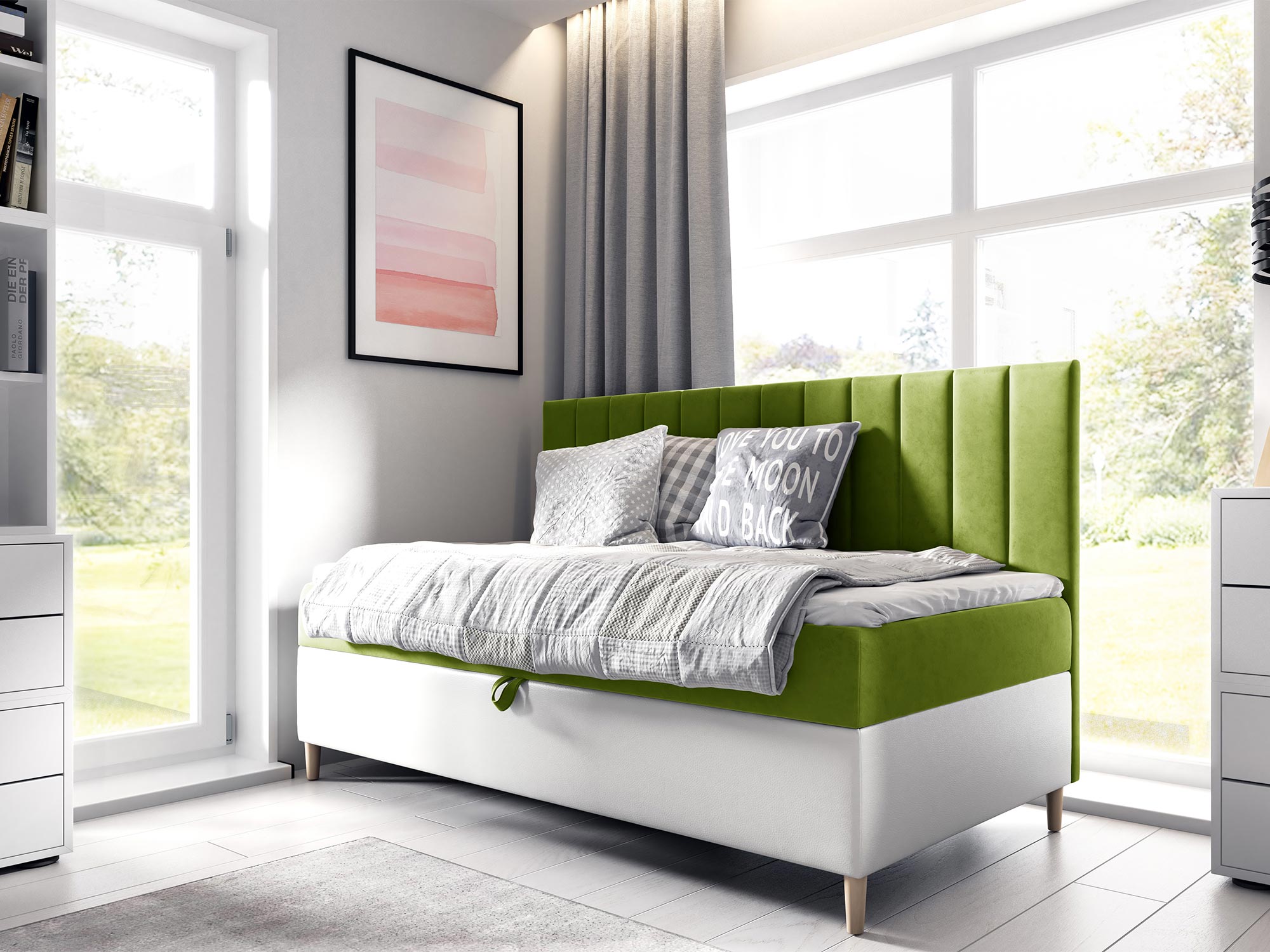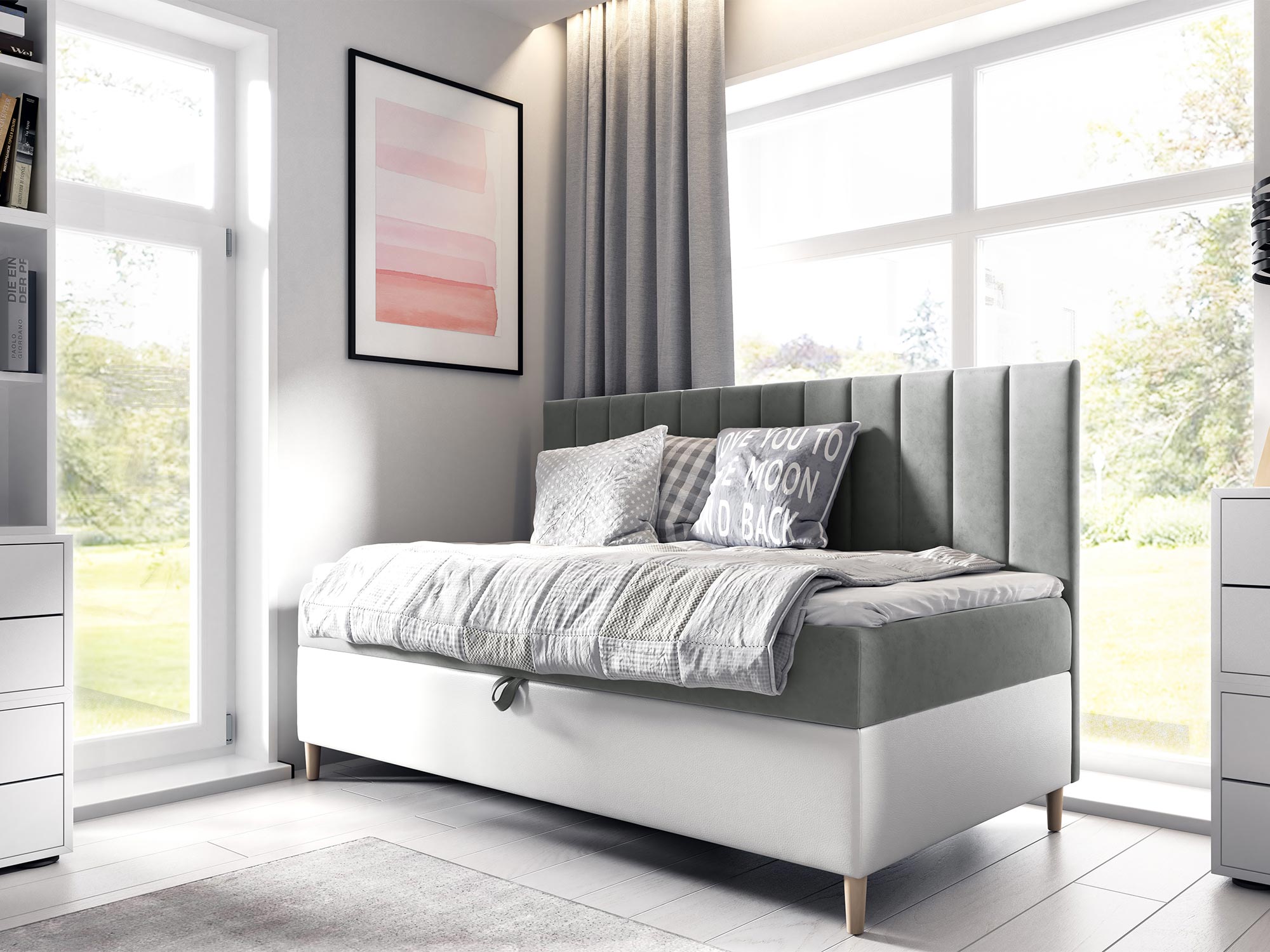 Dzięki materacowi bonell, topperowi z wysokoelastycznej pianki oraz pojemnikowi na pościel z automatem sprężynowym, łóżko RÓŻA zapewnia wygodę i codzienną funkcjonalność. Codzienne korzystanie staje się proste, a komfort użytkowania zadowoli najbardziej wymagających.