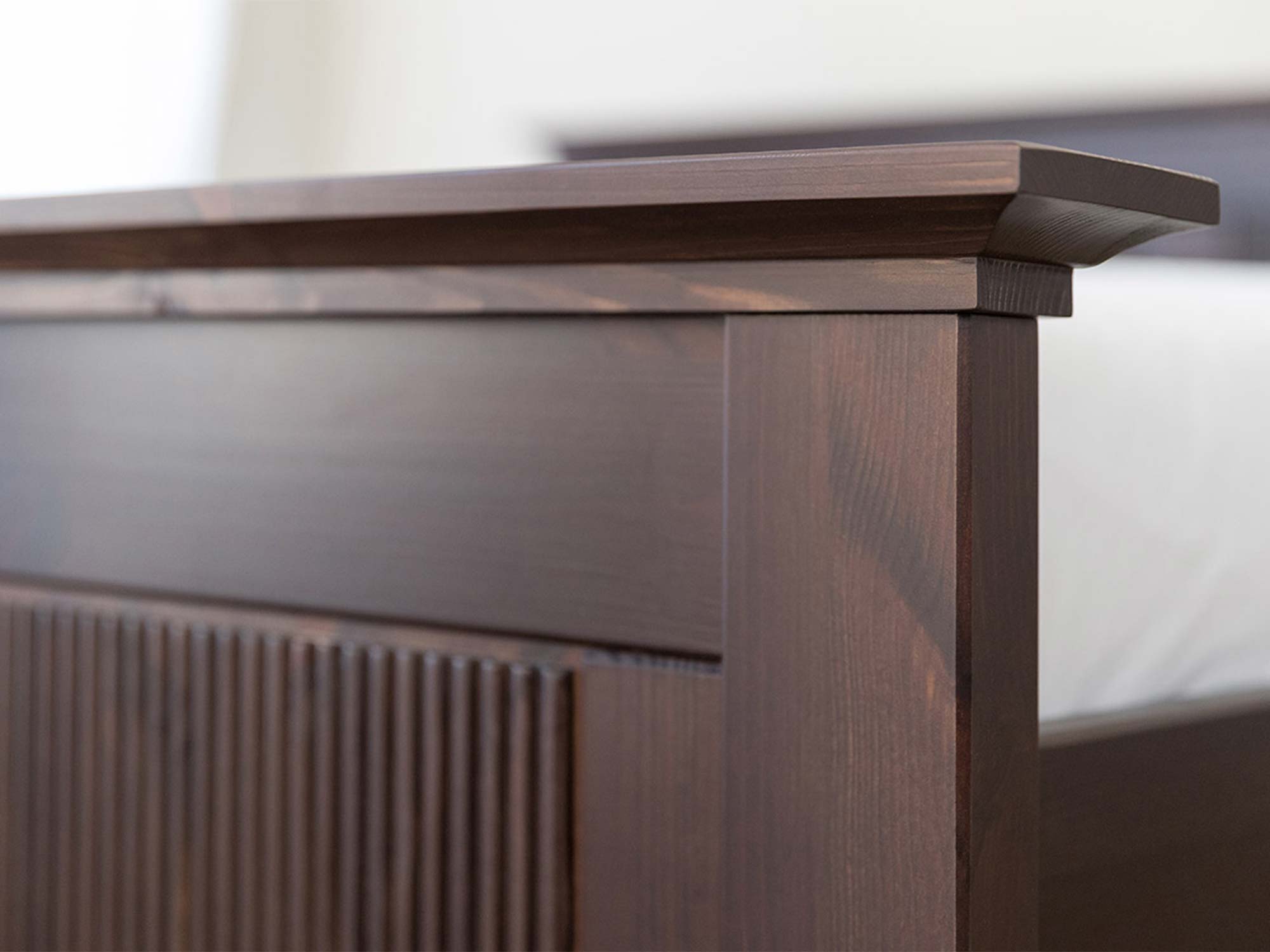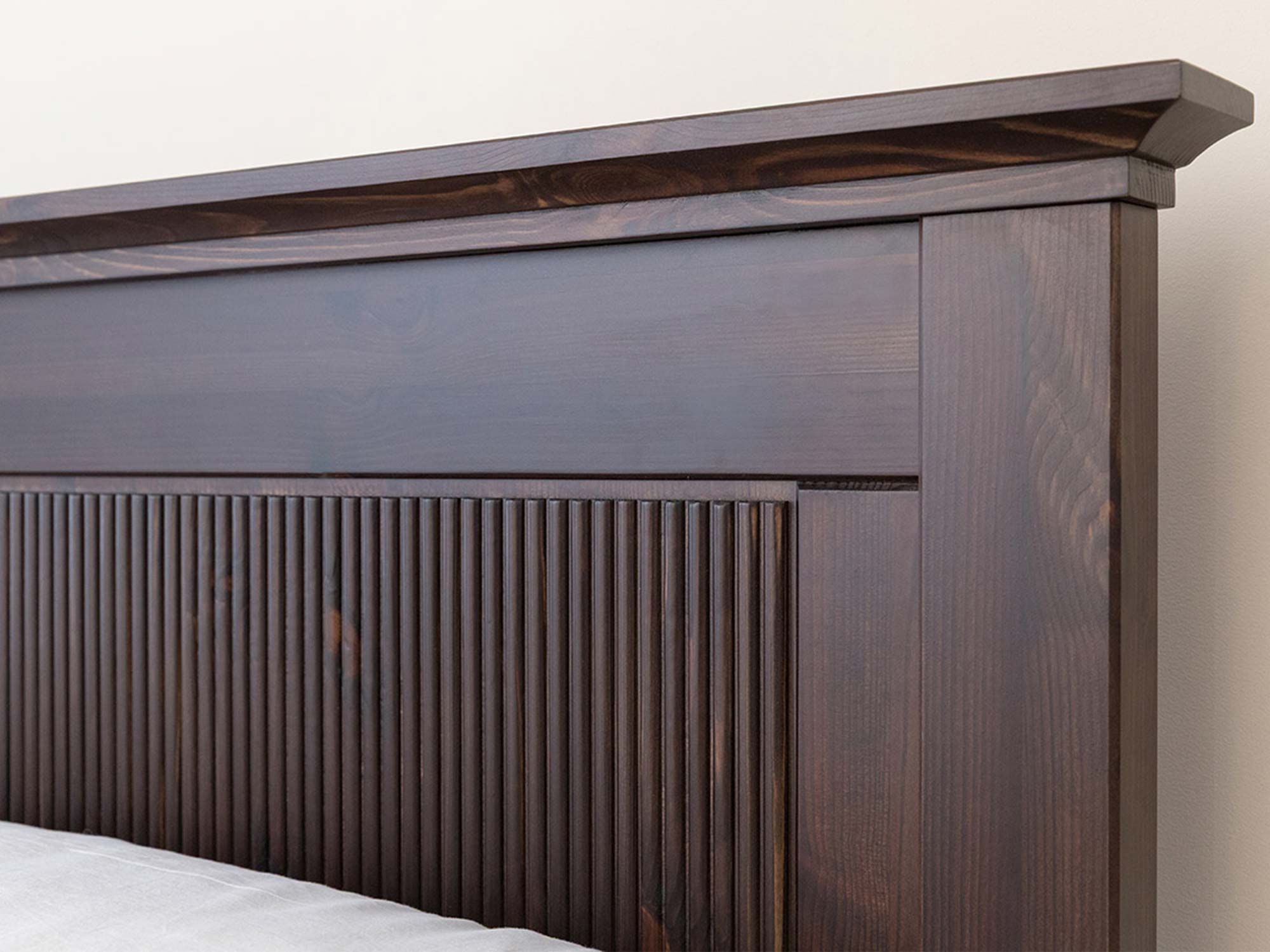 Łóżko Kalari powstało z myślą o tych, którzy cenią lite drewno i kunszt wykonania. Sosna została wyselekcjonowana tak, aby jej naturalny rysunek był widoczny pod wykończeniem. Farba wodna o 70% kryciu pozostawia półtransparentny efekt: drewno wygląda szlachetnie, a jego pory mogą „oddychać”. Dzięki temu powierzchnia zachowuje świeżość i urok przez lata, a konserwacja jest prosta.