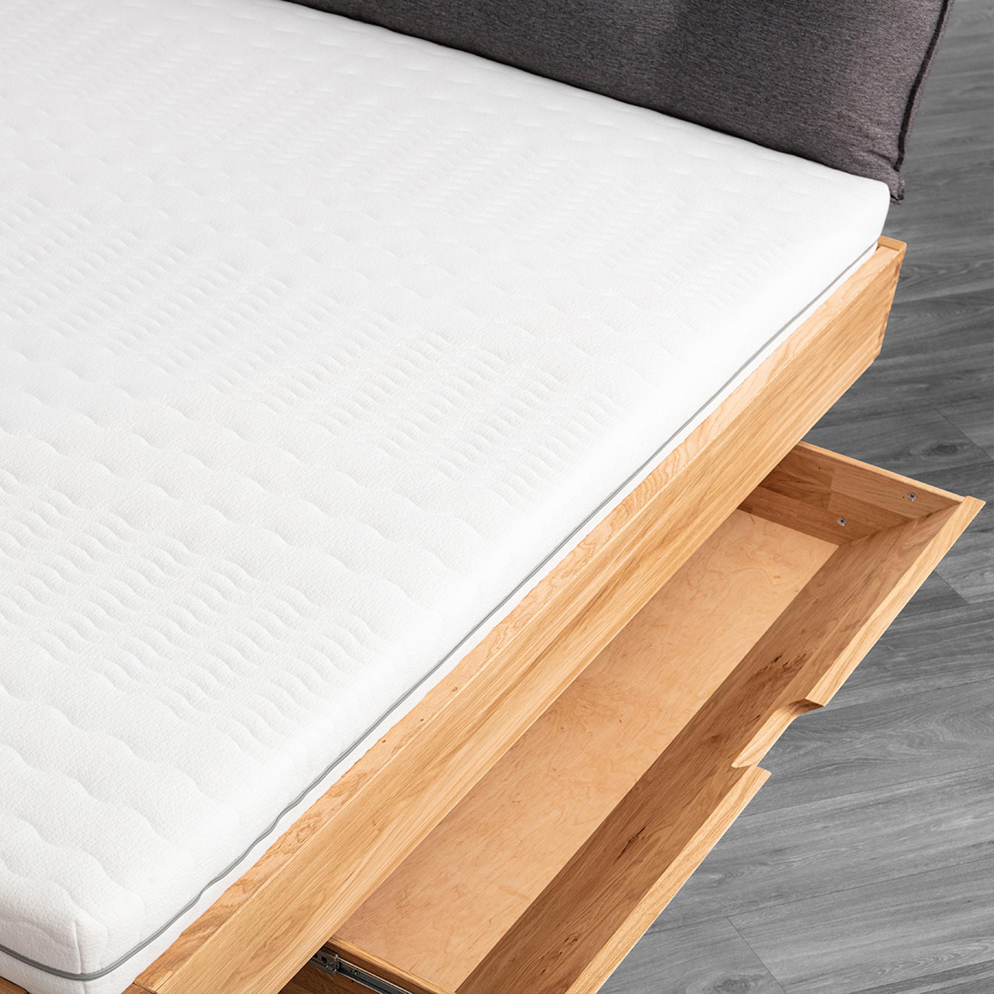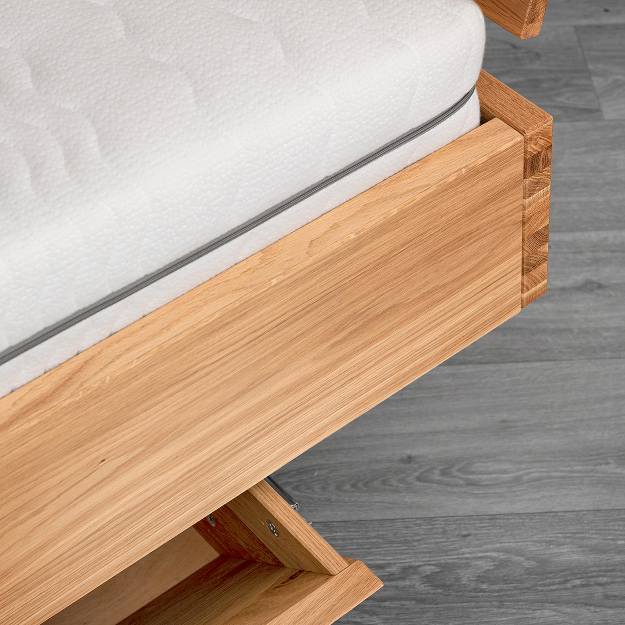 - Dyskretny pojemnik — funkcjonalna szuflada boczna na pościel i tekstylia, zawsze pod ręką.