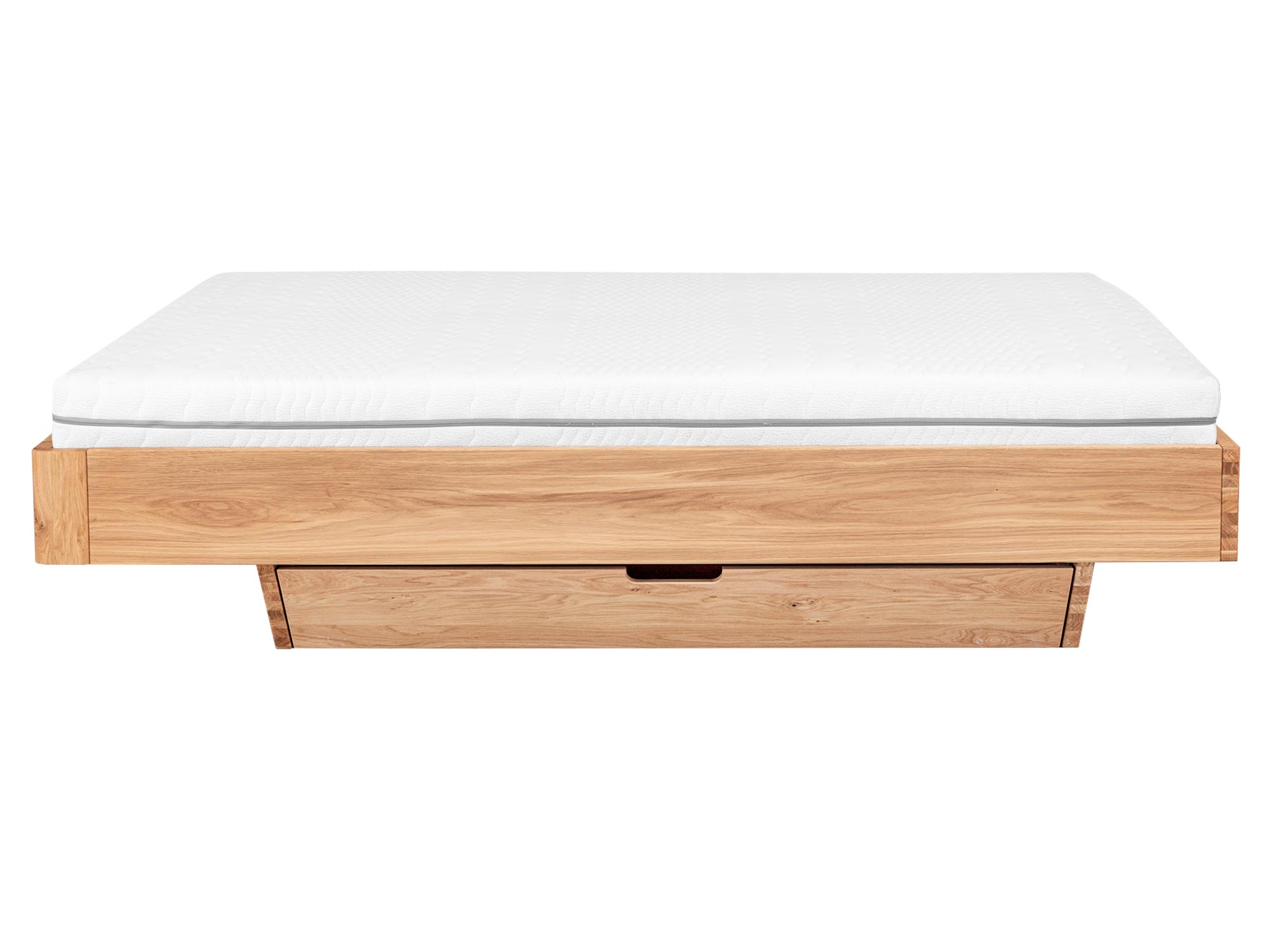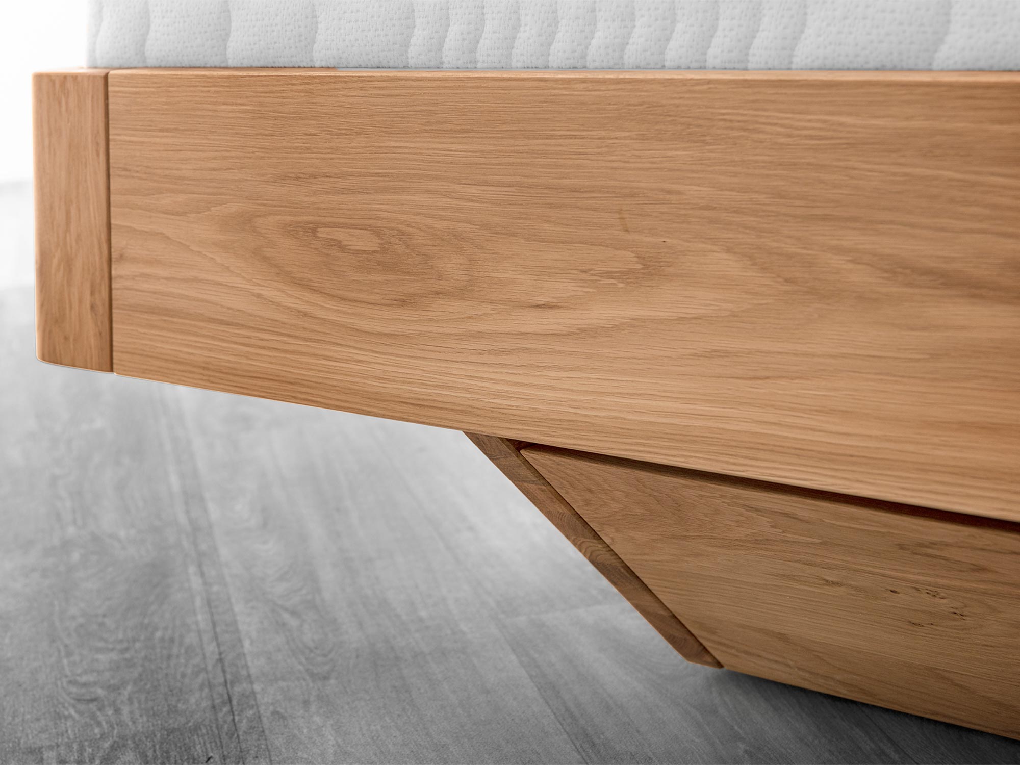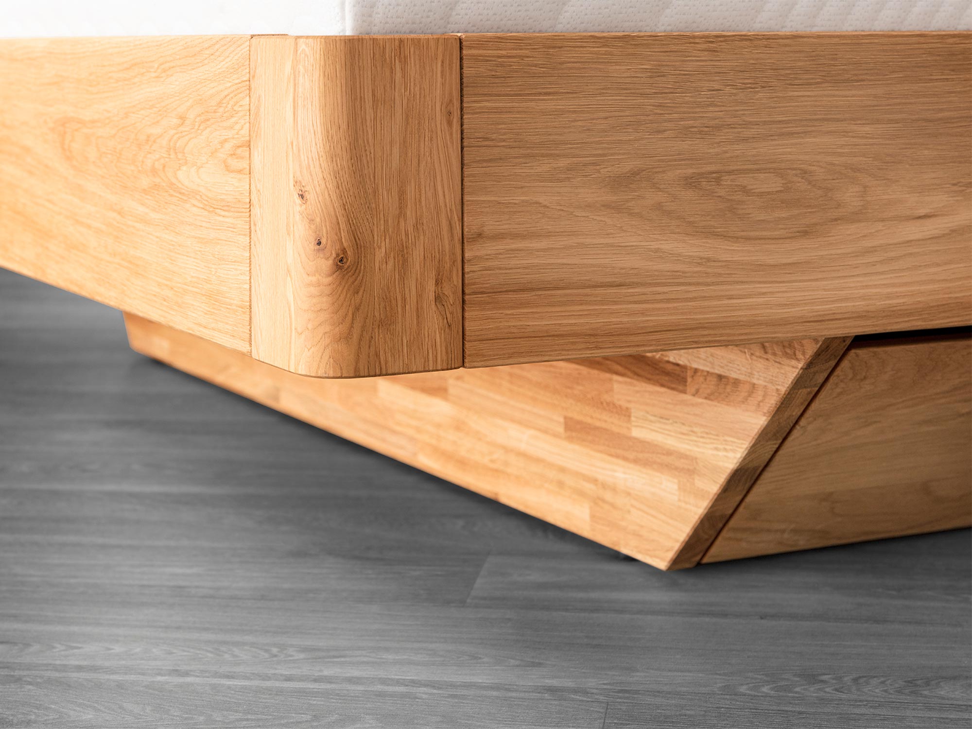 Solidność na lata. Konstrukcja z litego dębu, wzmocnione narożniki i precyzyjne łączenia gwarantują stabilność bez skrzypienia. Przemyślany system nośny (listwa środkowa i dodatkowe wzmocnienia) zapewnia równomierne podparcie – to ważne zarówno przy lżejszych, jak i wyższych materacach, z którymi Elona C prezentuje się wyjątkowo elegancko.