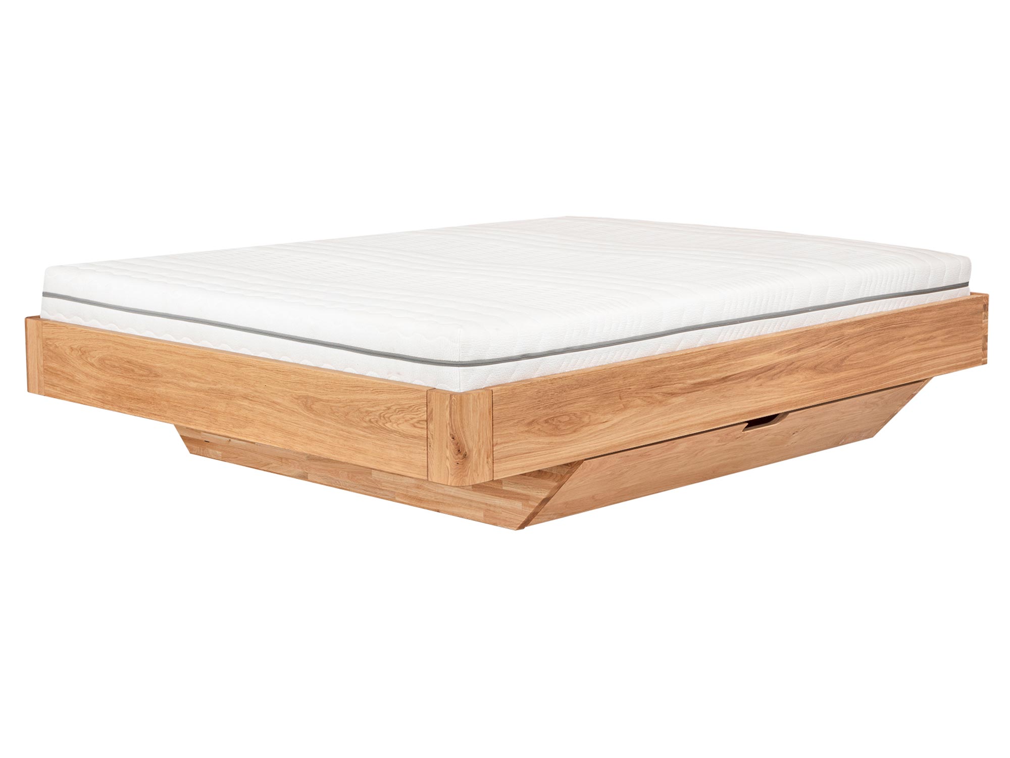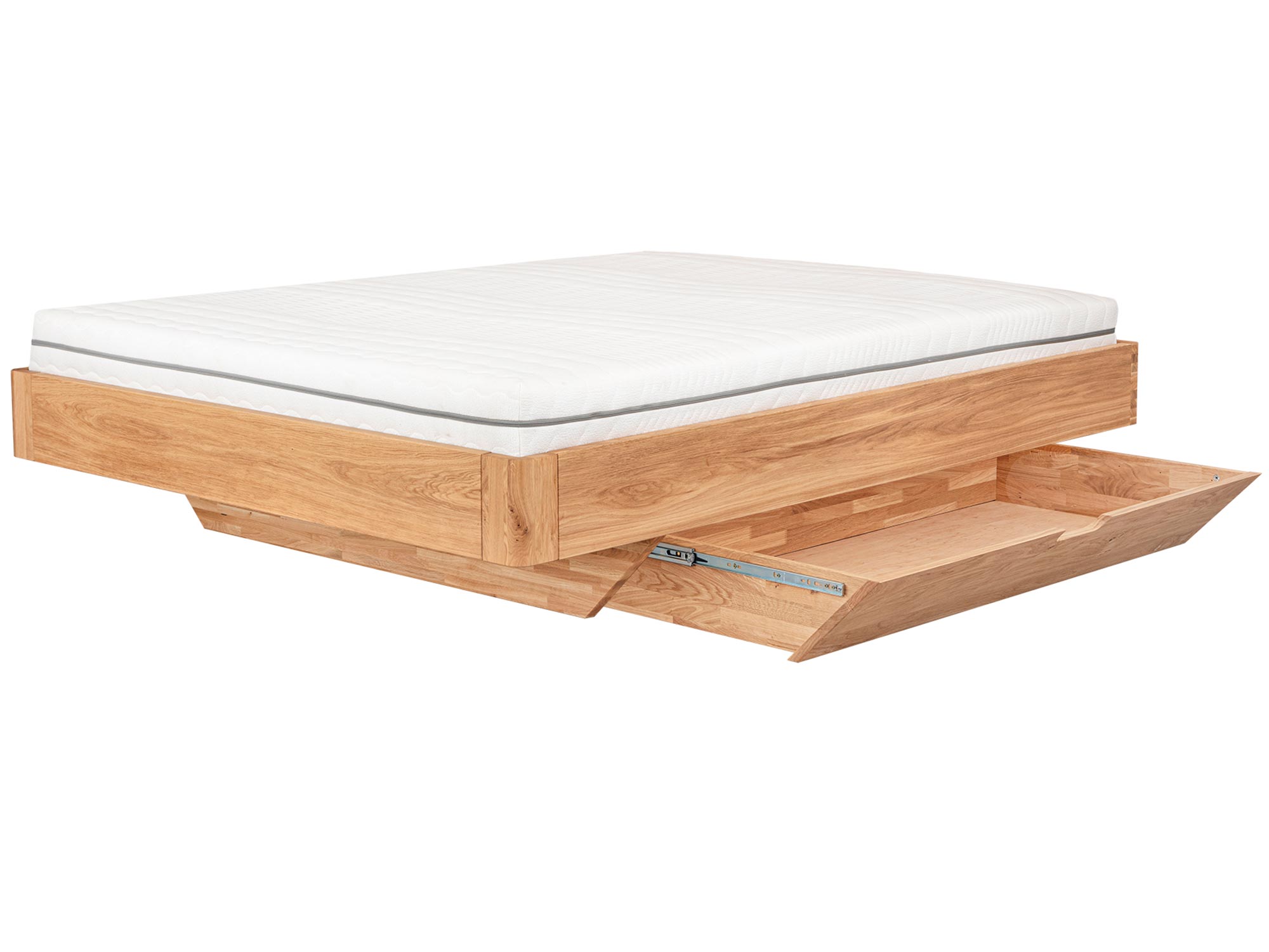 Elona C to minimalistyczne łóżko z litego drewna dębowego, które łączy prostą, elegancką formę z praktycznymi rozwiązaniami na co dzień. Dwie pojemne szuflady dyskretnie ukryte w cokole pomieszczą pościel i koce, a cofnięte nogi nadają bryle lekkości, tworząc modny efekt „floating bed”. To mebel, który porządkuje przestrzeń, koi wzrok i świetnie czuje się w nowoczesnych, skandynawskich i japandi aranżacjach.