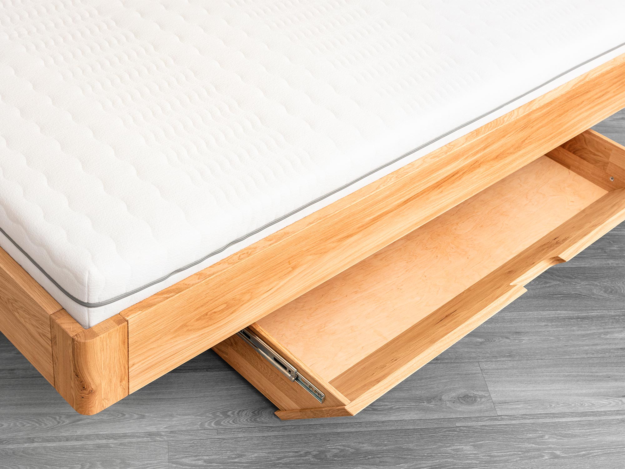 Ukryte szuflady = widoczny porządek. Dwie głębokie szuflady wkomponowane w cokół to sprytny sposób na przechowywanie pościeli, koców czy sezonowych tekstyliów. Fronty bez wystających uchwytów (estetyczne frezowane chwyty) zachowują spójny, minimalistyczny charakter bryły. Prowadnice z pełnym wysuwem pracują płynnie i cicho – bez szarpania i zacinania.