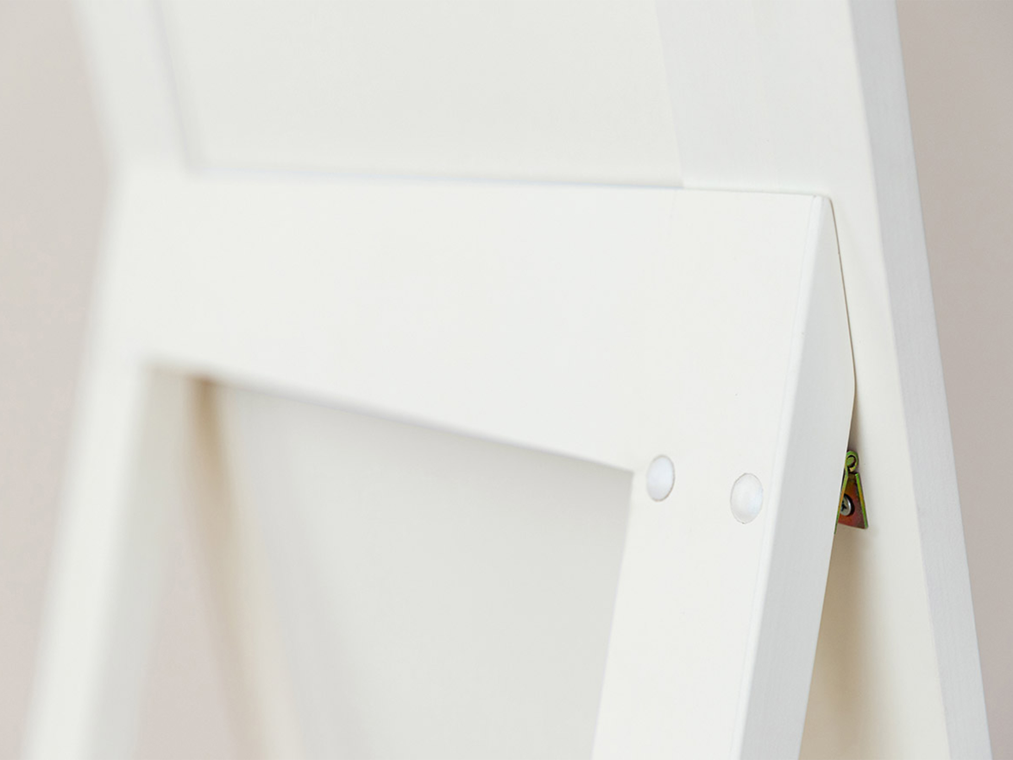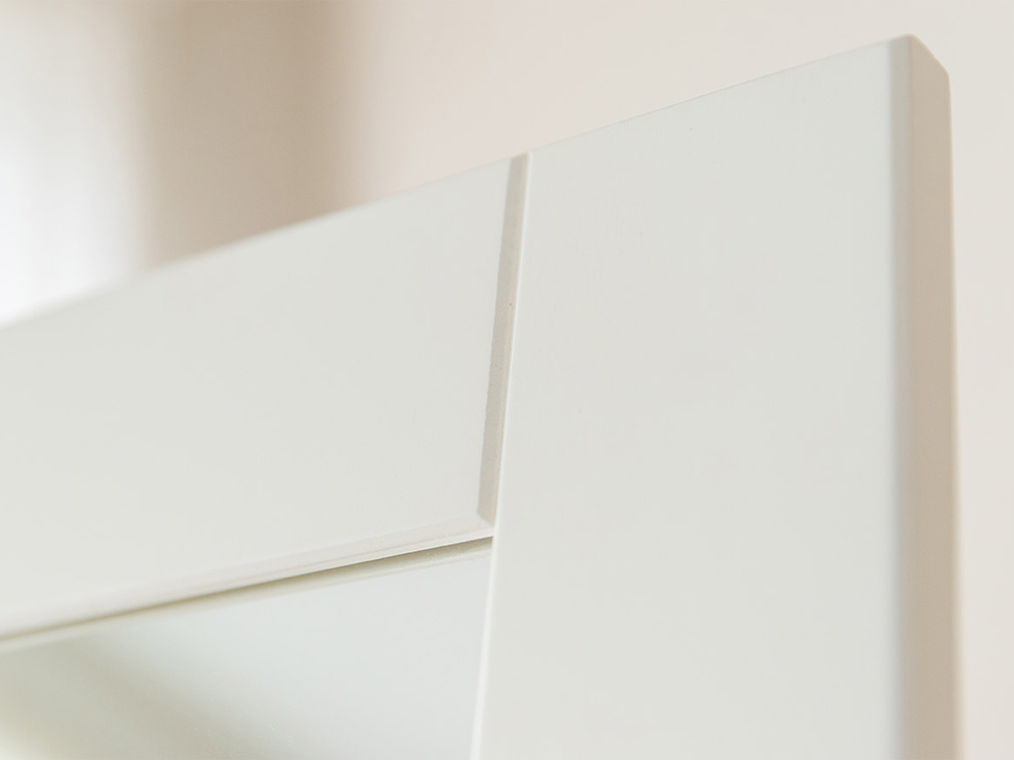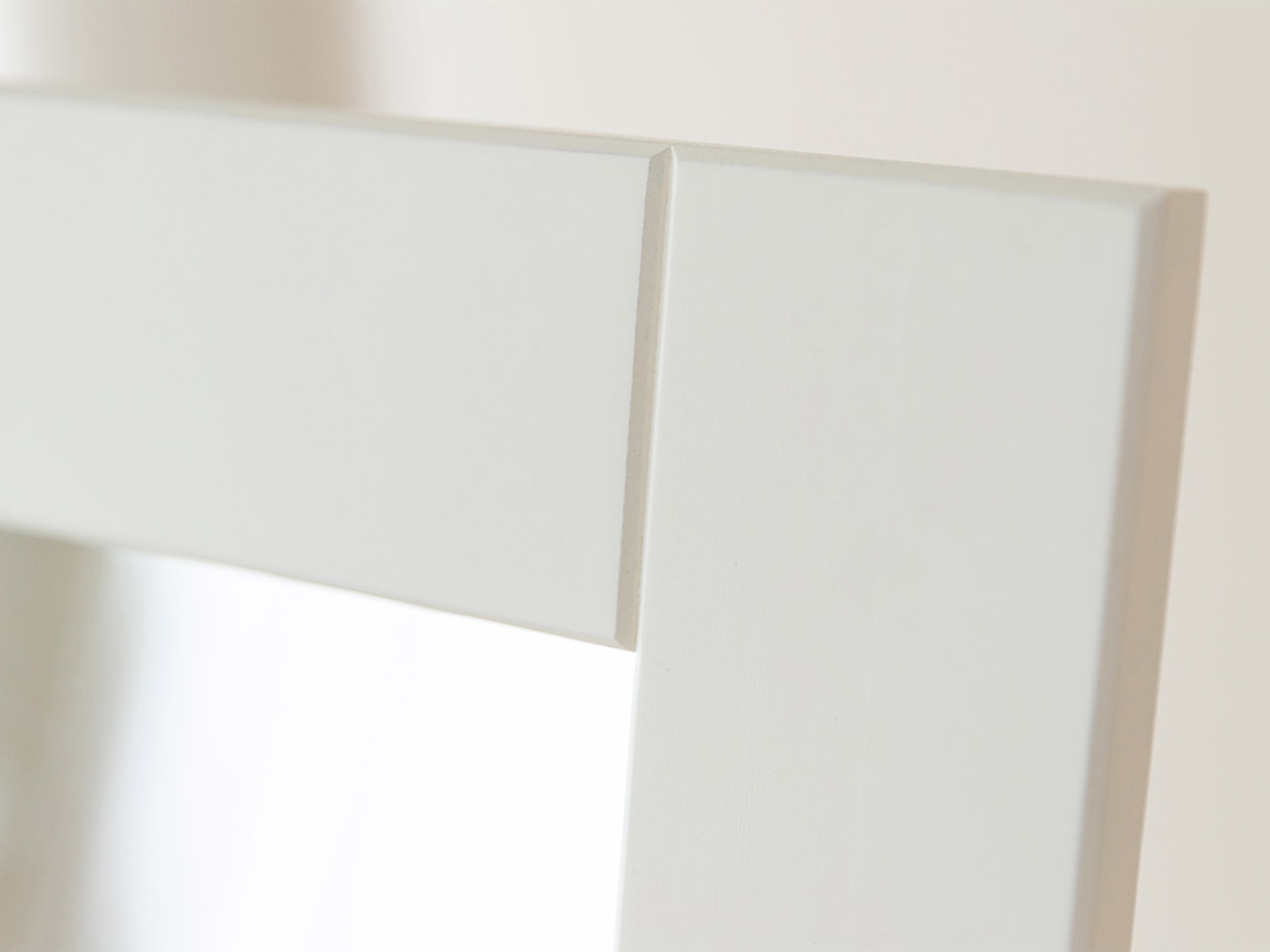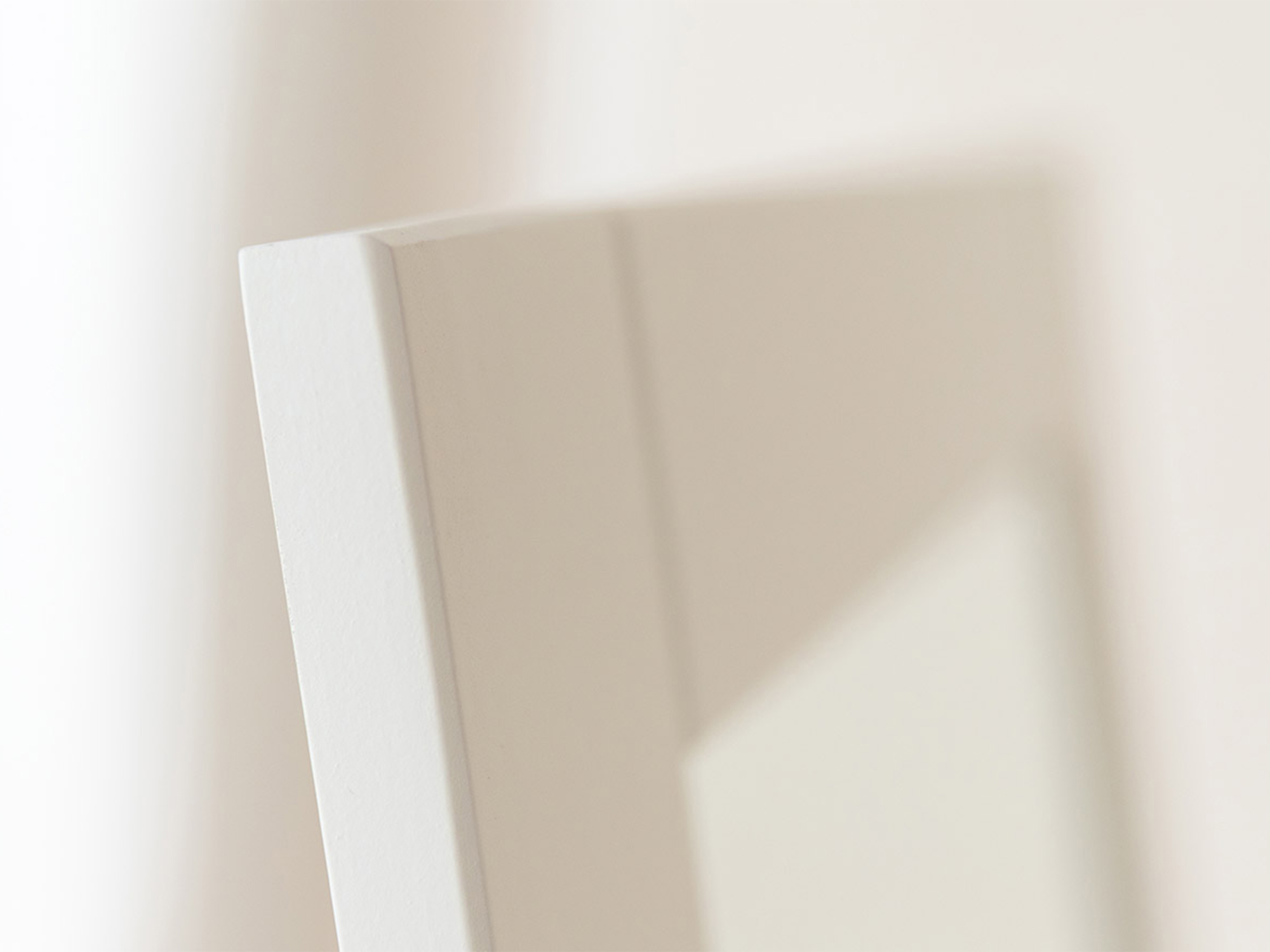 Jest w nim coś kojącego: gładka, biała powierzchnia ramy i naturalna struktura drewna, która nie została ukryta pod grubą warstwą farby. Lita sosna fińska to materiał o wyjątkowym charakterze – trwały, stabilny i szlachetnie piękniejący z czasem. Ingrid wykorzystuje ten potencjał do maksimum. Rama, wykonana w całości z jednego rodzaju drewna, zachowuje spójność wizualną i zapewnia solidność, którą czuć przy każdym przesunięciu lustra. Farba wodna o 85% kryciu zabezpiecza drewno i jednocześnie podkreśla jego naturalny rysunek; to dlatego lustro wygląda tak autentycznie i ponad trendami.
