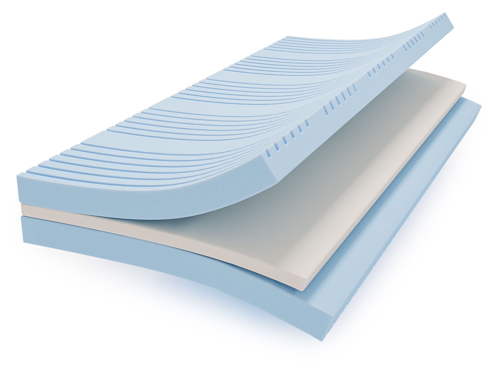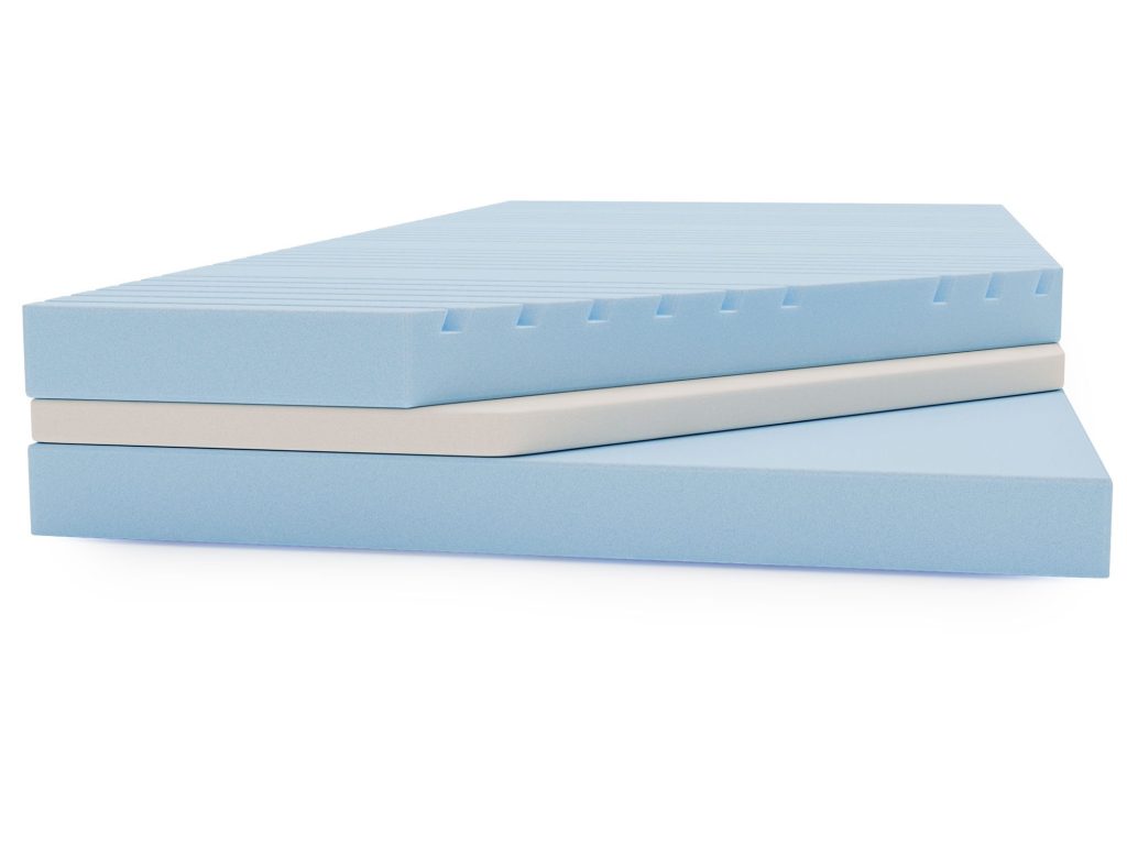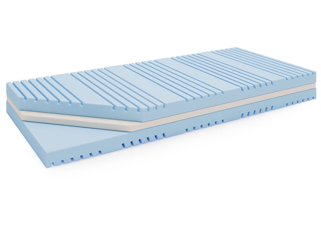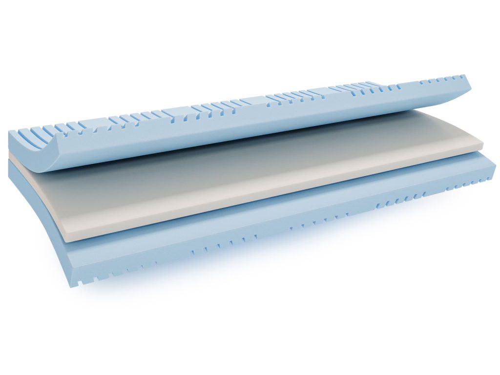 - Górna warstwa – Niebieska pianka Smart Foam (8 cm): Pianka o gęstości 30 kg/m³ została specjalnie wyfrezowana, aby wspierać przepływ powietrza i zapewniać wyjątkowe uczucie przewiewności. Dodatkowe nacięcia w piance działają jak mikro-masaż, poprawiając krążenie krwi, co dodatkowo wpływa na komfort snu.