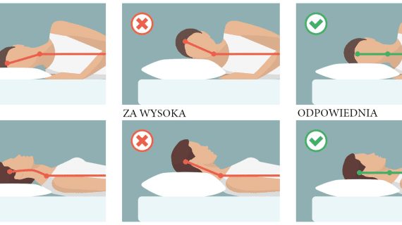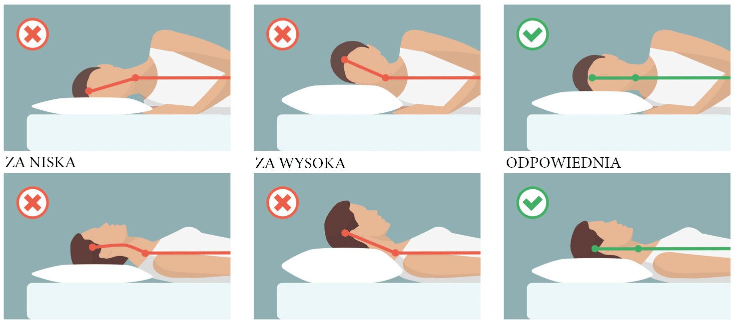 Istotnym aspektem podczas snu jest ułożenie ciała. Kark powinien tworzyć z resztą kręgosłupa linię prostą. Dlatego, poduszka nie może być ani za wysoka, ani za niska.
