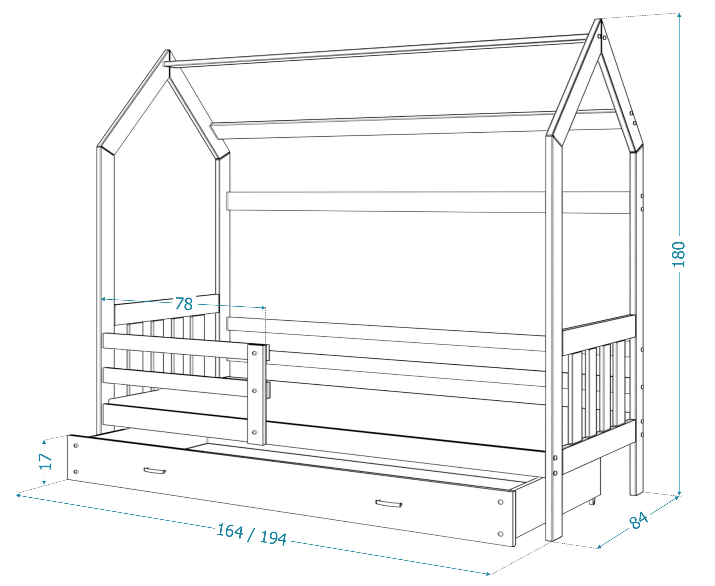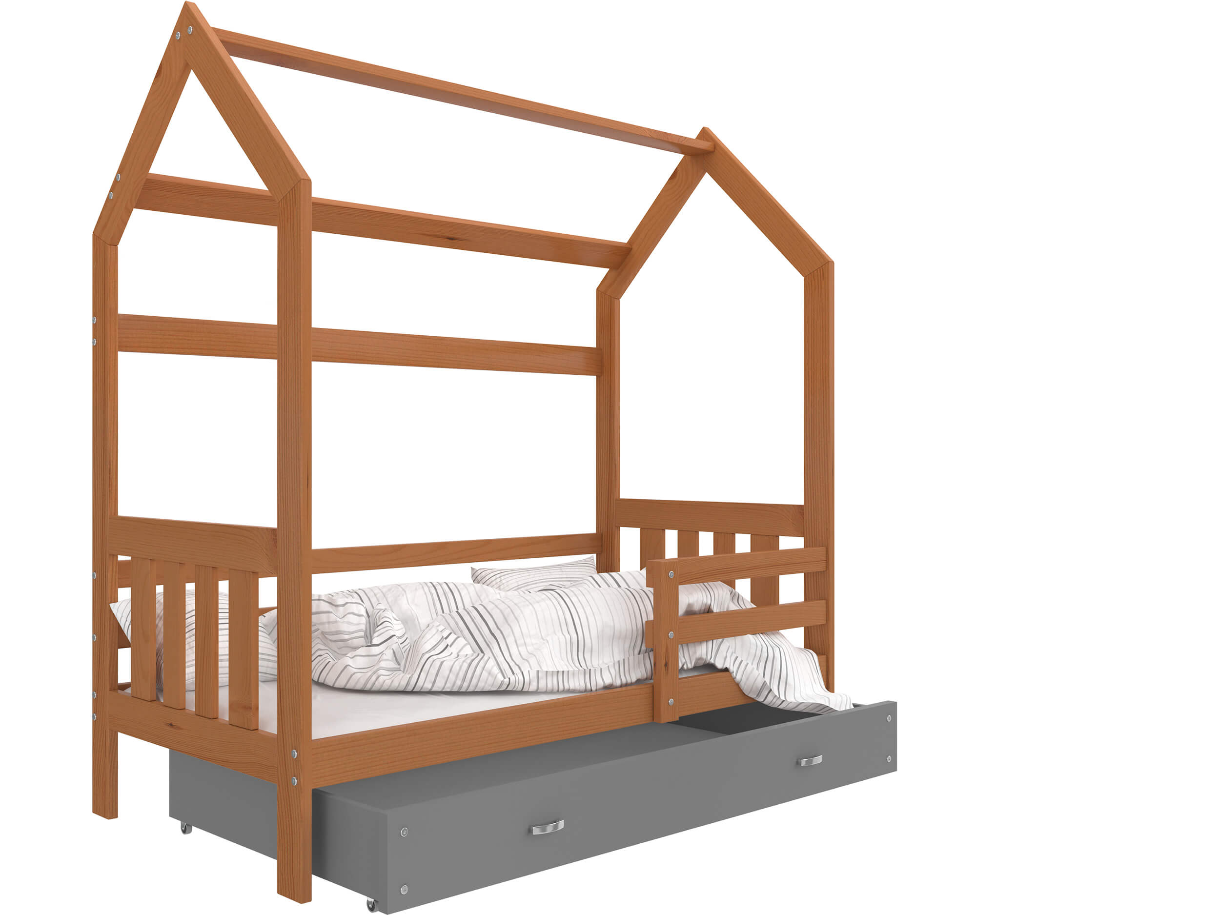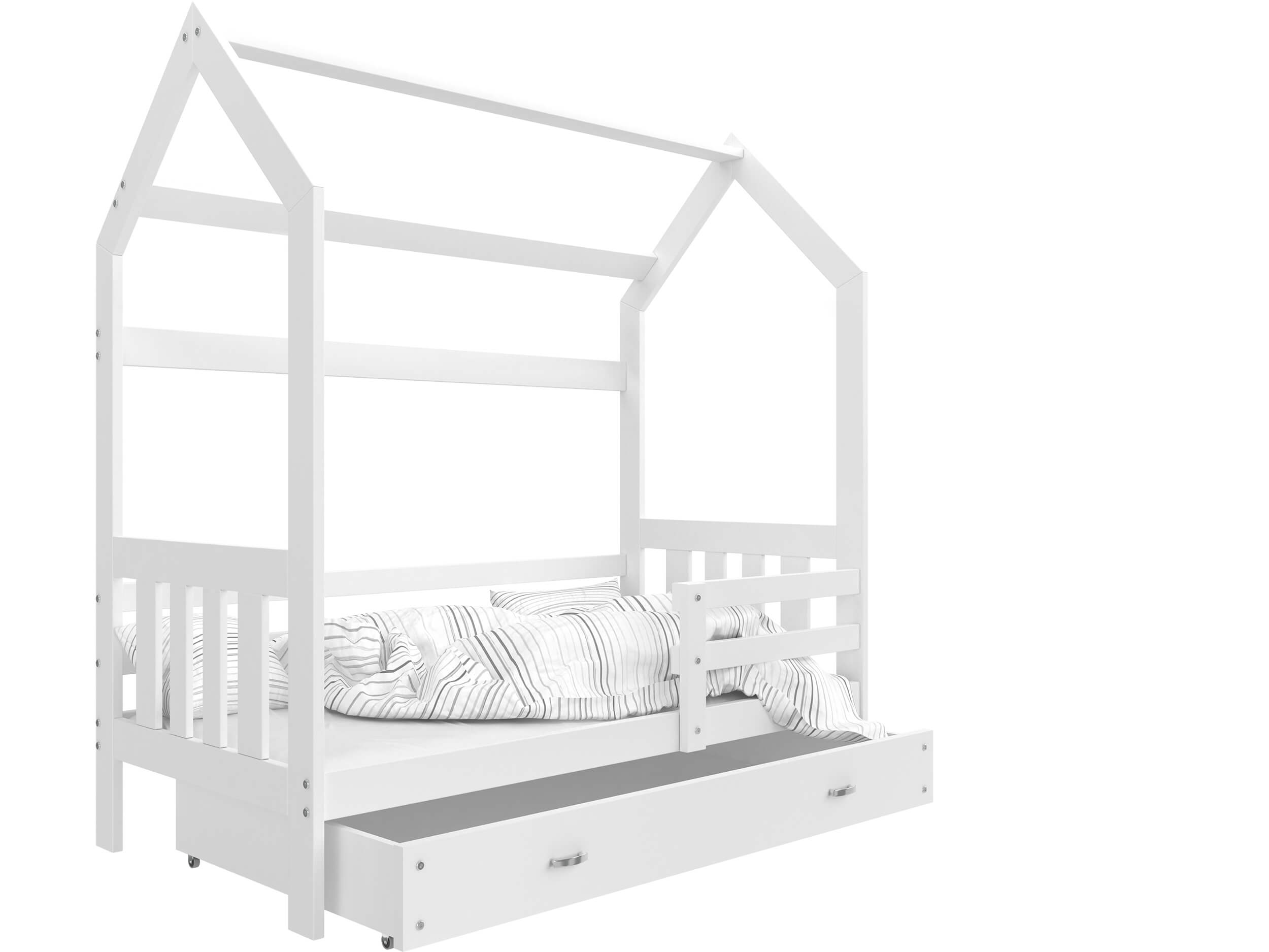 Łóżko HOUSE z pojemnikiem na pościel to mebel, który charakteryzuje się komfortem, bezpiecznym użytkowaniem i niepowtarzalnym charakterem. Stabilna i trwała konstrukcja zapewniają solidność łóżka a także jego trwałość. Mebel zrobiono z wysokogatunkowego drewna sosnowego z zaokrąglonymi krawędziami i wyprofilowanymi ściankami, które mają na celu zagwarantować bezpieczeństwo śpiącym dzieciom. W celu zwiększenia bezpieczeństwa korzystania z produktu został on pomalowany bezwonnym wodnym lakierem przeznaczonym do produktów dziecięcych. Łóżko wyposażono w stelaż flex wykonany z osadzonych w plastikowych kieszonkach sprężynujących listw, który zapewnia właściwą amortyzację materaca wraz z ciałem dziecka.. Do wyboru jest też piankowy materac w pokrowcu o grubości 7 cm. Przez wzgląd na rozmaitość charakterów i wykończeń w jakich zorganizowano sypialnie dziecięce nasze produkty występują w kilku wybarwieniach do wyboru, są wśród nich biały,szary, sosna i olcha. Do łóżka został dodany zestaw przeznaczony do montażu, który jest łatwy i szybki, jak również instrukcja.