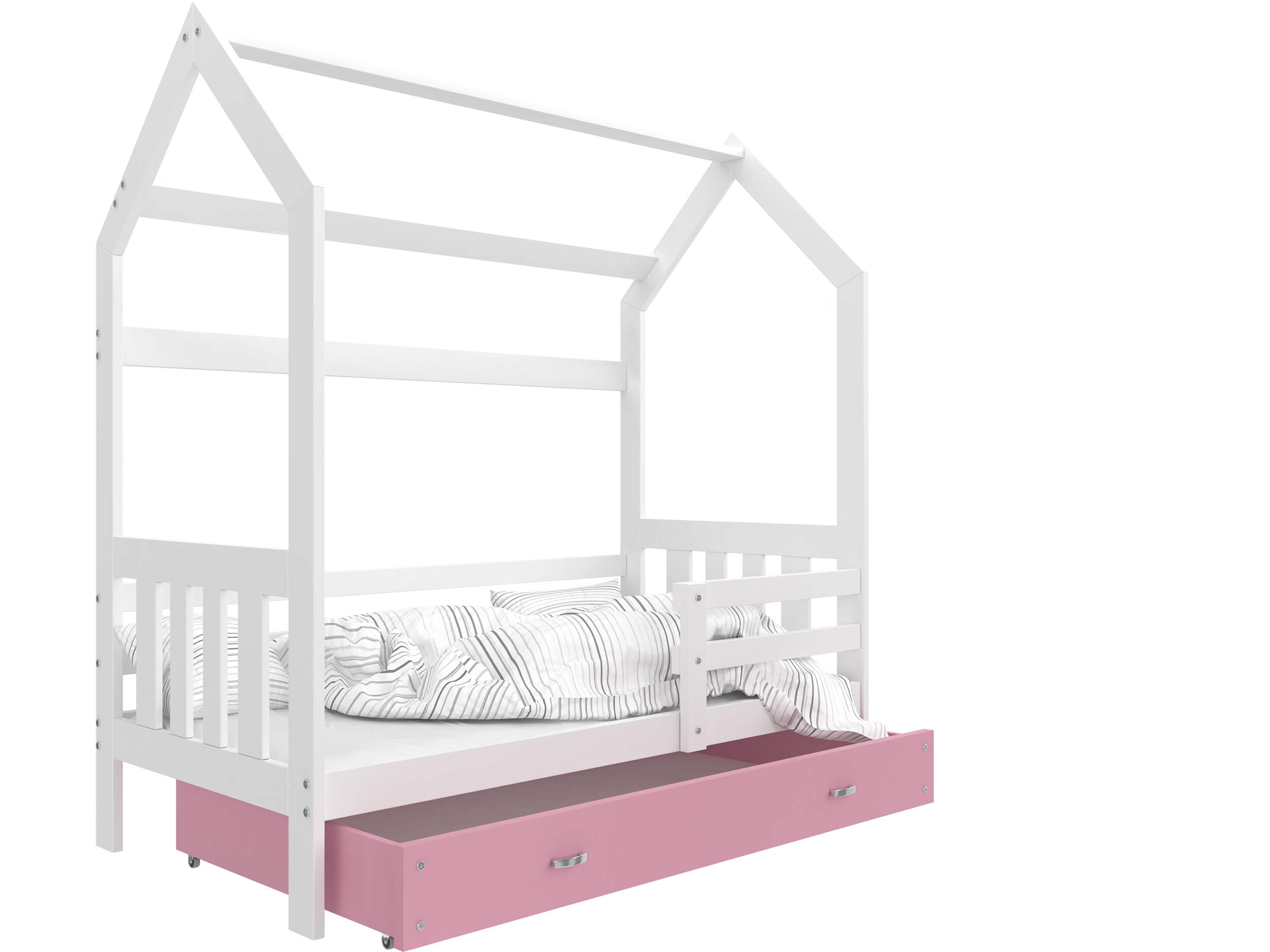 Demonstrowane po lewej łóżko domek z pojemnikiem na pościel to wyjątkowy mebel, który fenomenalnie zaprezentuje się w każdym dziecięcym pokoju. Łóżko to nieodzowny element aranżacji absolutnie każdej dziecięcej sypialni, który może służyć zarówno wypoczynkowi i zabawie. Produkt jest praktyczny i nowatorski, jest to spełnienie marzeń dzieci, a do tego obłędnie wygląda, a także przynosi wiele radości i uciechy.Dzięki solidnemu wykonaniu mebel wytrzyma wszystkie dziecięce harce oraz z pewnością posłuży przez długi czas. Nasze produkty można dopasować do panującej stylizacji ponieważ występują w różnych kolorach, które są trwałe i nie blakną z upływem czasu. Gwarancja obejmująca okres dwóch lat to dodatkową zaletę produktu.