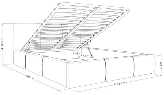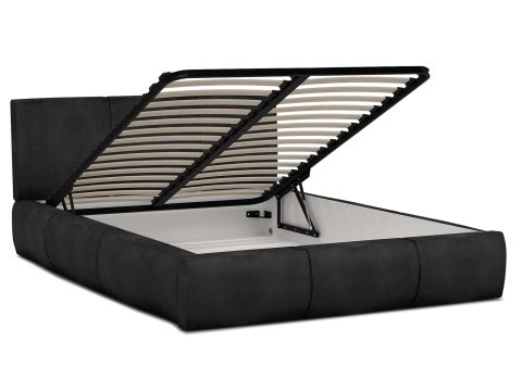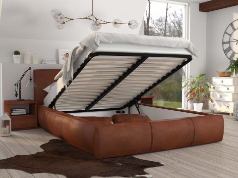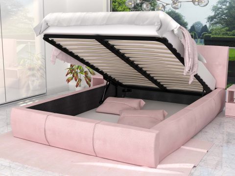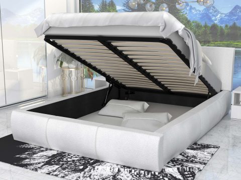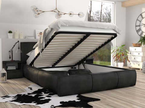Łóżko posiada podnoszoną ramę ze schowkiem na pościel, koce i inne tekstylia. To praktyczne rozwiązanie, które pozwala zaoszczędzić miejsce w szafach i zachować porządek w sypialni. System podnoszenia może być oparty na siłownikach gazowych (metalowy stelaż) lub mechanizmie sprężynowym (drewniany stelaż) – wybierz opcję najlepiej dopasowaną do swoich potrzeb.