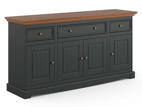 Niewątpliwym atutem prezentowanej dużej komody NISAN jest szeroka gama wybarwień korpusu i blatu do wyboru. Do wyboru są zarówno warianty klasyczne tj. mebel cały w bieli czy połączenie bieli z odcieniem dębu. Z pewnością zadowoli to fanów schludnej i klasycznej aranżacji. Ponadto wybarwienie grafitu to niekonwencjonalna propozycja dla nieco odważniejszych. Co więcej wykonanie mebla z litego drewna sosnowego daje gwarancję trwałości i odporności na uszkodzenia. Niewątpliwie oferowana komoda to mebel pojemny, a zatem praktyczny dający duże pole do organizacji. Zdecydowanie znakomicie odnajdzie się w każdym wnętrzu urządzanym w stylu klasycznym czy vintage. Ponadto cechą charakterystyczną mebla są również metalowe uchwyty w kolorze starego złota, które dodają charakteru. Dodatkowo dwie małe szuflady oraz jedna większa to z pewnością wystarczająco przestrzeni na przechowywanie drobnych akcesoriów czy dokumentów. Ponadto w połączeniu z czterema dużymi przestrzeniami zamkniętymi z półkami tworzy praktyczny mebel prezentujący się we wnętrzu wyjątkowo gustownie.