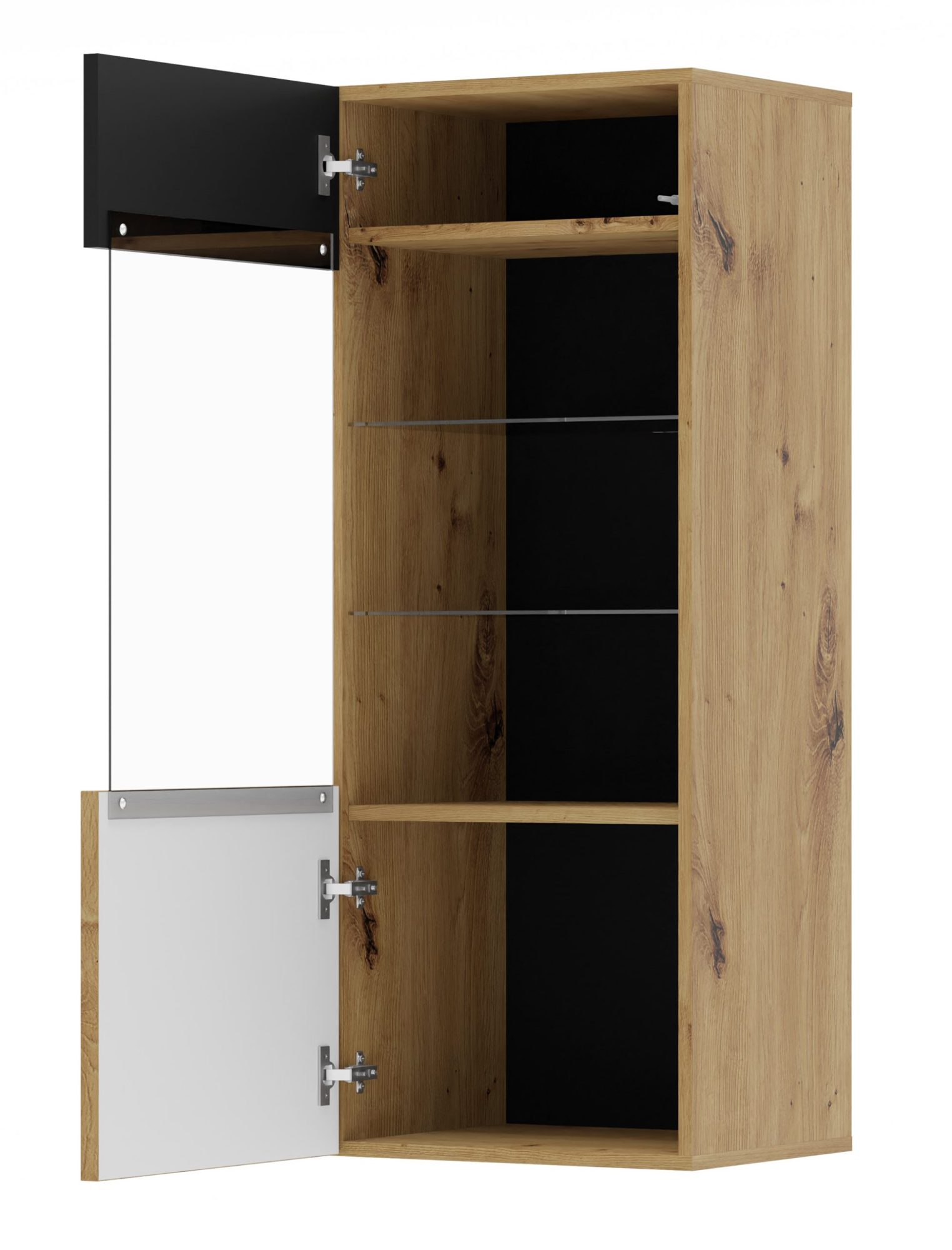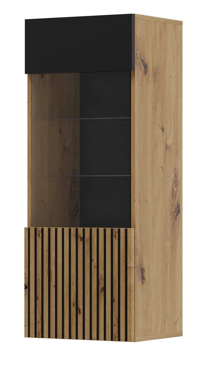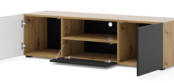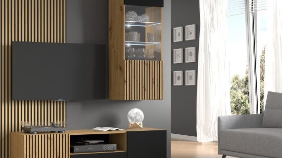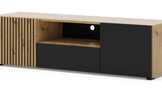 Zestaw Mebli Merve A Nowoczesny z Lamelowanymi Frontami to propozycja dla osób, które pragną wprowadzić do swojego wnętrza nowoczesny design i elegancję. Ten przemyślany zestaw składa się z szafki RTV oraz witryny, które razem tworzą funkcjonalne i stylowe rozwiązanie do salonu. Dzięki połączeniu kolorów dąb artisan i czarnego matu, Zestaw Merve A wprowadza ciepło i przytulność, a jednocześnie nadaje przestrzeni nowoczesny akcent. Lamelowane fronty dodają unikatowego charakteru, który z pewnością przyciągnie uwagę.