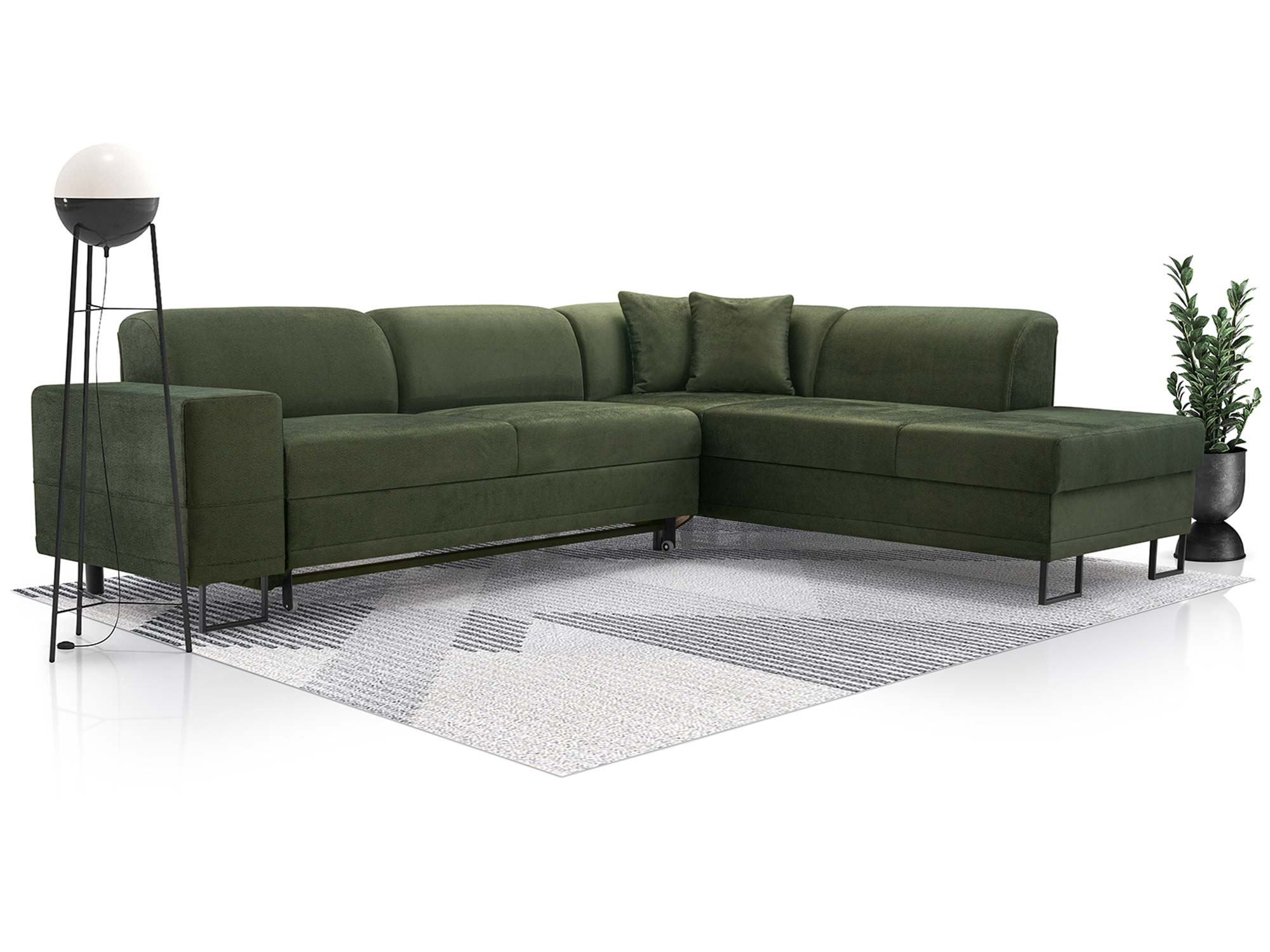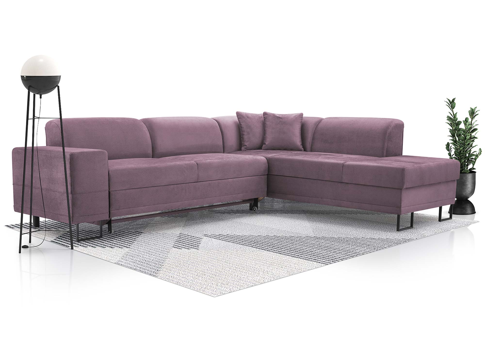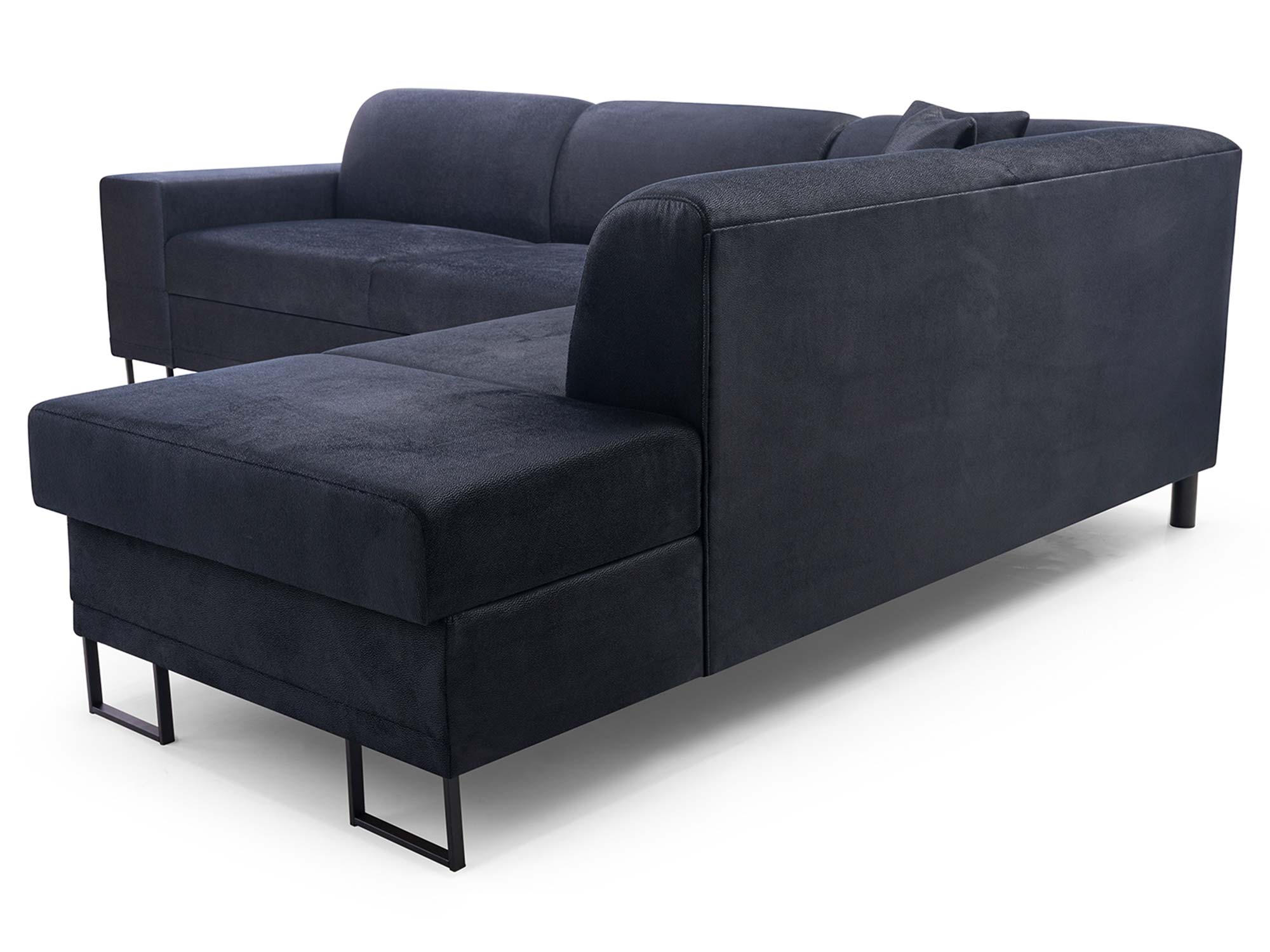 - Detale – czarne metalowe nóżki i ozdobne poduszki.