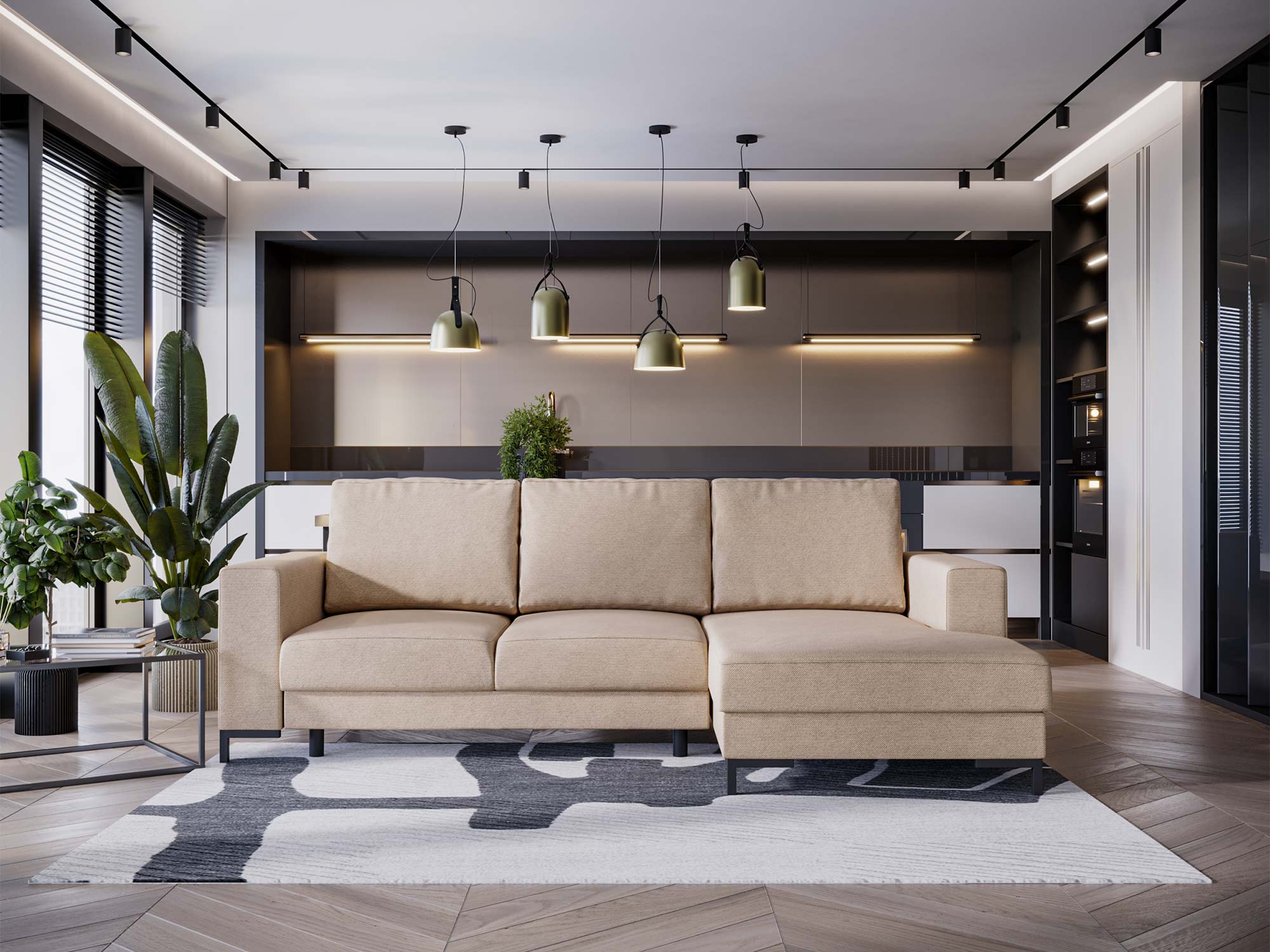 Beżowy narożnik w aranżacji salonu z nowoczesnym oświetleniem