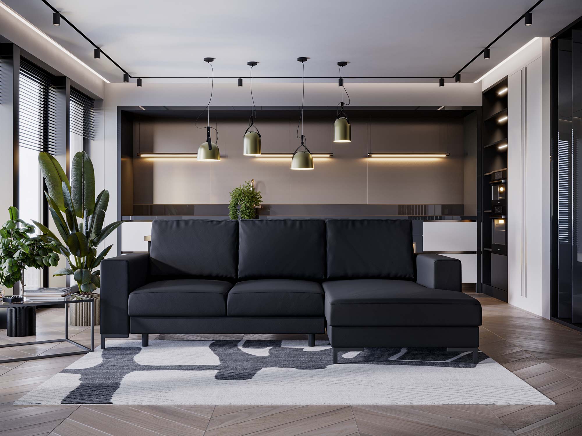 Salon z czarnym narożnikiem i nowoczesnymi lampami