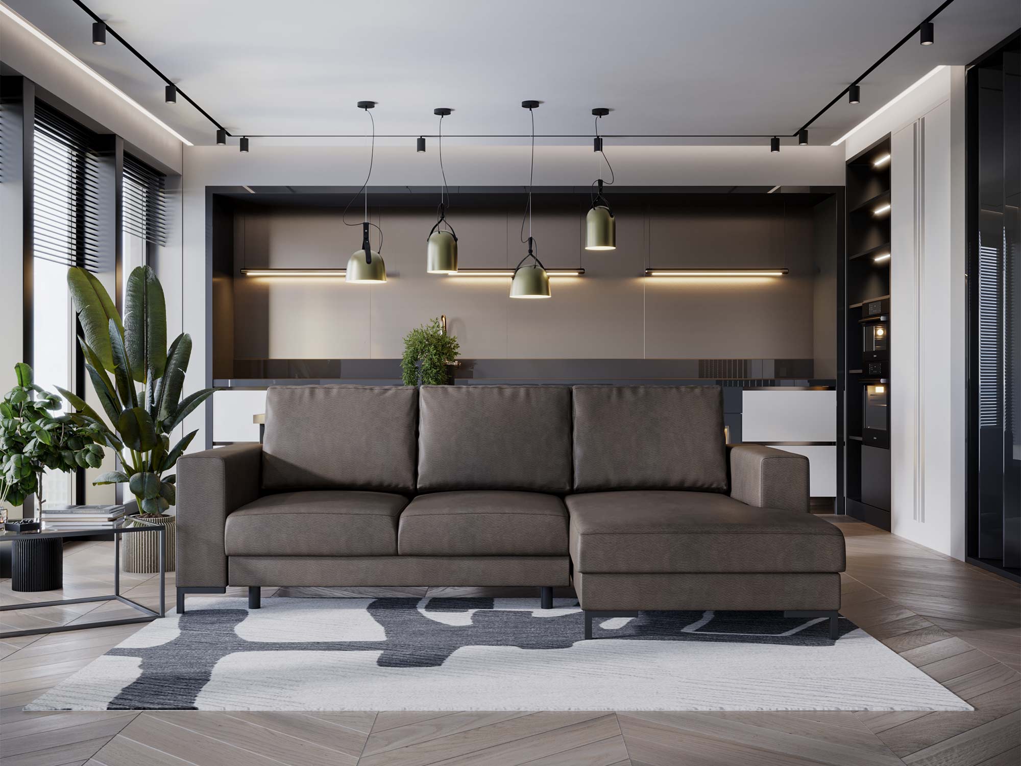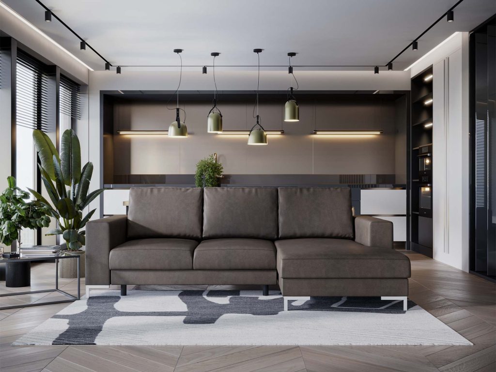 Aranżacja salonu z narożnikiem brązowym i nowoczesnym oświetleniem