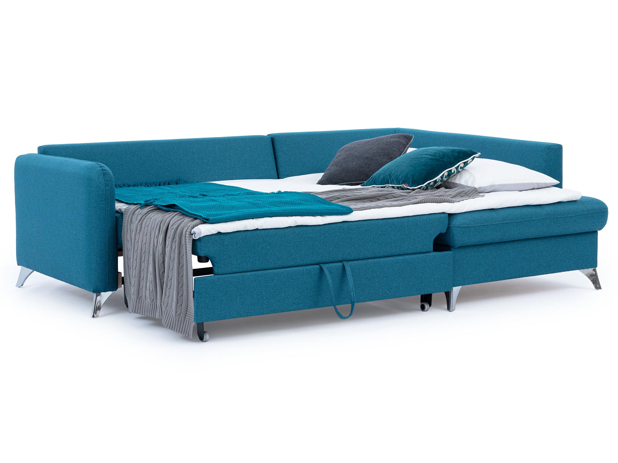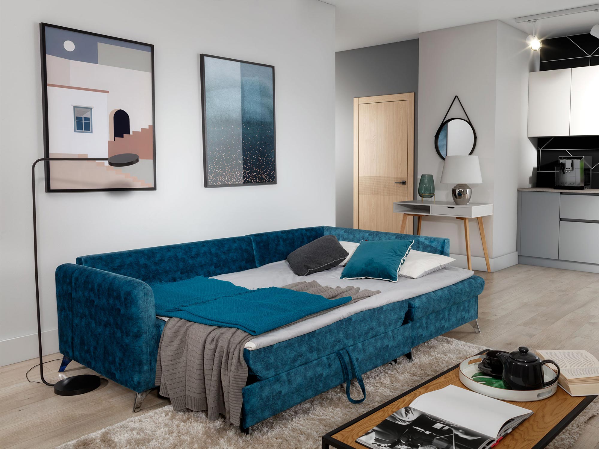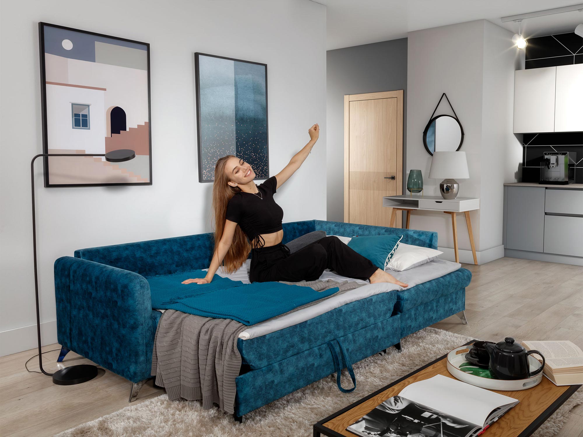 • Funkcja spania – Narożnik Lazona posiada funkcję spania, co czyni go praktycznym wyborem do każdego salonu. Powierzchnia spania o wymiarach 191×138 cm zapewnia wygodne miejsce dla gości, a mechanizm typu delfin pozwala na szybkie i łatwe rozłożenie narożnika.