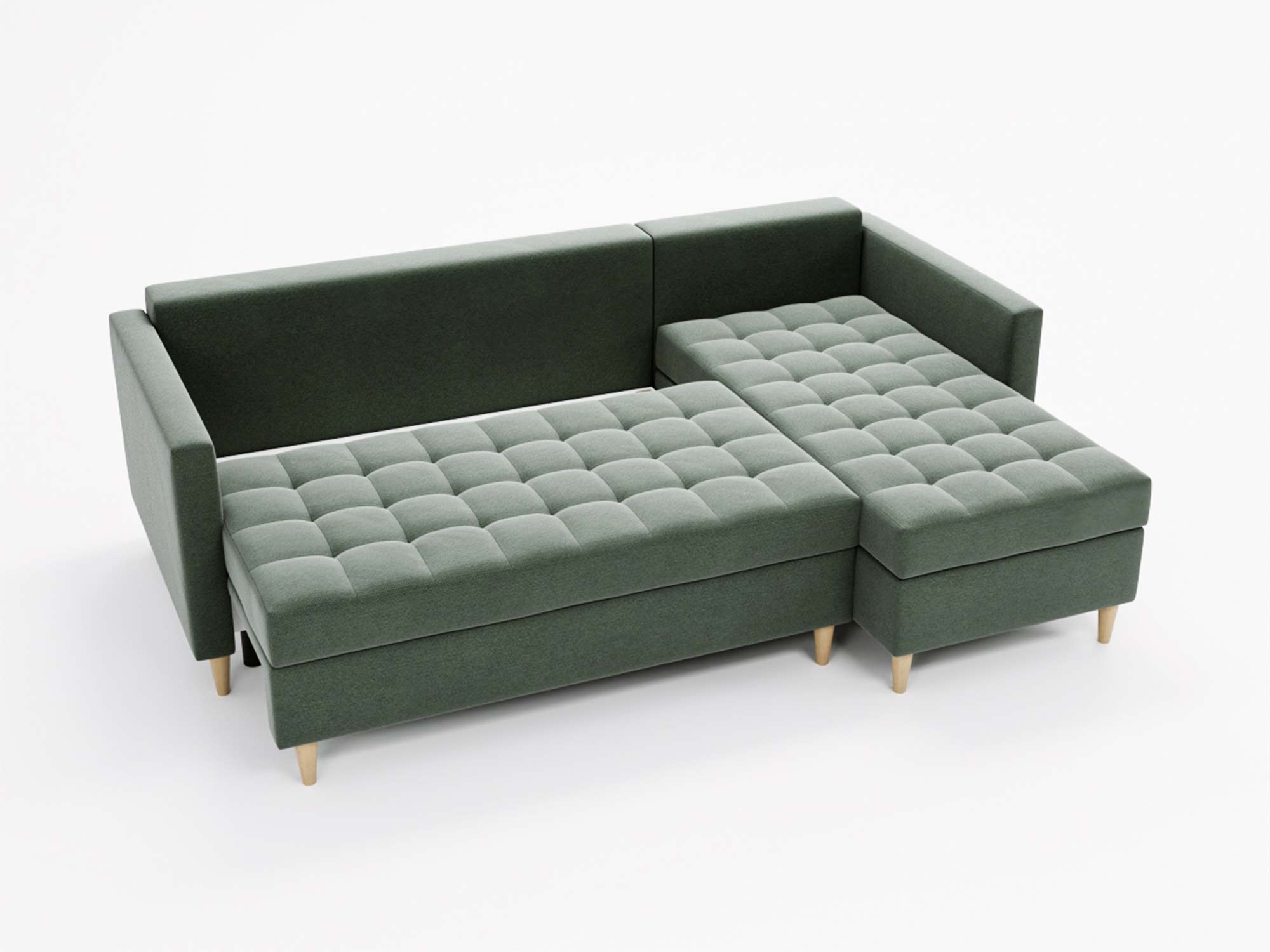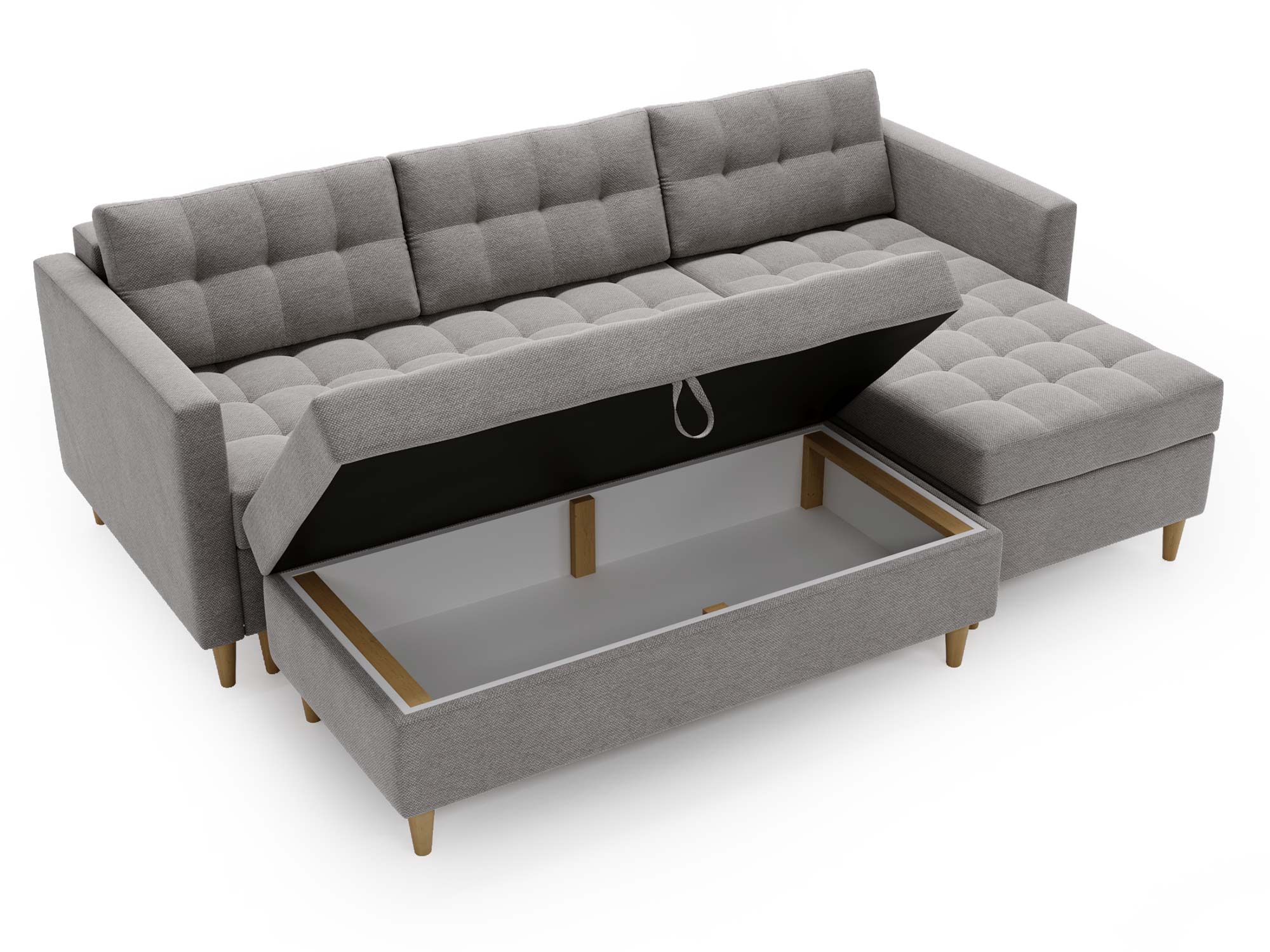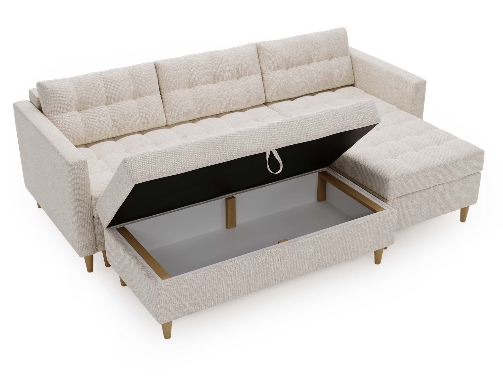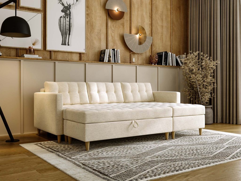- Wbudowana skrzynka w pufie umożliwia przechowywanie pościeli i innych drobiazgów.