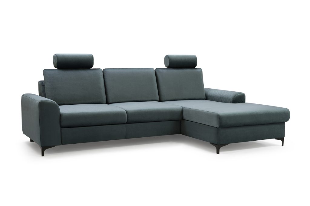 Nowoczesny narożnik SELEN + Zagłówek  to nowoczesny i funkcjonalny mebel z przyciągającą oko pikowaną tkaniną na wygodnych, wyprofilowanych bokach. Czarna metalowa nóżka dodaje lekkości i eleganckiego stylu. Narożnik jest bardzo funkcjonalny dzięki wbudowanej funkcji spania oraz pojemnikowi na pościel. Bogaty wybór tkanin obiciowych zapewnia możliwość wyboru kolorystyki, która dopasuje się do większości wnętrz.