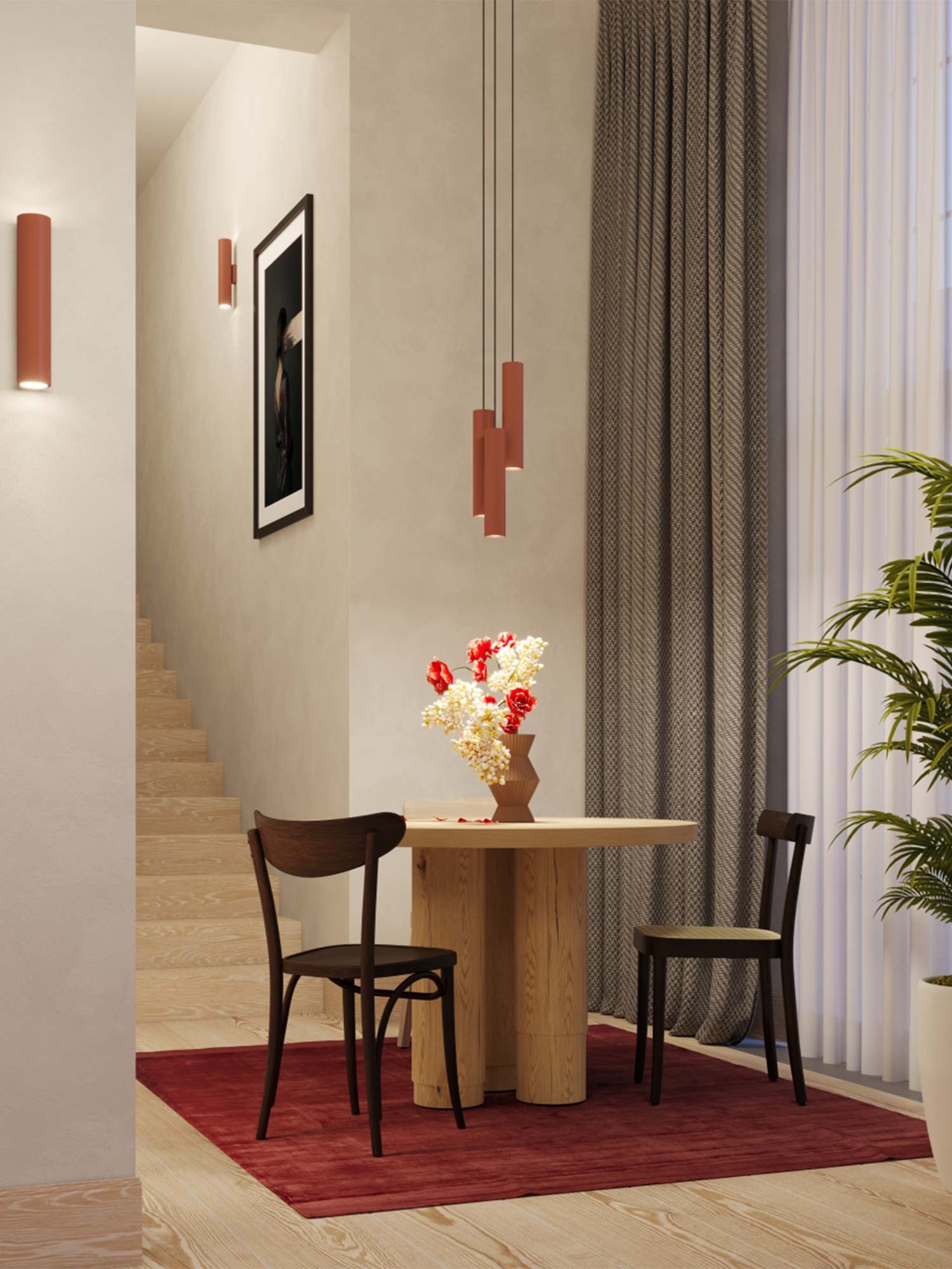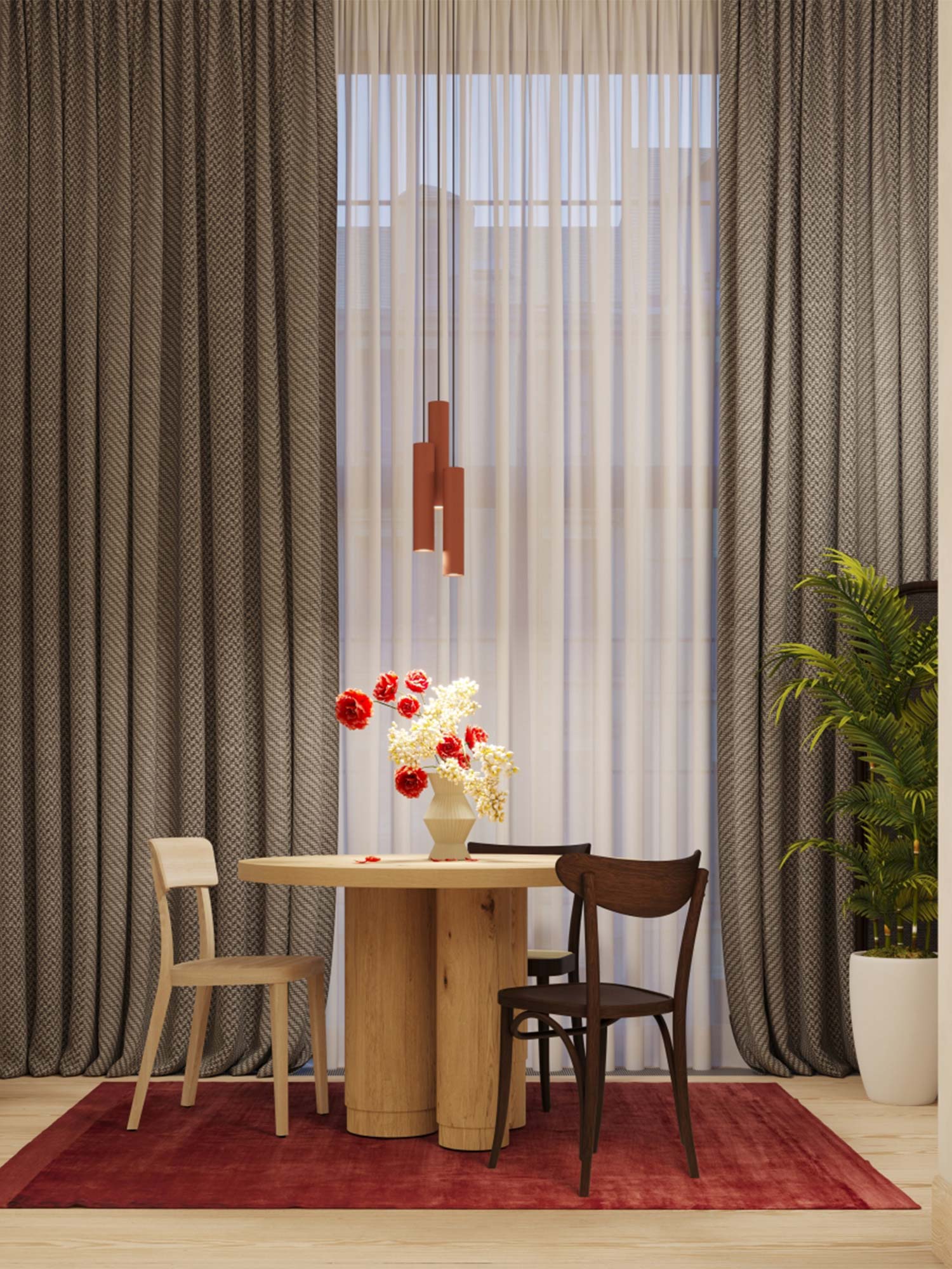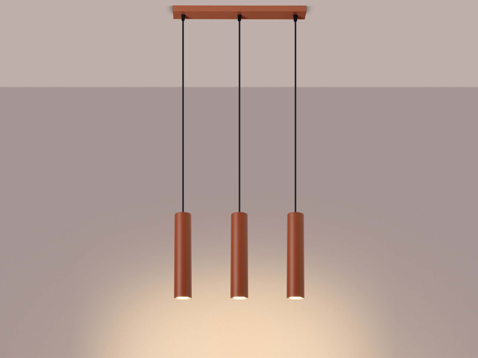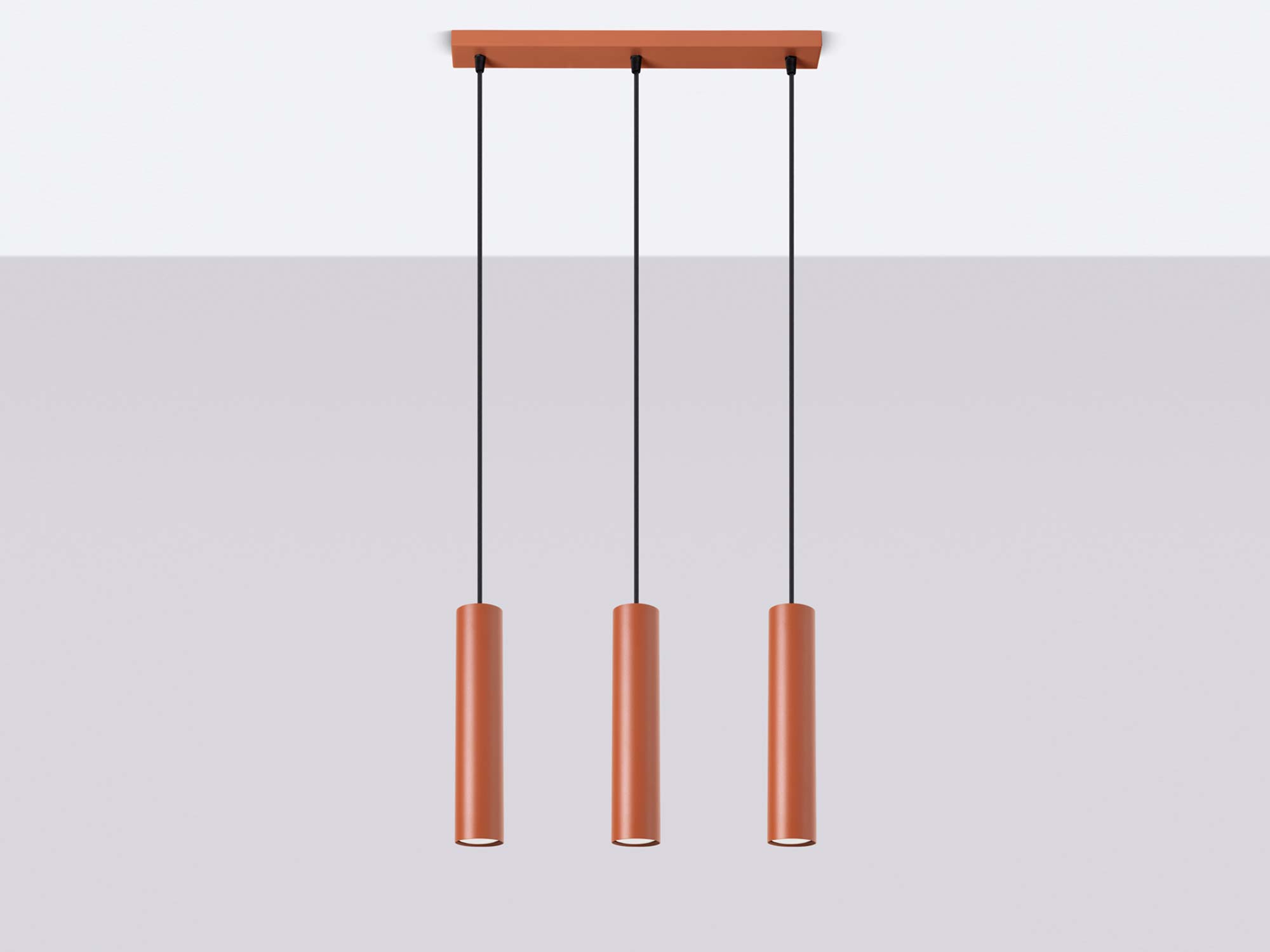 Nowoczesne wnętrza kochają proste formy i nietuzinkowe akcenty. Lampa NOVEL 3L w kolorze ochry czerwonej łączy oba te elementy. Trzy smukłe klosze (6/30 cm) zawieszone na podsufitce o długości 45 cm tworzą kompozycję, która równocześnie zdobi i oświetla przestrzeń. Z jednej strony – prostota i minimalizm, z drugiej – śmiały kolor, który przyciąga wzrok i dodaje charakteru.