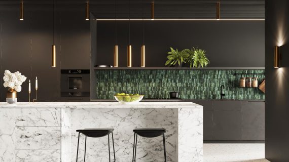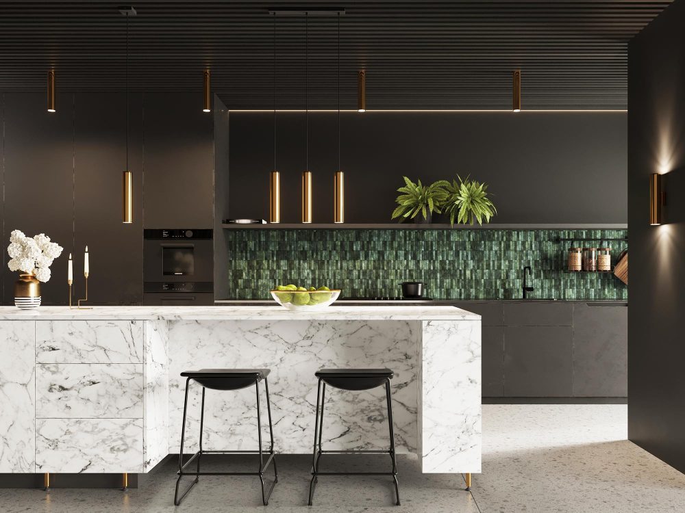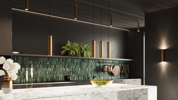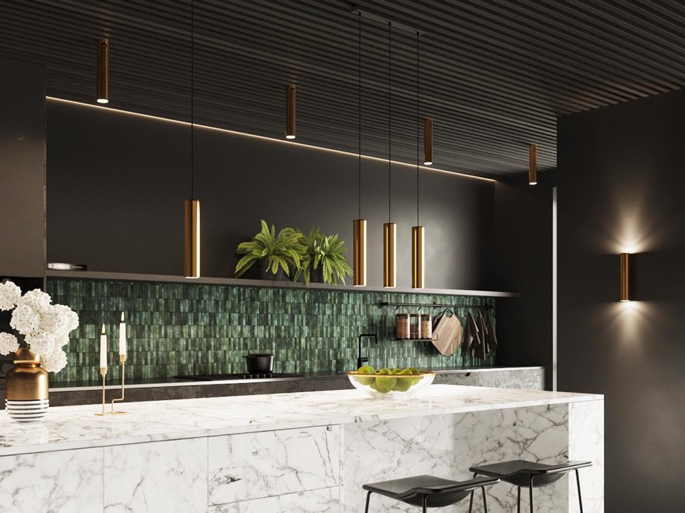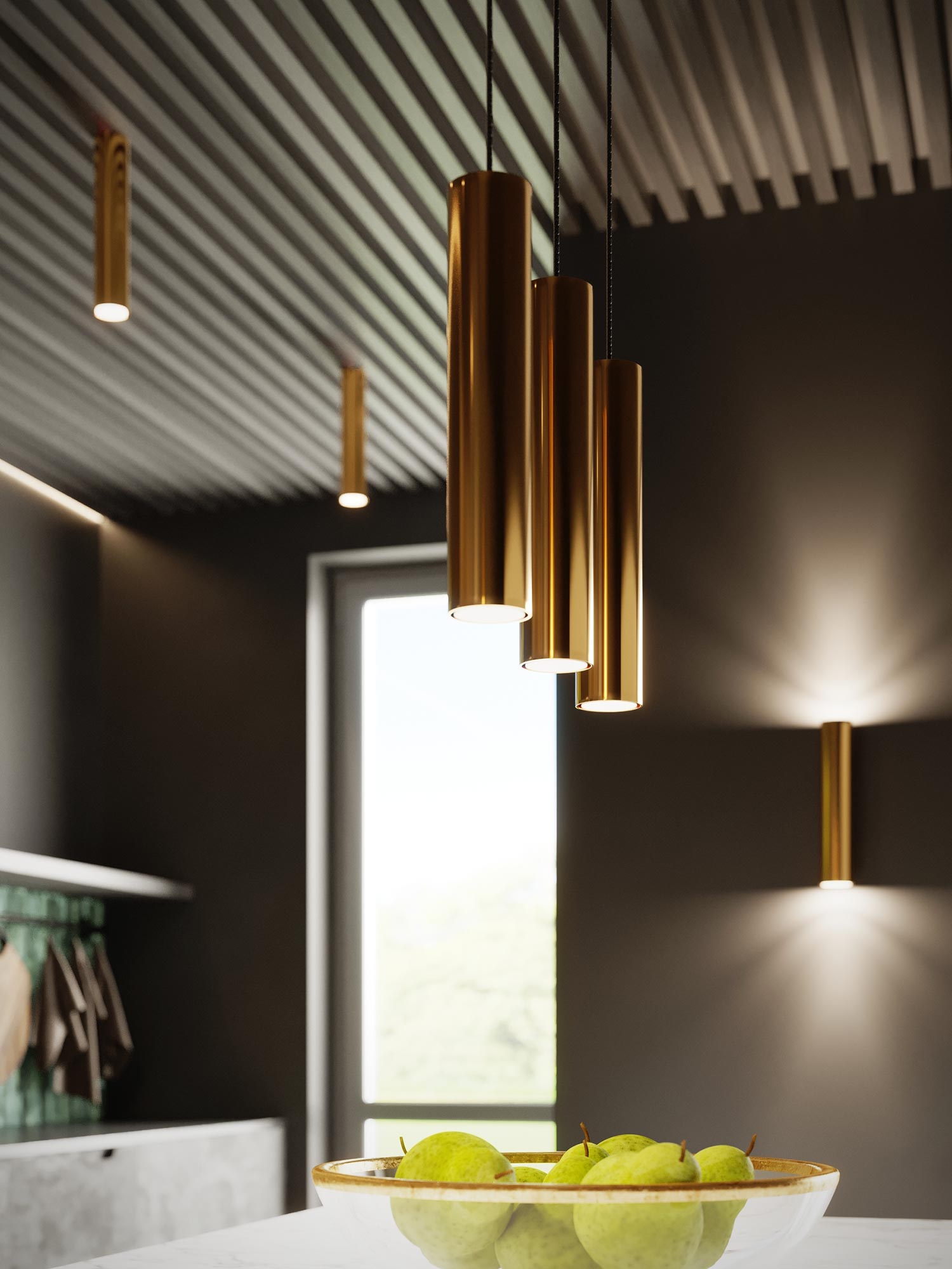 Z praktycznie każdym wykończeniem – beton, drewno, kamień, aksamitne zasłony, naturalne tkaniny. Złoto w połysku zawsze znajdzie swoje miejsce.