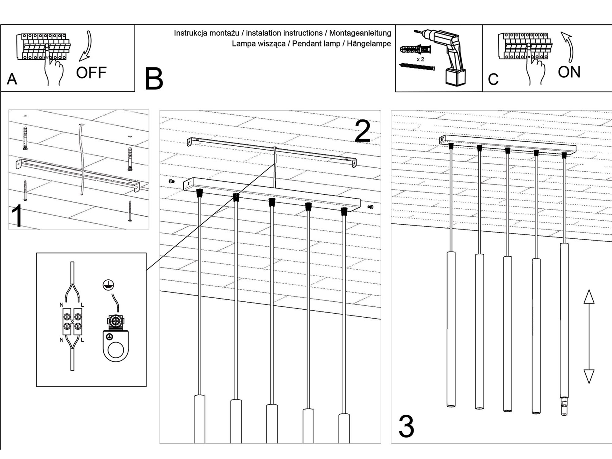- Źródło światła: Wyposażona w pięć gniazd typu G9, przeznaczona dla żarówek LED o maksymalnej mocy 8W każda, ~230V, 50Hz, IP20, klasa ochronności I.