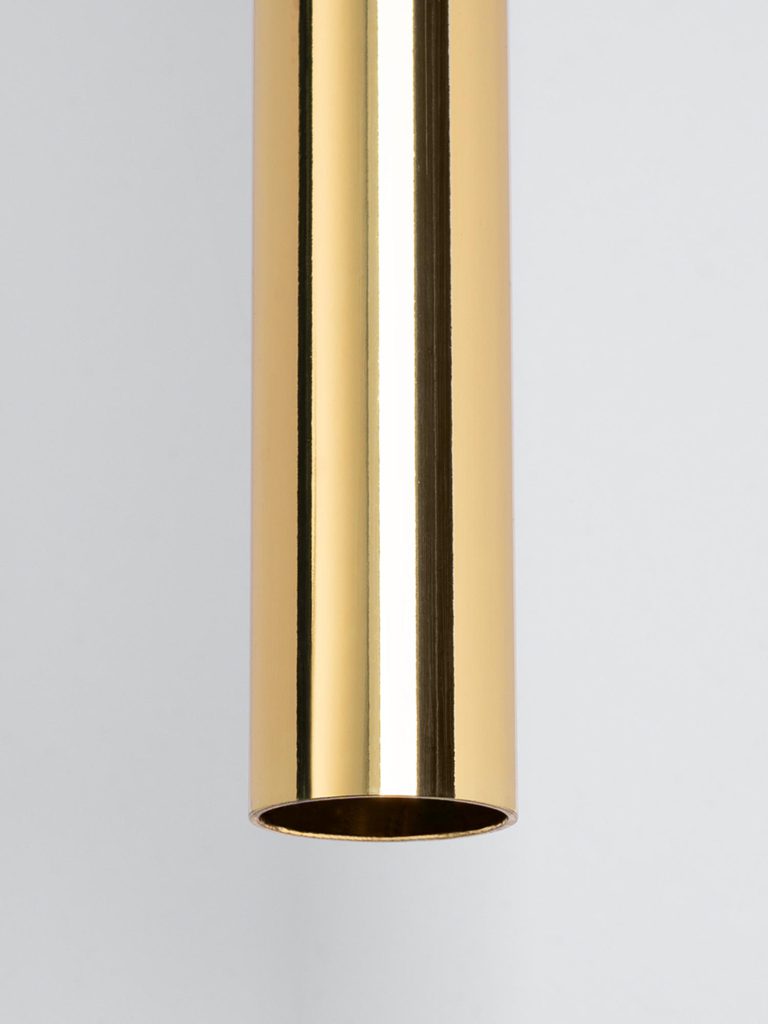 Lampa wisząca tubowa – złota tuba na tle szarości