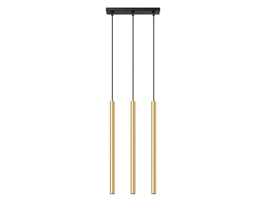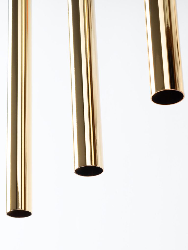 Zbliżenie na trzy złote lampy tubowe – połysk i detale wykończenia