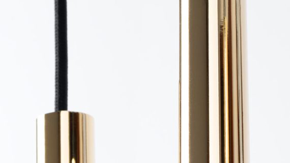 Zbliżenie na złotą lampę – połyskująca tuba z czarnym przewodem