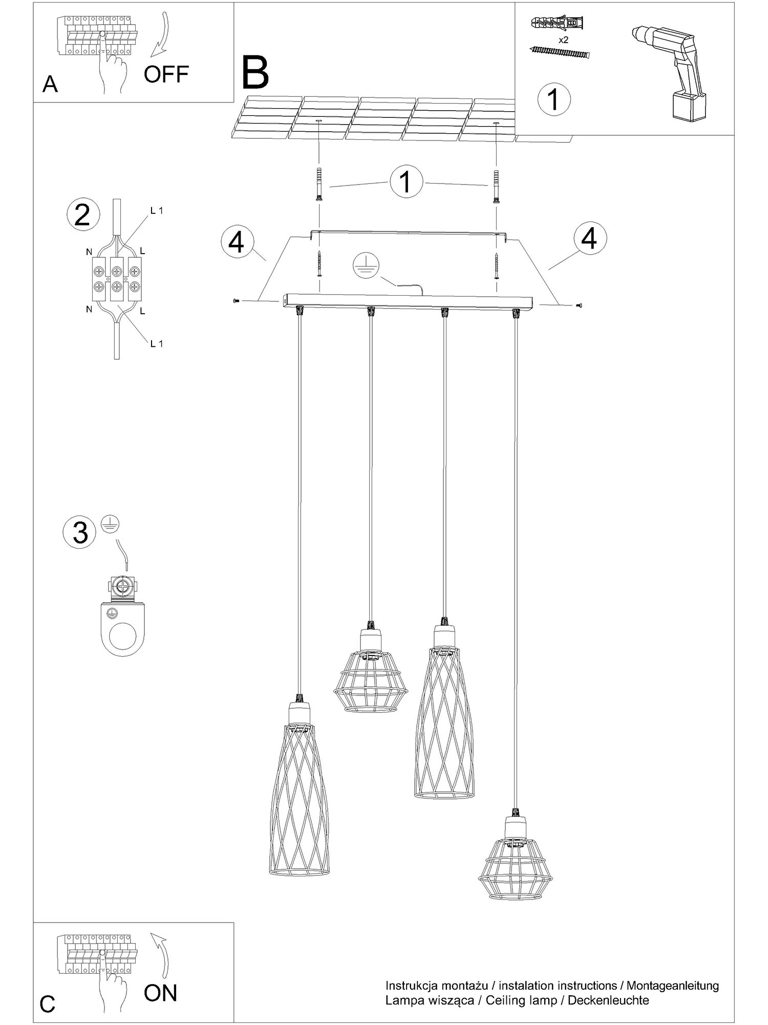 Źródło światła: E27, 4x max 15 W LED, ~230V, 50Hz, IP20, klasa ochronności I