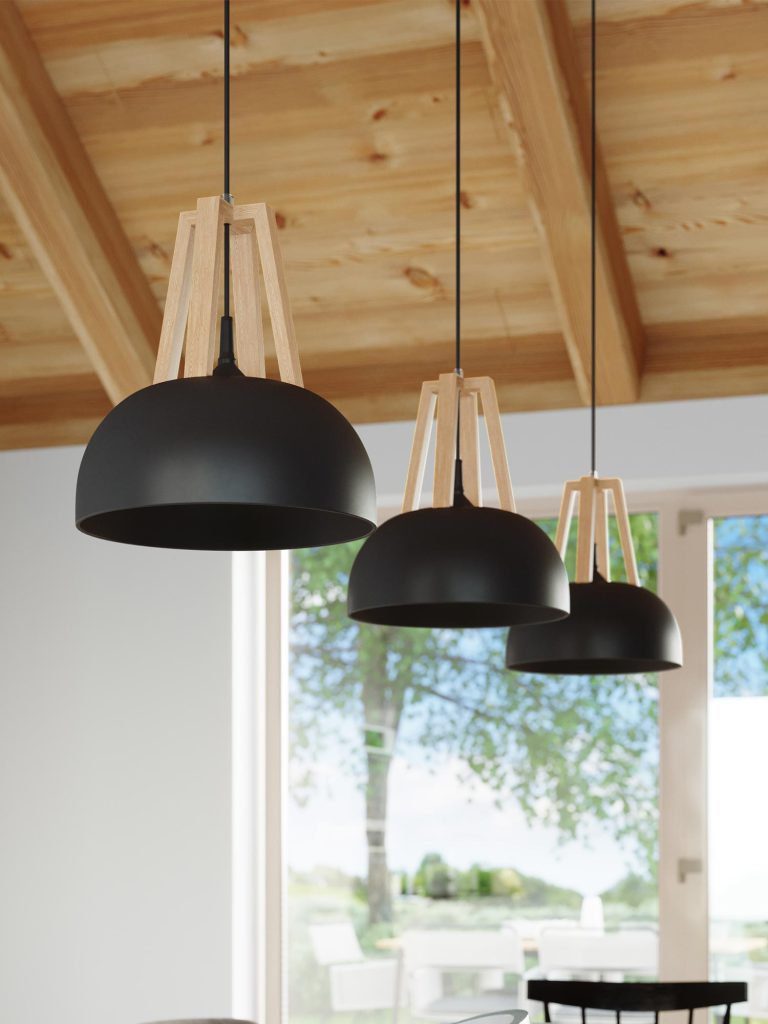 Trzy czarne lampy wiszące – aranżacja jadalni z drewnianym sufitem