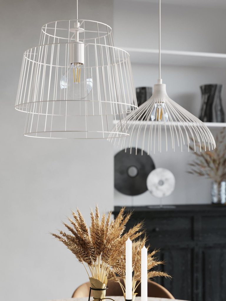 Jedna oprawa – wiele scen. Dzięki standardowemu gwintowi E27 dobierasz żarówkę do nastroju i funkcji: ciepłe 2700K na spokojne wieczory, neutralne 3000–4000K do pracy i gotowania. Maksymalna moc 60 W (rekomendowane LED 6–12 W) zapewnia zapas jasności, a otwarta geometria klosza daje równomierny rozsył – bez efektu „plamy” pod lampą i mrocznych zakamarków na obrzeżach stołu.
