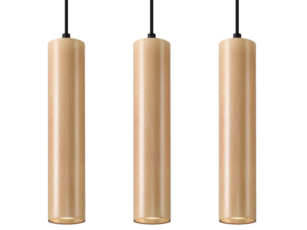 Klosze w formie smukłych tub z naturalnego drewna ograniczają olśnienie – światło nie „bije” po oczach, tylko elegancko opada na blat. Dzięki temu strefa stołu czy wyspy staje się centrum domowego życia: rozmawiacie, jecie, pracujecie, a światło subtelnie towarzyszy każdej aktywności. Potrójny układ opraw zapewnia równomierny rozsył i piękną, powtarzalną rytmikę – to biżuteria dla wnętrza, która nie przytłacza, lecz nadaje ton.