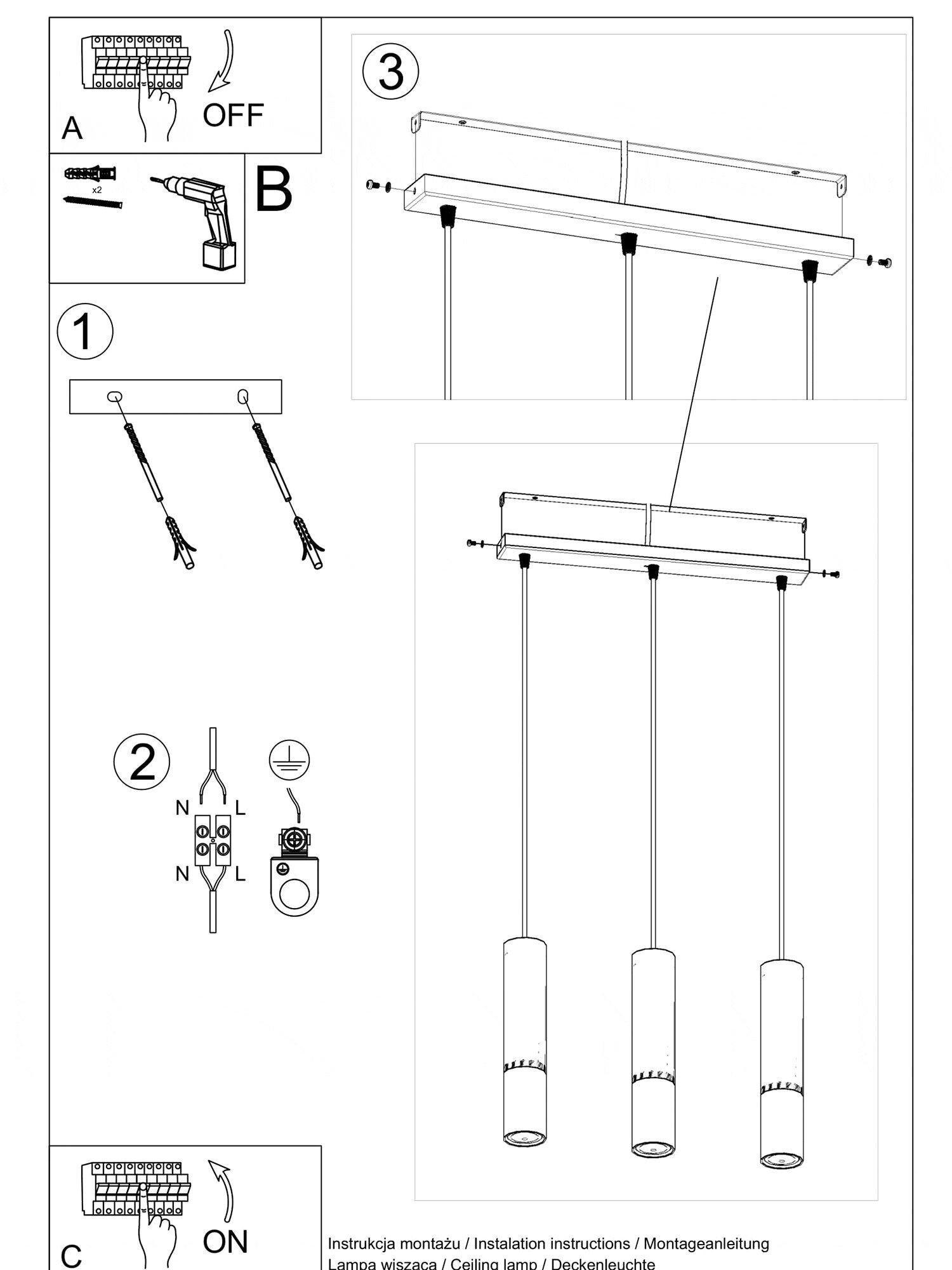 Źródło światła: GU10, 3x40W, 3x12W LED, 50-60Hz, ~220-230V, IP20, klasa ochronności I