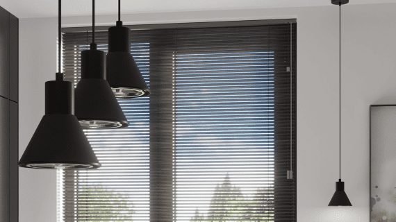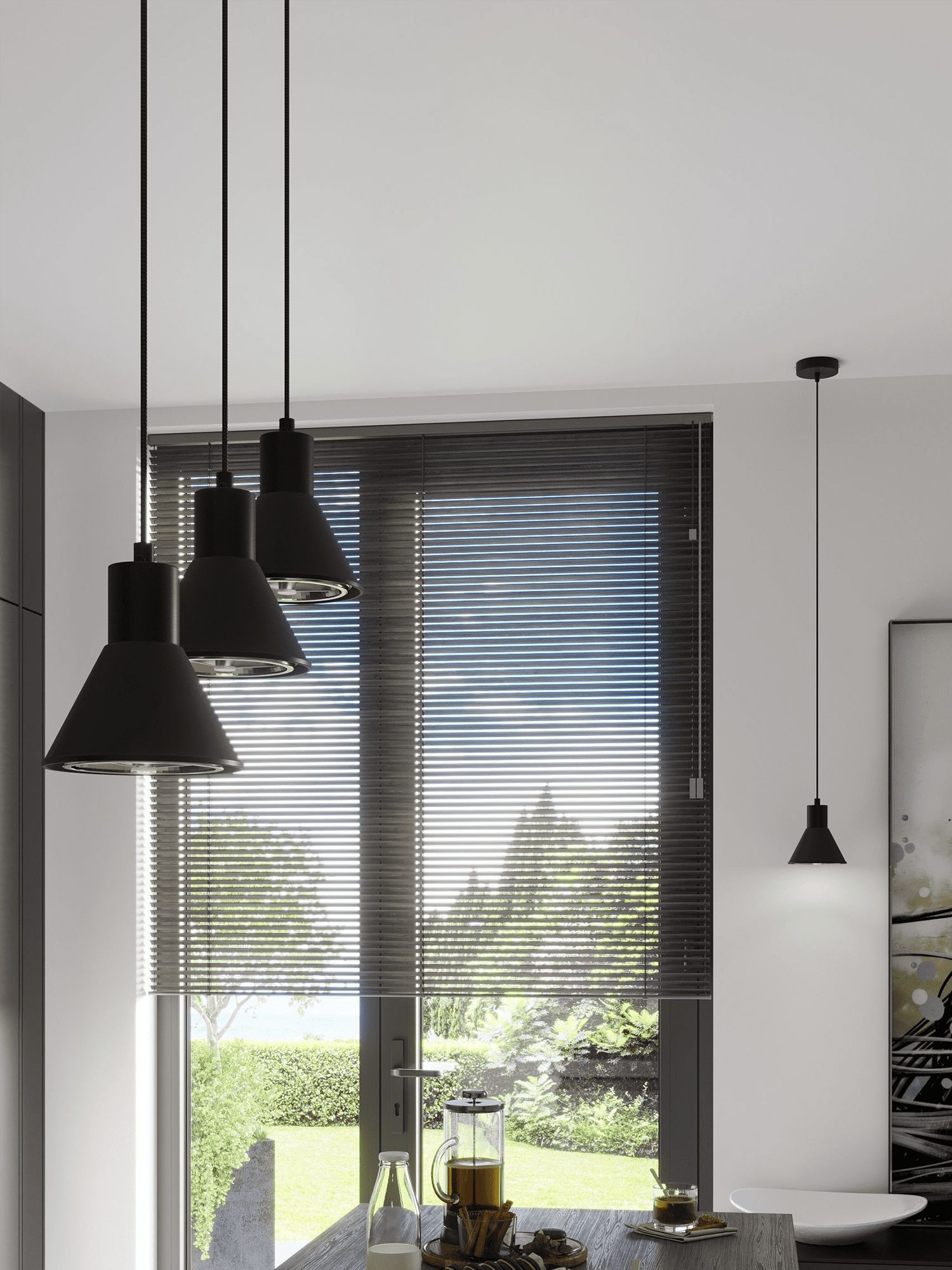 Kuchnia z trzema czarnymi lampami – widok na okno z roletą