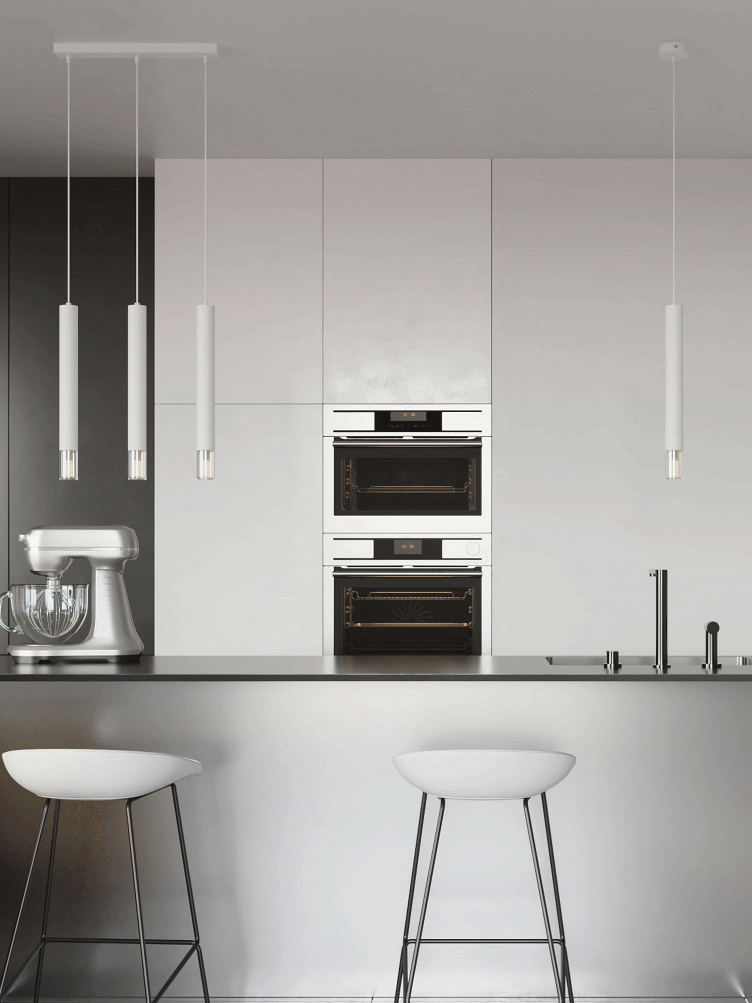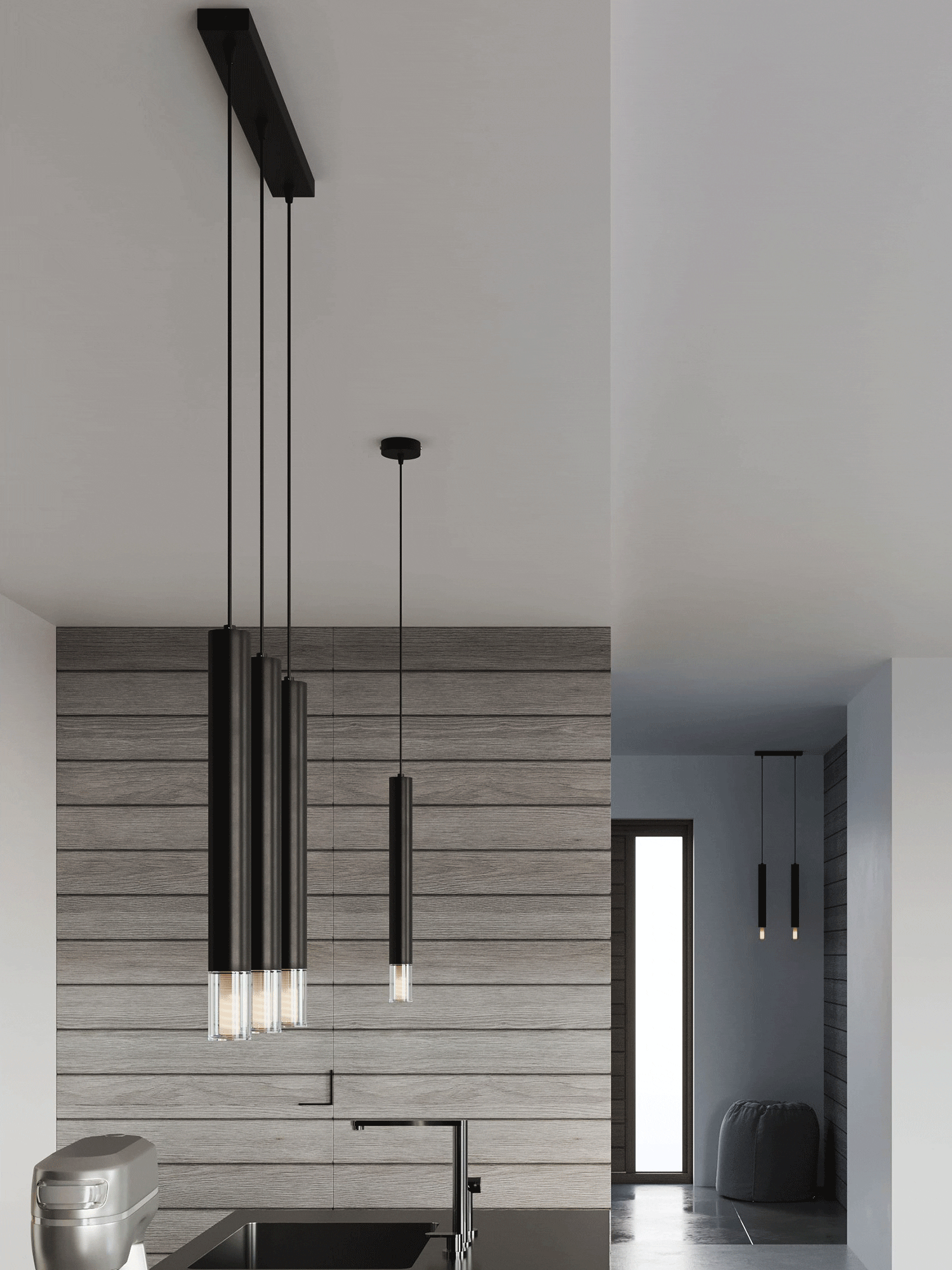 Prosta forma o średnicy ok. 8 cm i wysokości do 120 cm nadaje lampie lekkość i pozwala zestawiać ją w pary lub tryptyki. Jedna sztuka wyznaczy punkt centralny nad stolikiem pomocniczym; dwie lub trzy zawieszone liniowo zbudują rytm nad wyspą kuchenną. To światło, które porządkuje kompozycję, a jednocześnie pozostaje dyskretne i wyrafinowane.
