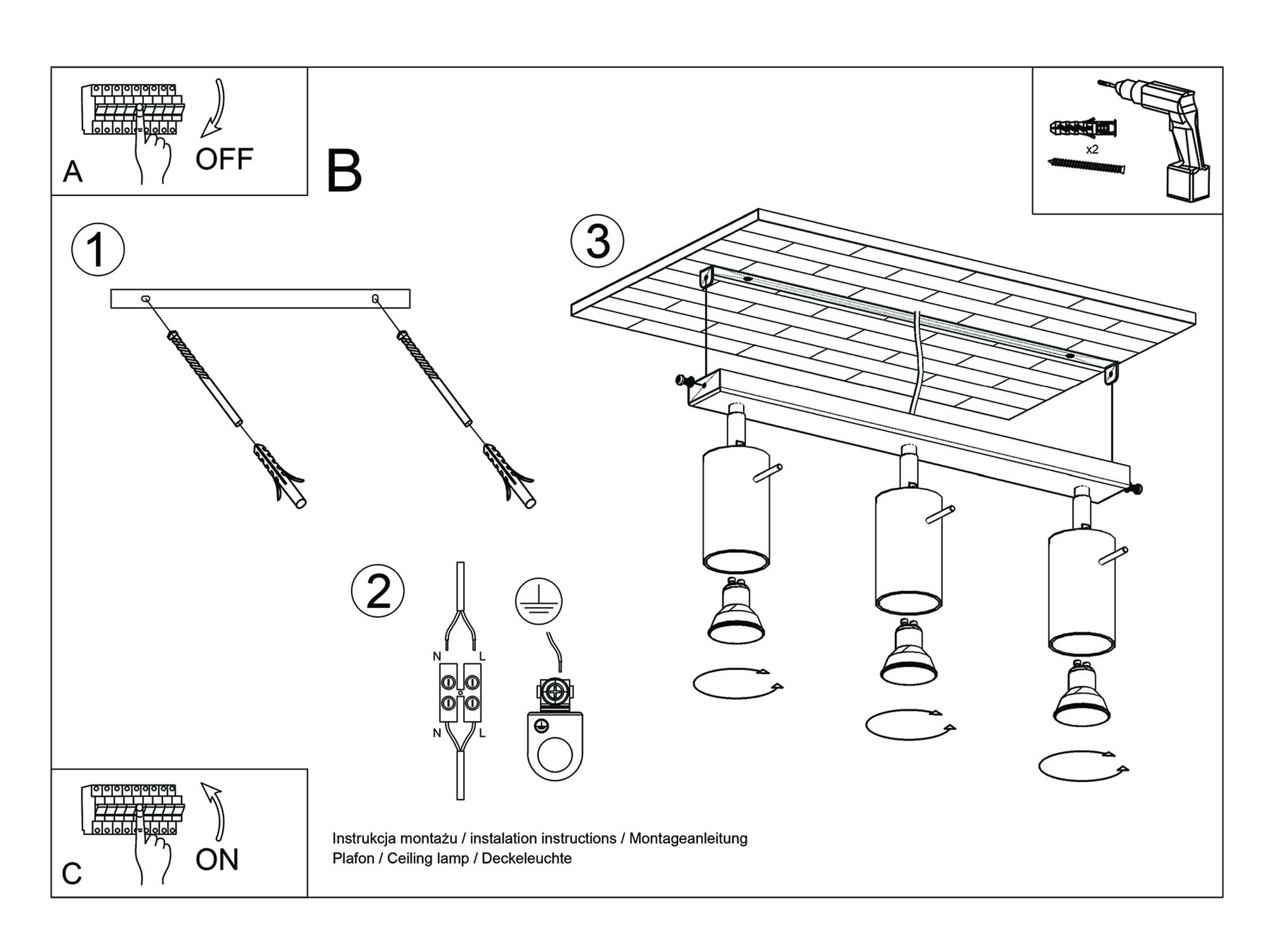Źródło światła: GU10, 3x max 10W LED, ~230V, 50Hz, IP20, klasa ochronności I